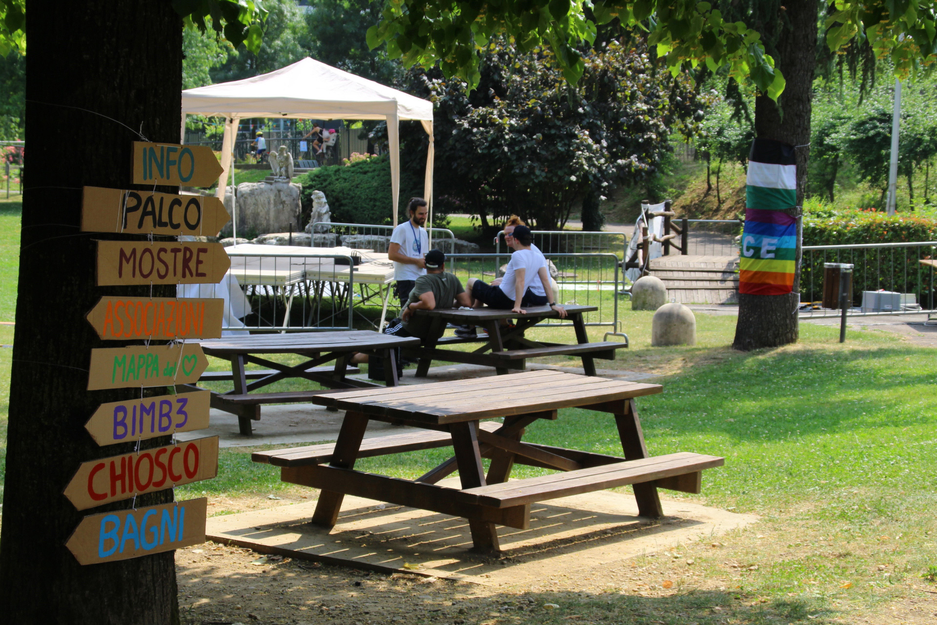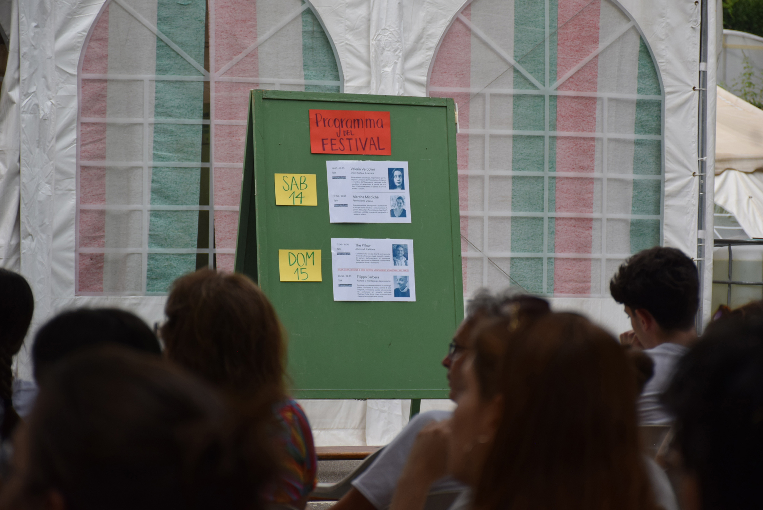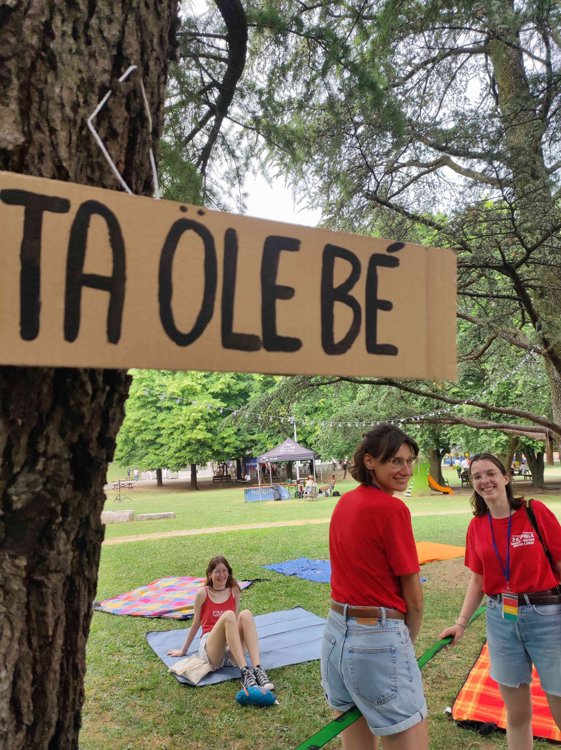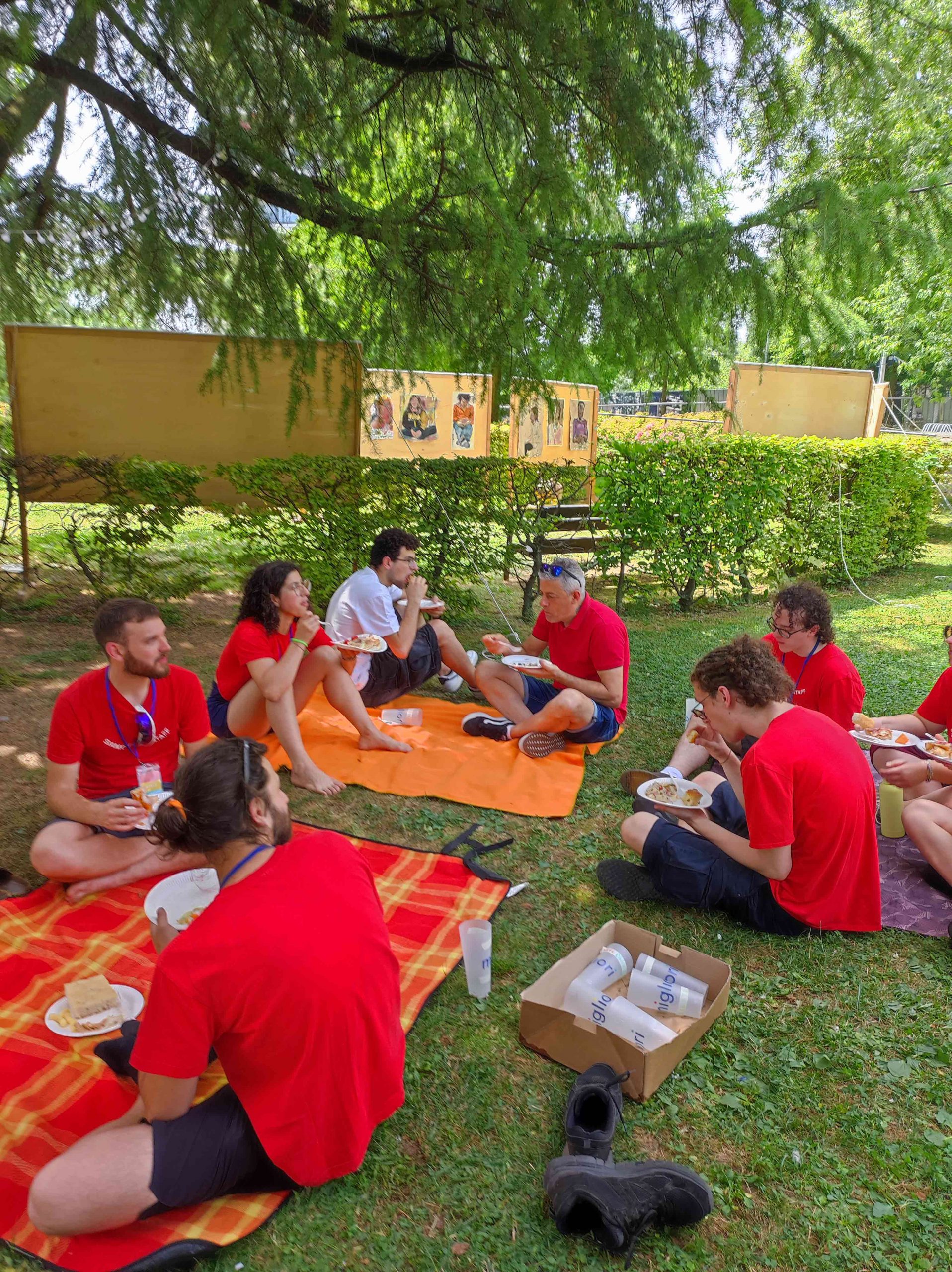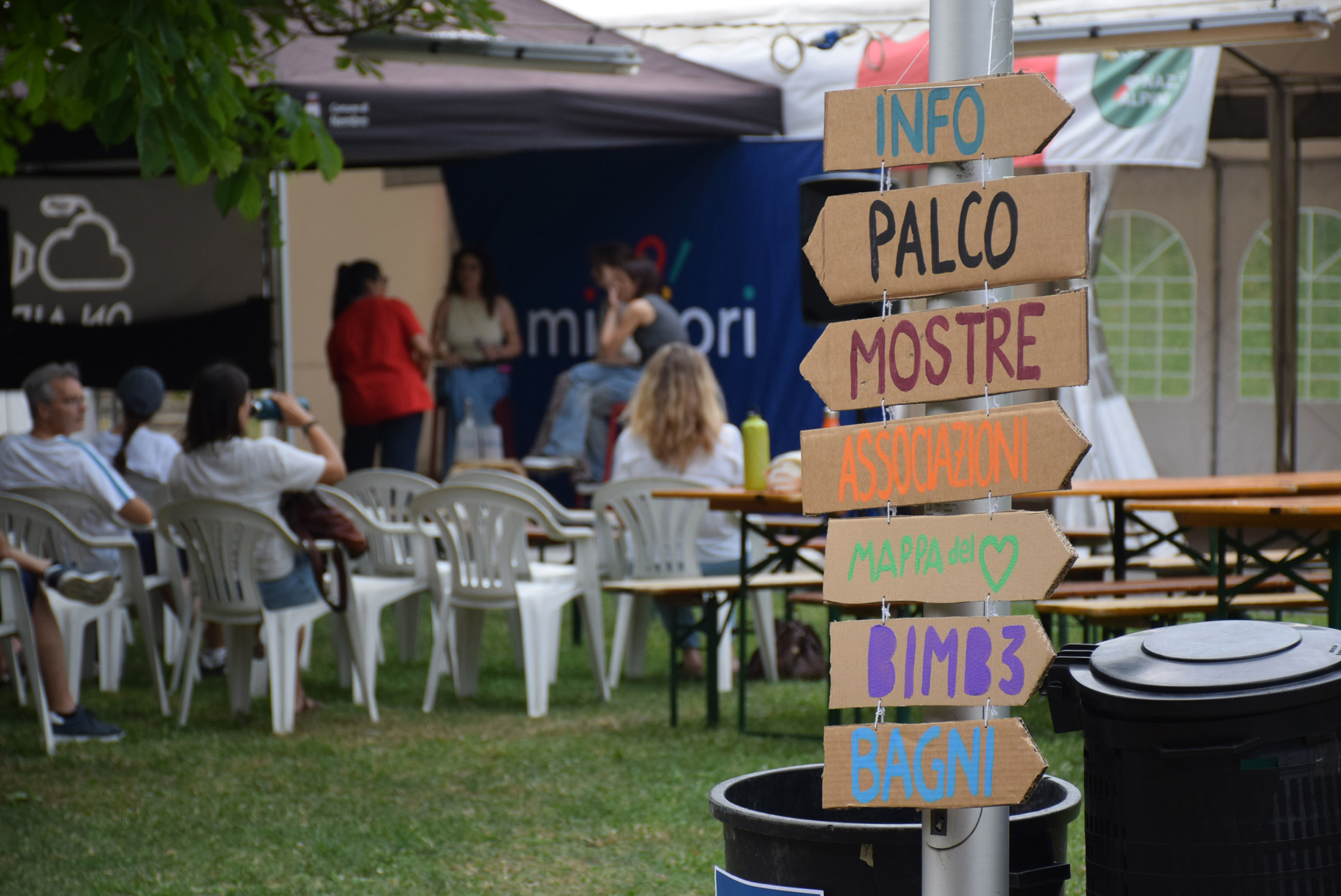Dopo ore sfiancanti di montaggio, il parco è pronto ad accogliere giovani, famiglie e cittadinɜ che vogliono immergersi in questo spazio vivo e vivace: all'ingresso non può che esserci il gazebo blu; appesi tutto intorno si notano cartelli per arrivare ad ogni dove; tesi tra gli alberi sventolano festoni artigianali; tra il verde risaltano striscioni con inni di libertà. Così si apre il Festival! Vengono inaugurate la rassegna di ritratti dal titolo “Personale e collettivo” di Francesca Pelliccioli, e la mostra fotografica di Gaia Orlando, intitolata “Cosa vedi all’orizzonte”. Le loro opere sbucano tra le siepi del parco, dove la gente inizia a passeggiare e osservare. La Mappa del Cuore, dove lɜ visitatorɜ del parco possono indicare i luoghi in cui si sentono più felici e dove trascorrono il loro tempo con persone care, comincia a riempirsi di tanti piccoli adesivi tondi e colorati. Dietro le quinte (ma neanche troppo) tante apette in maglietta rossa si muovono frenetiche per risolvere in fretta ogni piccolo impiccio...