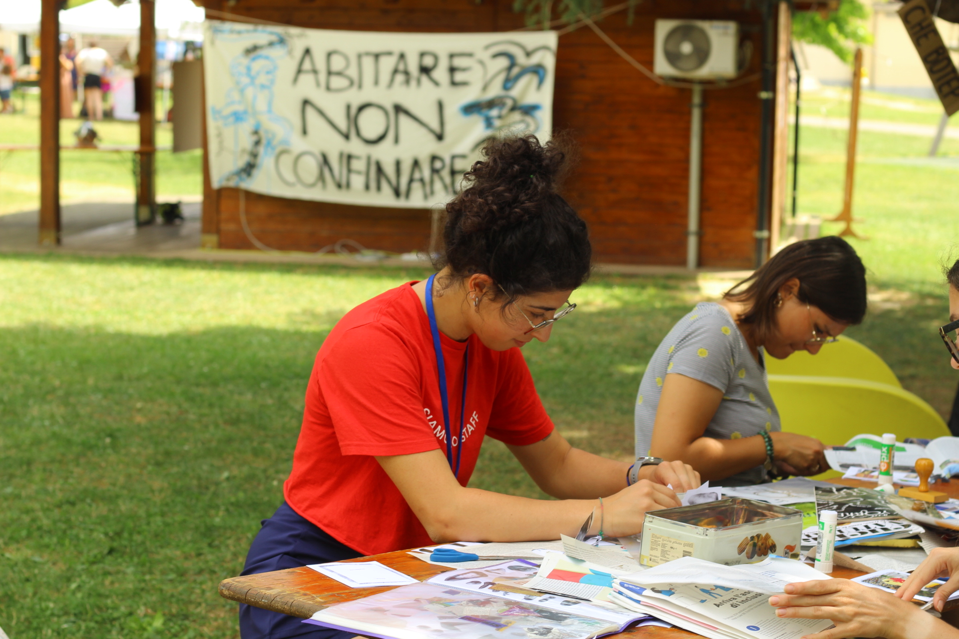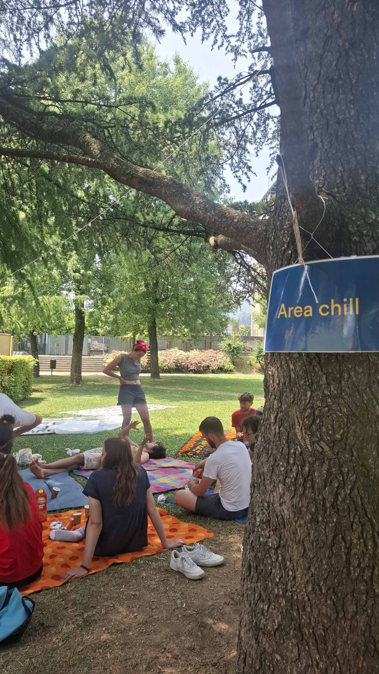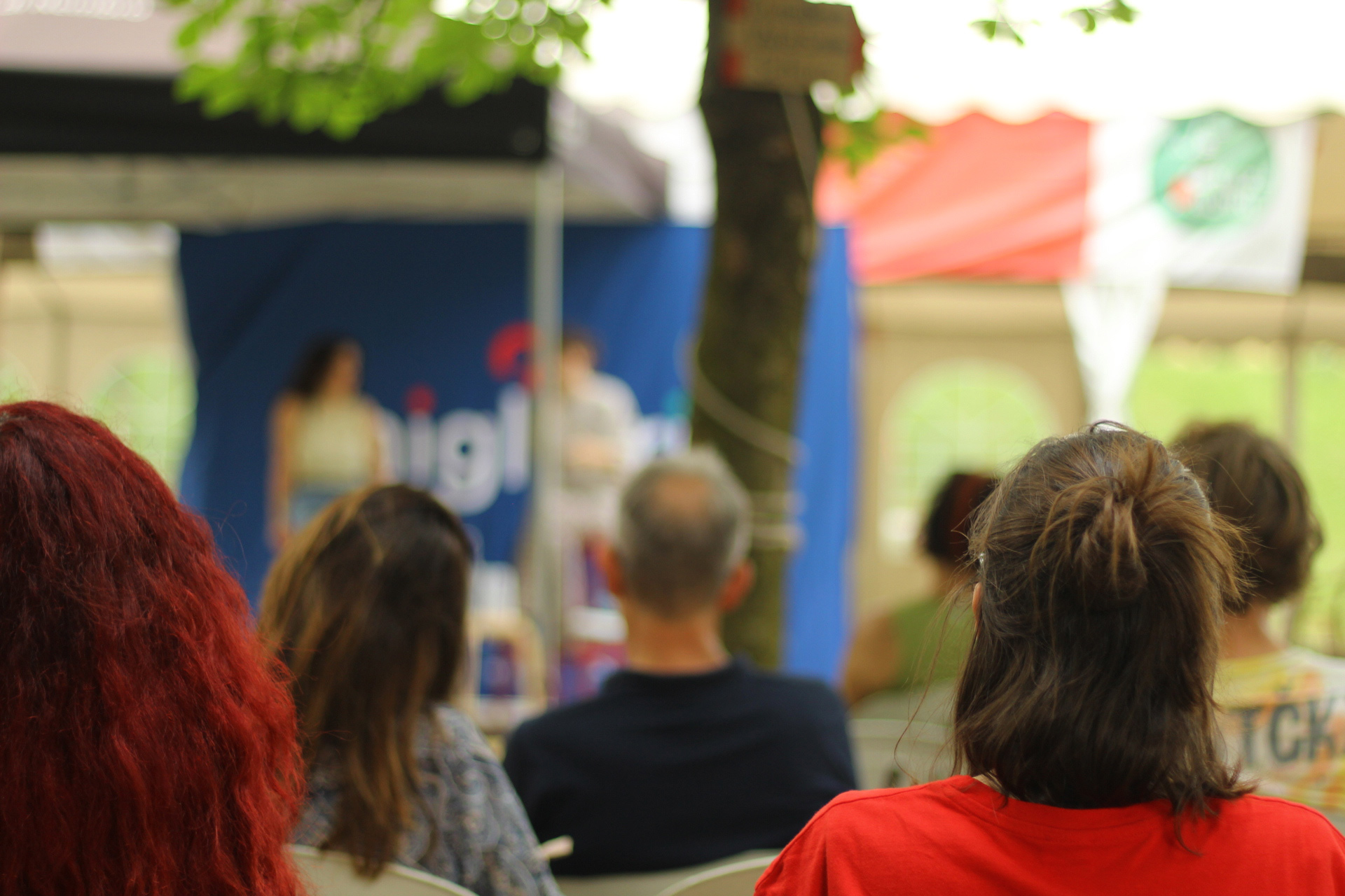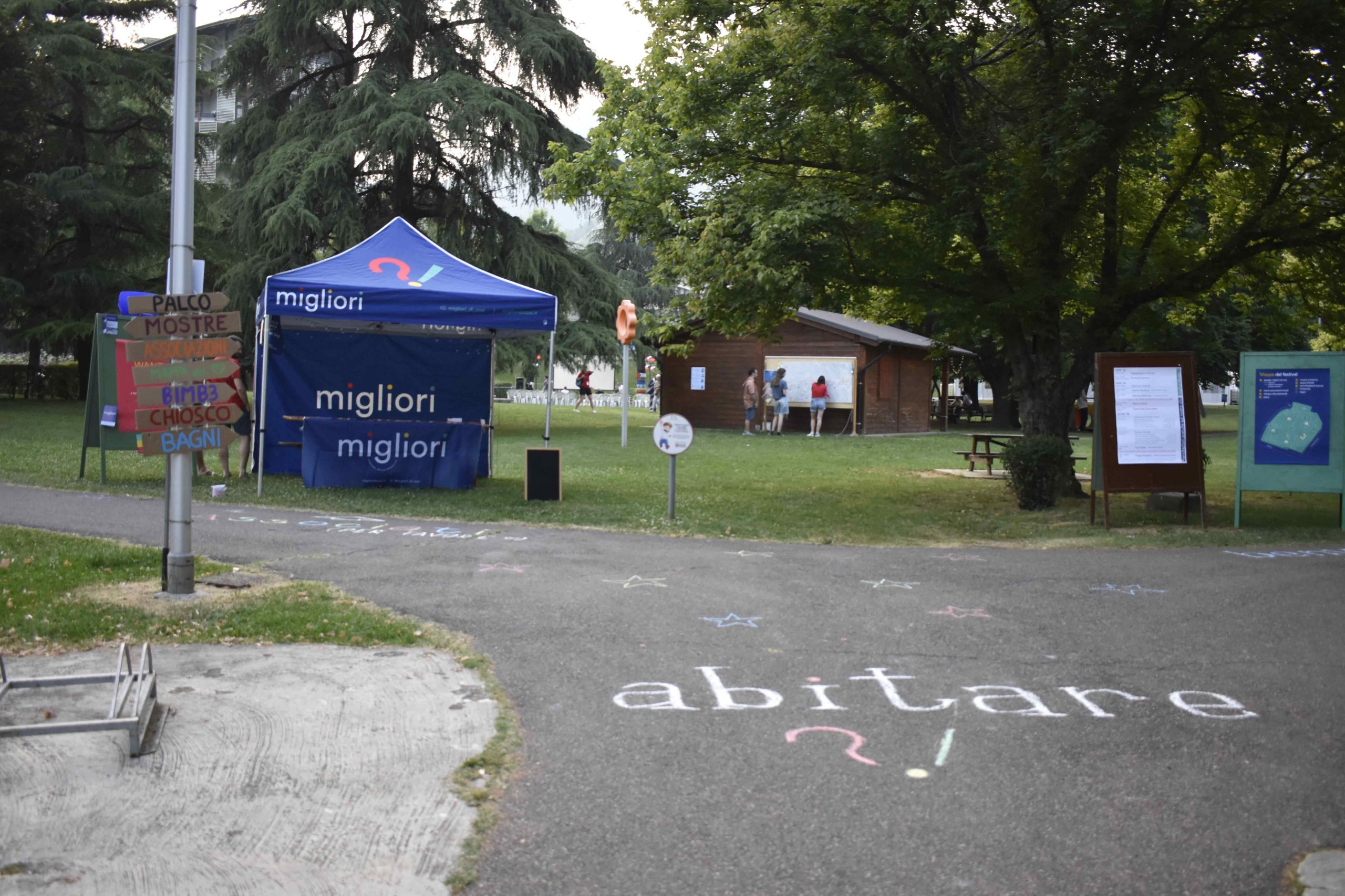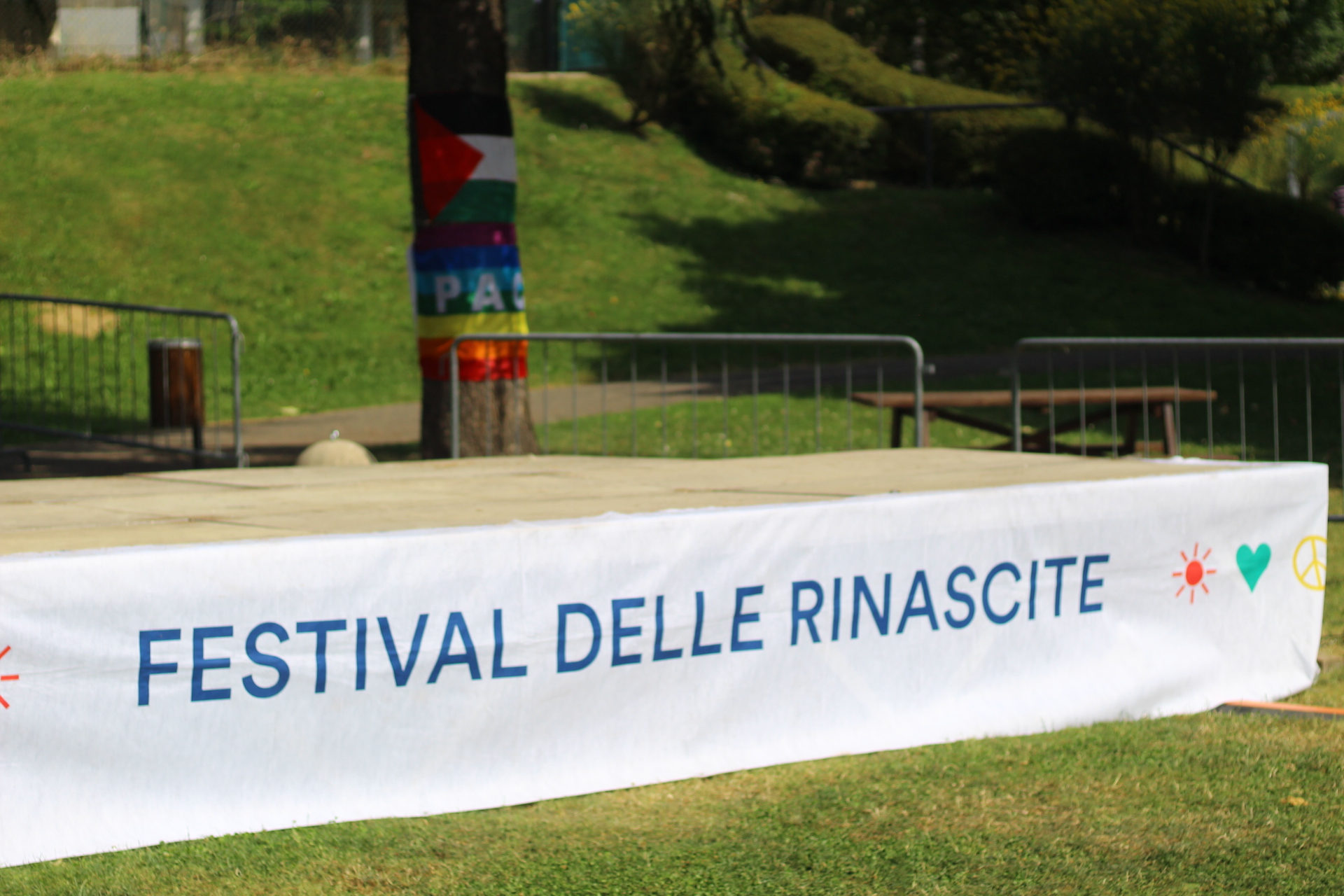 Dopo ore sfiancanti di montaggio, il parco è pronto ad accogliere giovani, famiglie e cittadinɜ che vogliono immergersi in questo spazio vivo e vivace: all'ingresso non può che esserci il gazebo blu; appesi tutto intorno si notano cartelli per arrivare ad ogni dove; tesi tra gli alberi sventolano festoni artigianali; tra il verde risaltano striscioni con inni di libertà. Così si apre il Festival! Vengono inaugurate la rassegna di ritratti dal titolo “Personale e collettivo” di Francesca Pelliccioli, e la mostra fotografica di Gaia Orlando, intitolata “Cosa vedi all’orizzonte”. Le loro opere sbucano tra le siepi del parco, dove la gente inizia a passeggiare e osservare. La Mappa del Cuore, dove lɜ visitatorɜ del parco possono indicare i luoghi in cui si sentono più felici e dove trascorrono il loro tempo con persone care, comincia a riempirsi di tanti piccoli adesivi tondi e colorati. Dietro le quinte (ma neanche troppo) tante apette in maglietta rossa si muovono frenetiche per risolvere in fretta ogni piccolo impiccio...
