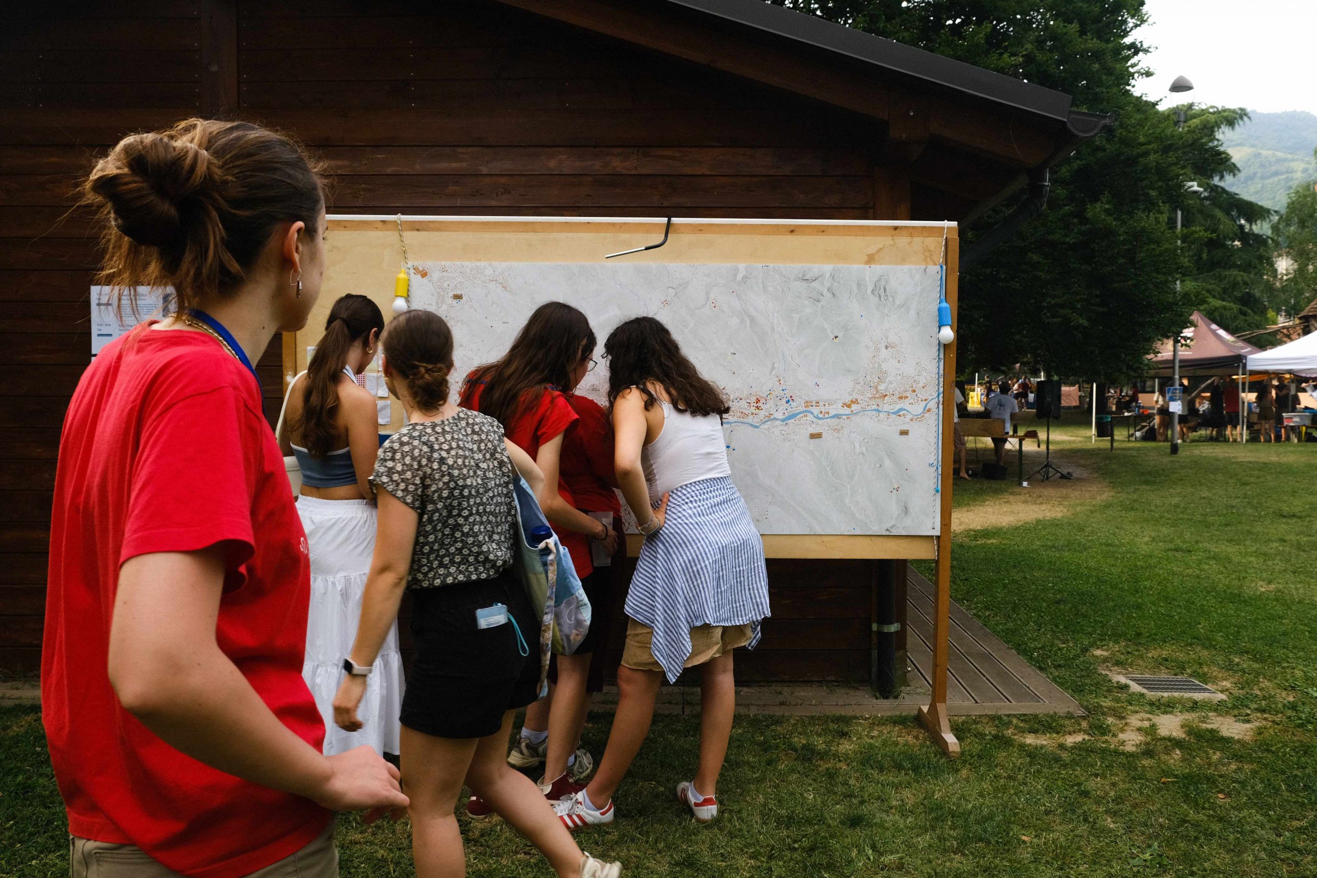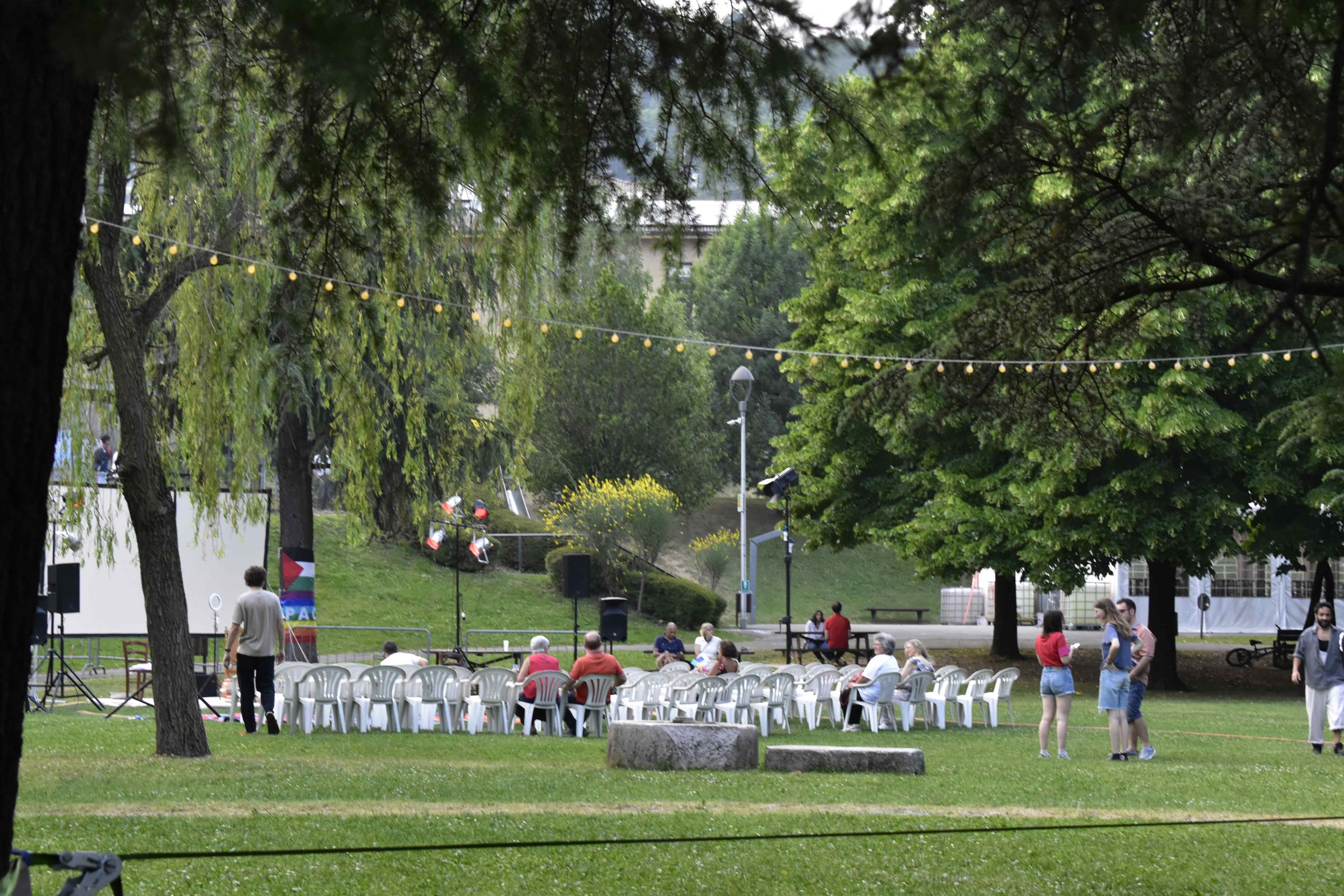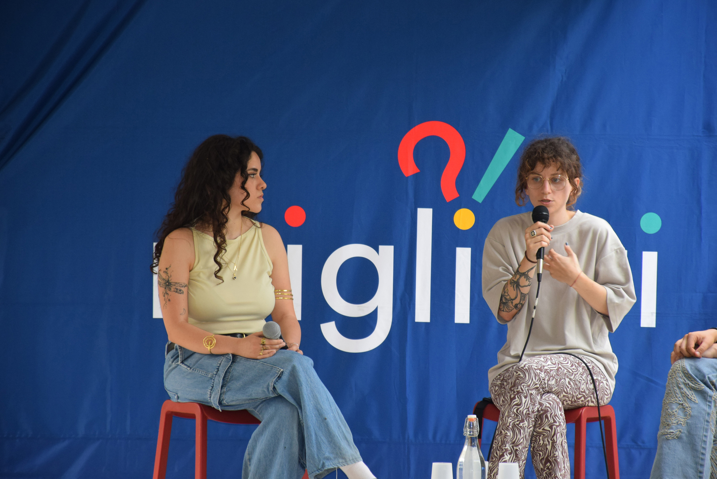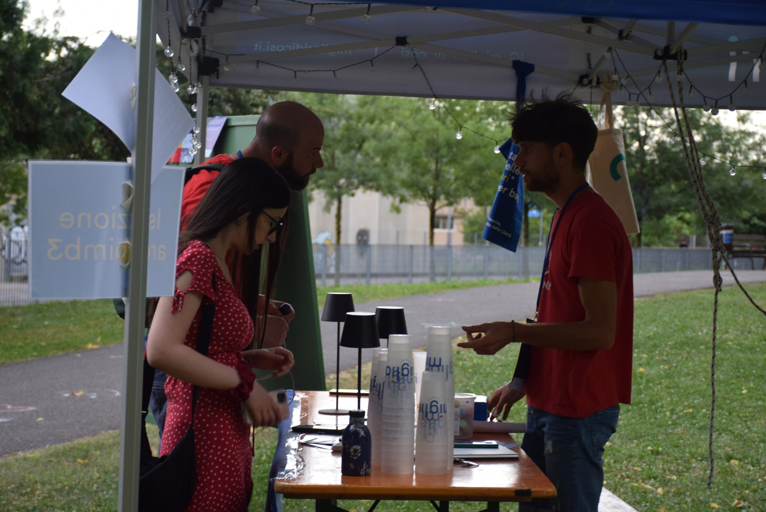 Dopo ore sfiancanti di montaggio, il parco è pronto ad accogliere giovani, famiglie e cittadinɜ che vogliono immergersi in questo spazio vivo e vivace: all'ingresso non può che esserci il gazebo blu; appesi tutto intorno si notano cartelli per arrivare ad ogni dove; tesi tra gli alberi sventolano festoni artigianali; tra il verde risaltano striscioni con inni di libertà. Così si apre il Festival! Vengono inaugurate la rassegna di ritratti dal titolo “Personale e collettivo” di Francesca Pelliccioli, e la mostra fotografica di Gaia Orlando, intitolata “Cosa vedi all’orizzonte”. Le loro opere sbucano tra le siepi del parco, dove la gente inizia a passeggiare e osservare. La Mappa del Cuore, dove lɜ visitatorɜ del parco possono indicare i luoghi in cui si sentono più felici e dove trascorrono il loro tempo con persone care, comincia a riempirsi di tanti piccoli adesivi tondi e colorati. Dietro le quinte (ma neanche troppo) tante apette in maglietta rossa si muovono frenetiche per risolvere in fretta ogni piccolo impiccio...