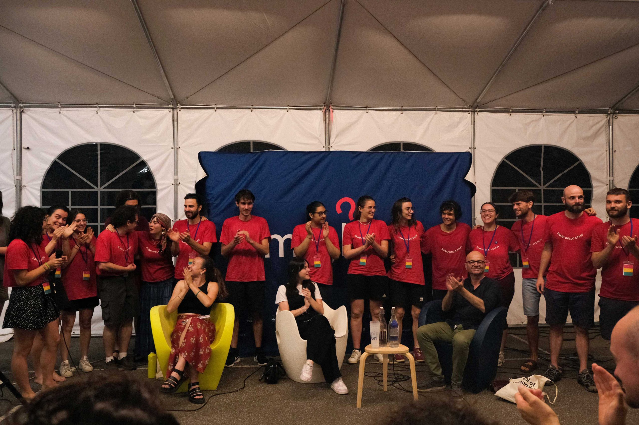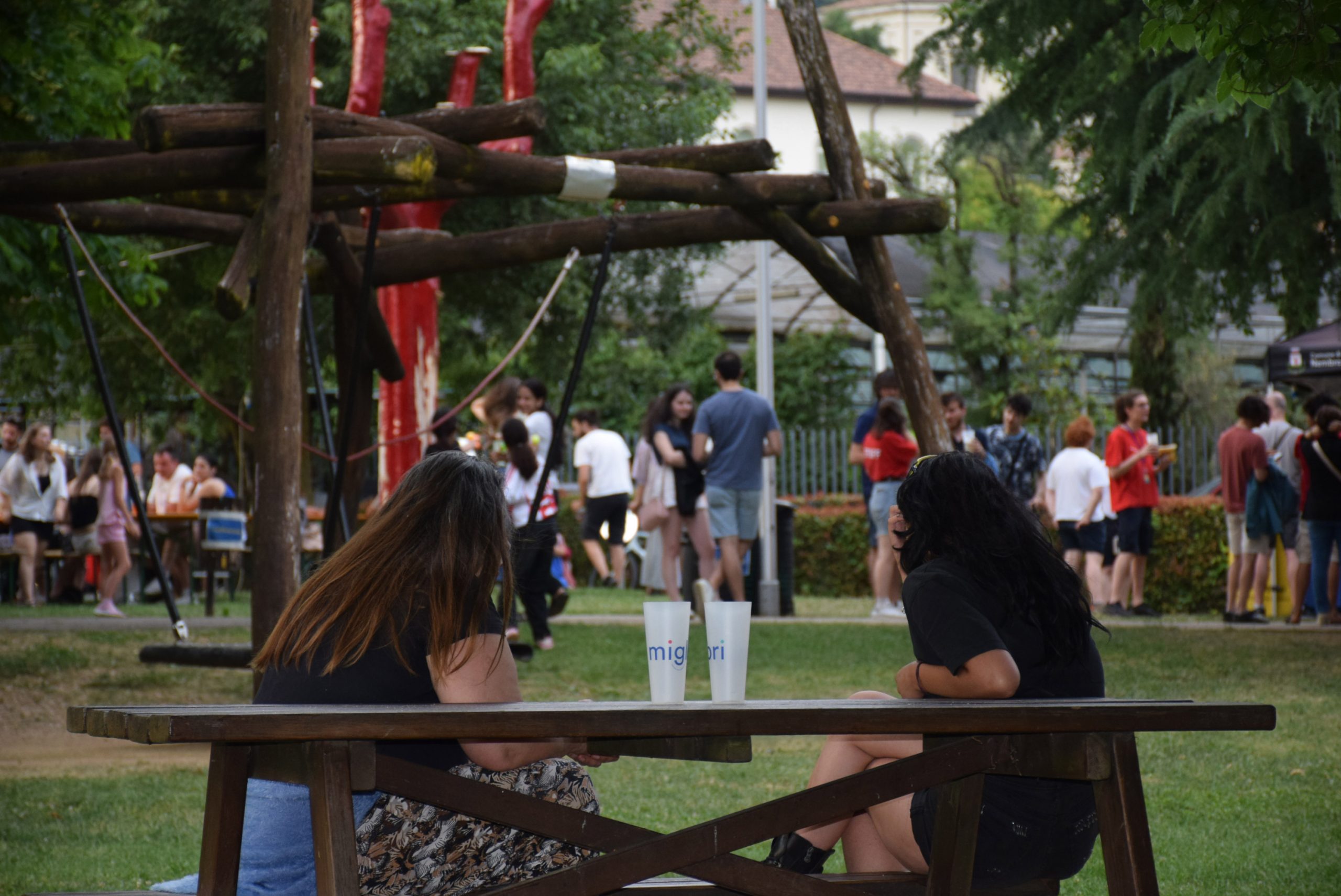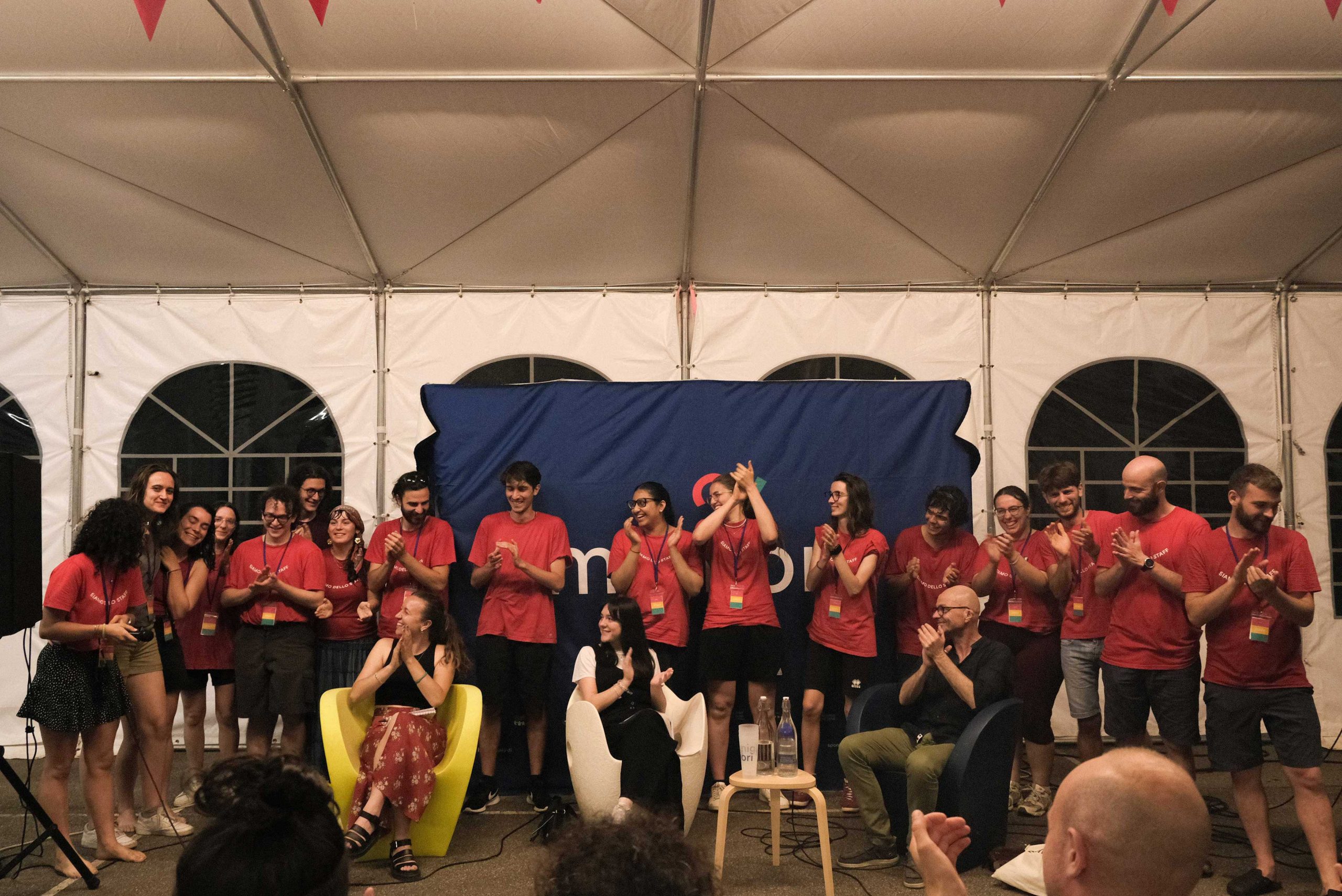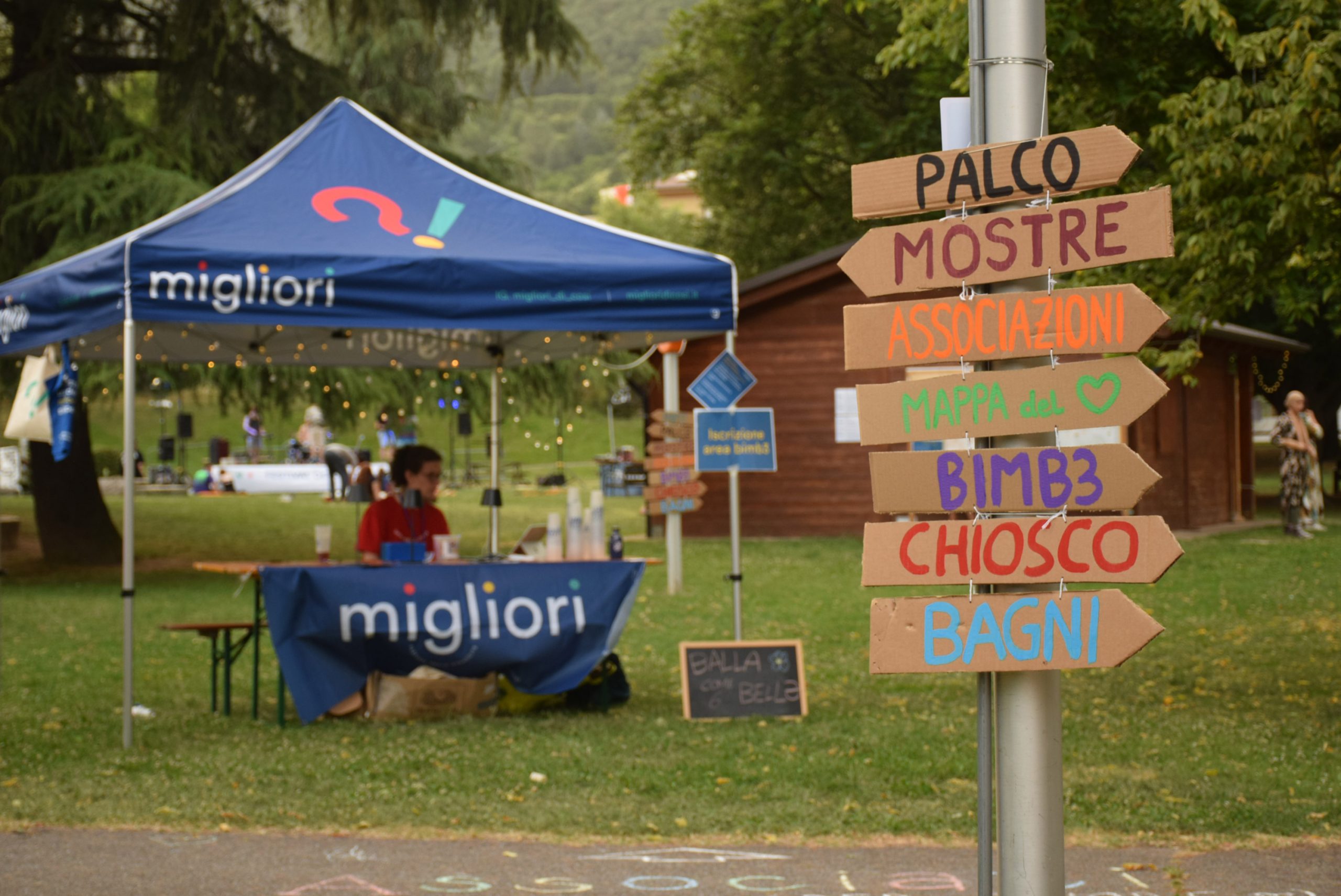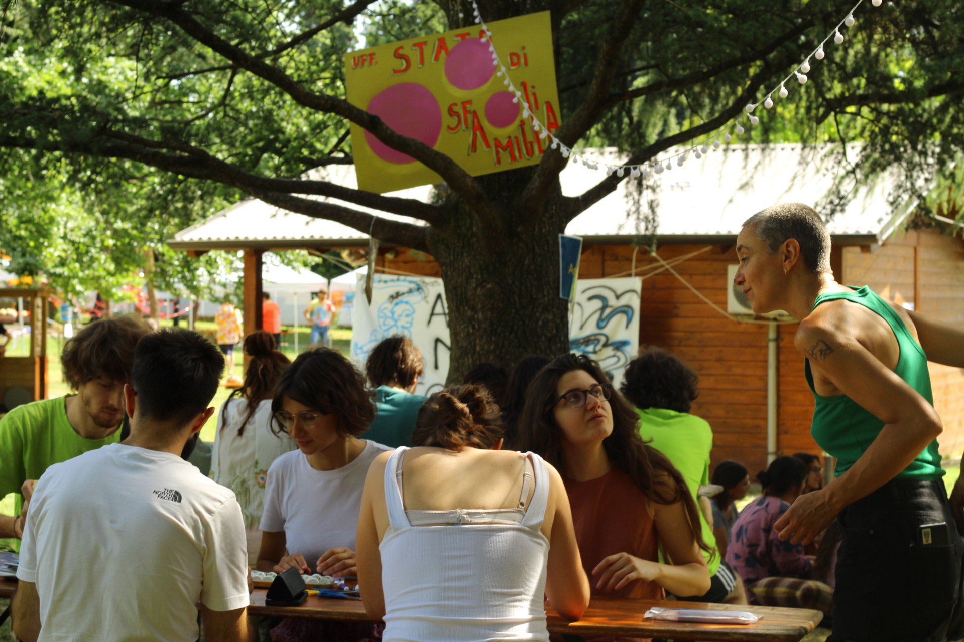 Dopo ore sfiancanti di montaggio, il parco è pronto ad accogliere giovani, famiglie e cittadinɜ che vogliono immergersi in questo spazio vivo e vivace: all'ingresso non può che esserci il gazebo blu; appesi tutto intorno si notano cartelli per arrivare ad ogni dove; tesi tra gli alberi sventolano festoni artigianali; tra il verde risaltano striscioni con inni di libertà. Così si apre il Festival! Vengono inaugurate la rassegna di ritratti dal titolo “Personale e collettivo” di Francesca Pelliccioli, e la mostra fotografica di Gaia Orlando, intitolata “Cosa vedi all’orizzonte”. Le loro opere sbucano tra le siepi del parco, dove la gente inizia a passeggiare e osservare. La Mappa del Cuore, dove lɜ visitatorɜ del parco possono indicare i luoghi in cui si sentono più felici e dove trascorrono il loro tempo con persone care, comincia a riempirsi di tanti piccoli adesivi tondi e colorati. Dietro le quinte (ma neanche troppo) tante apette in maglietta rossa si muovono frenetiche per risolvere in fretta ogni piccolo impiccio...
