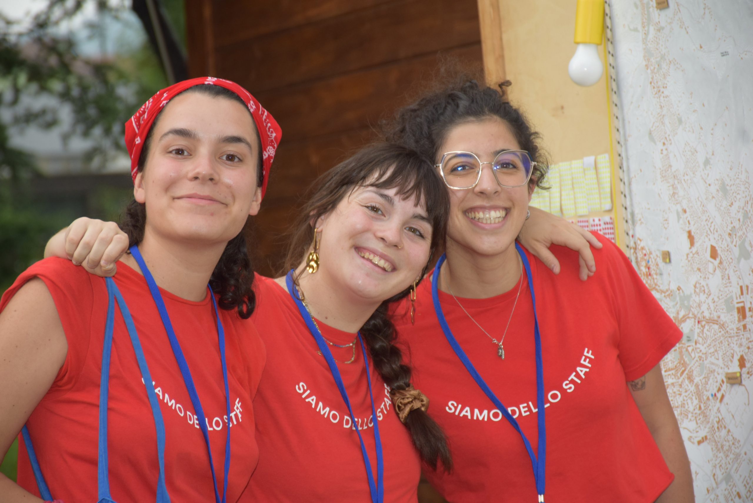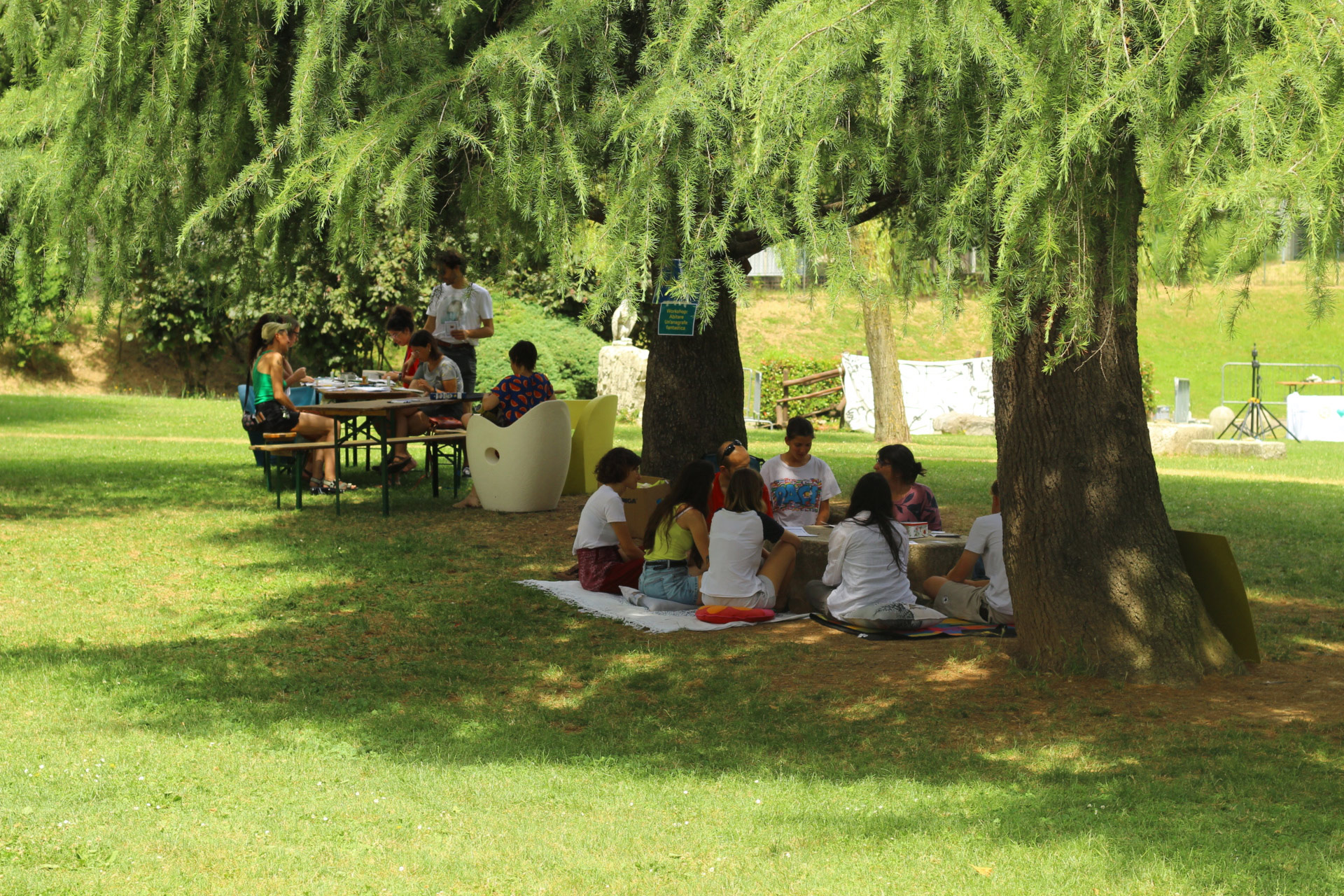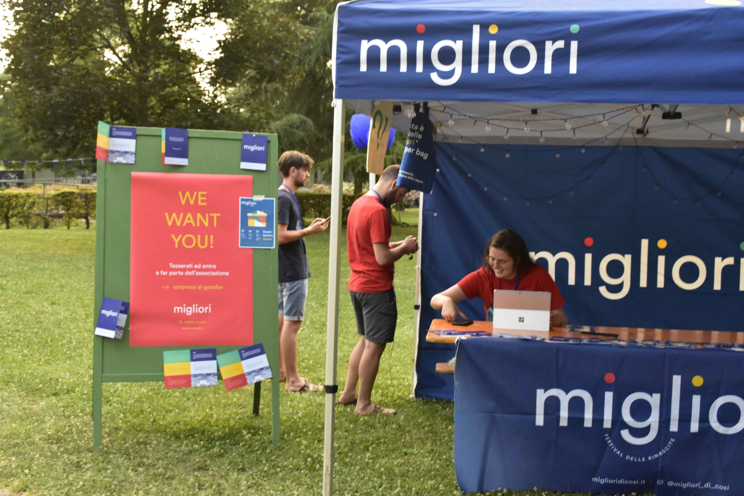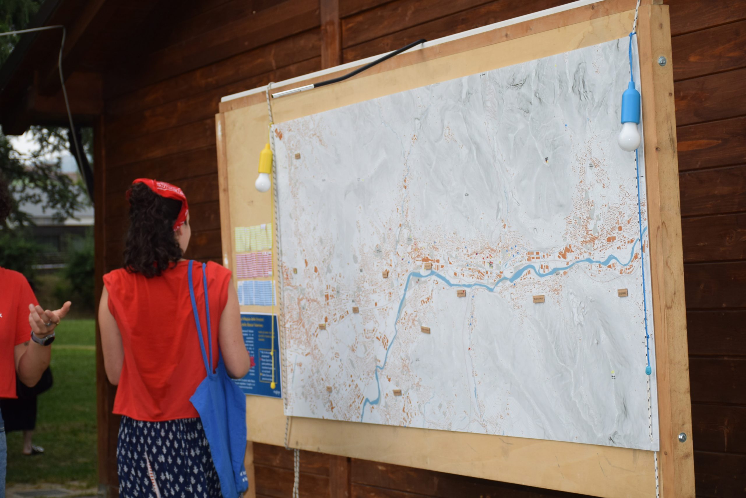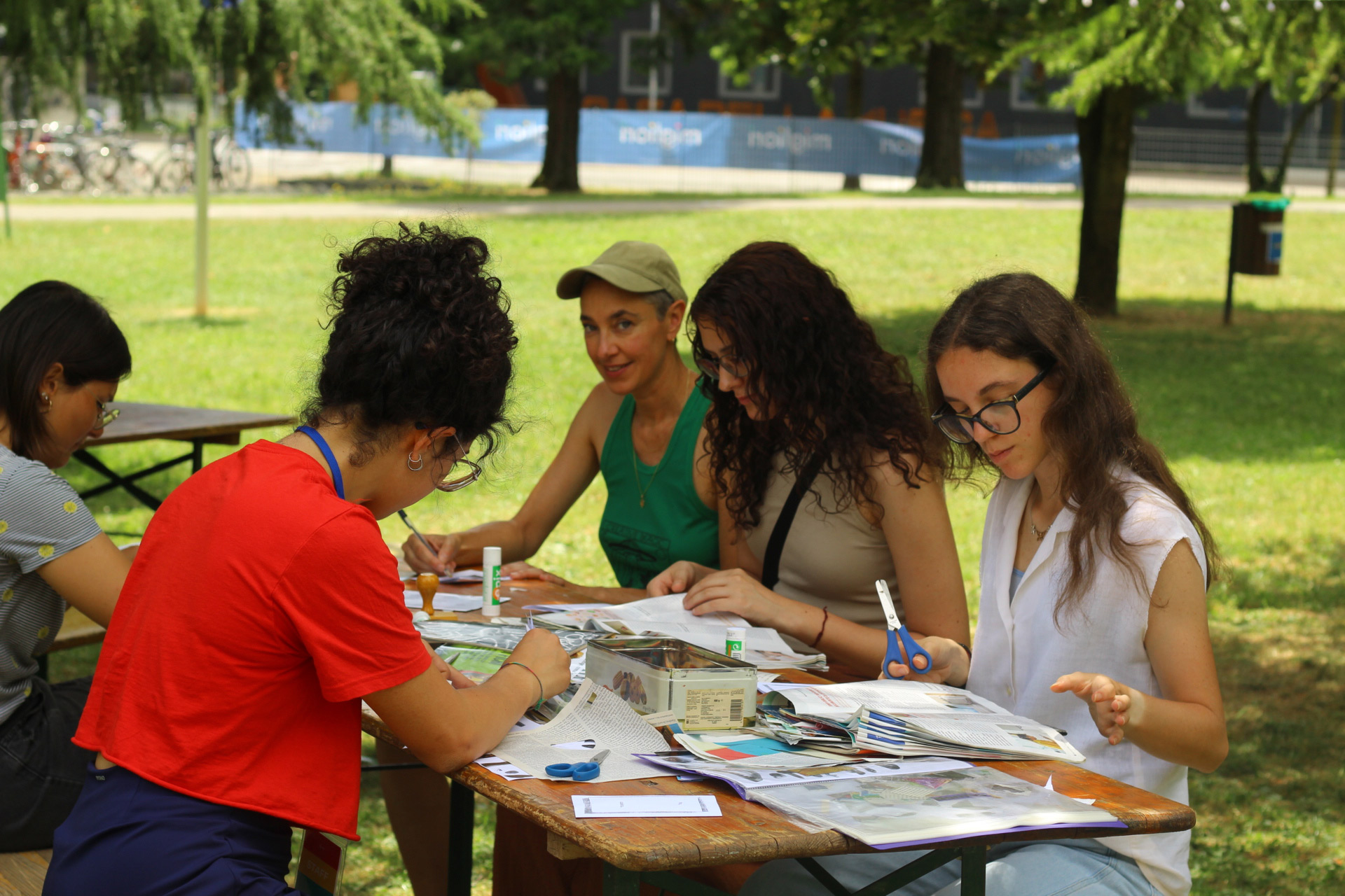 Dopo ore sfiancanti di montaggio, il parco è pronto ad accogliere giovani, famiglie e cittadinɜ che vogliono immergersi in questo spazio vivo e vivace: all'ingresso non può che esserci il gazebo blu; appesi tutto intorno si notano cartelli per arrivare ad ogni dove; tesi tra gli alberi sventolano festoni artigianali; tra il verde risaltano striscioni con inni di libertà. Così si apre il Festival! Vengono inaugurate la rassegna di ritratti dal titolo “Personale e collettivo” di Francesca Pelliccioli, e la mostra fotografica di Gaia Orlando, intitolata “Cosa vedi all’orizzonte”. Le loro opere sbucano tra le siepi del parco, dove la gente inizia a passeggiare e osservare. La Mappa del Cuore, dove lɜ visitatorɜ del parco possono indicare i luoghi in cui si sentono più felici e dove trascorrono il loro tempo con persone care, comincia a riempirsi di tanti piccoli adesivi tondi e colorati. Dietro le quinte (ma neanche troppo) tante apette in maglietta rossa si muovono frenetiche per risolvere in fretta ogni piccolo impiccio...