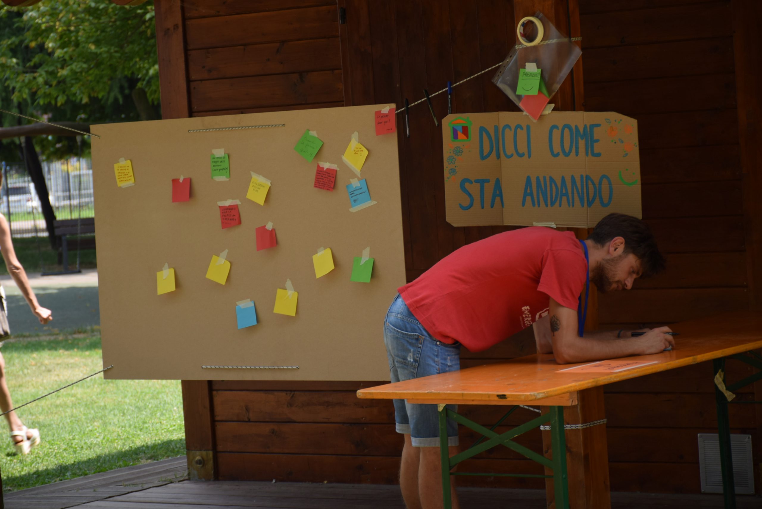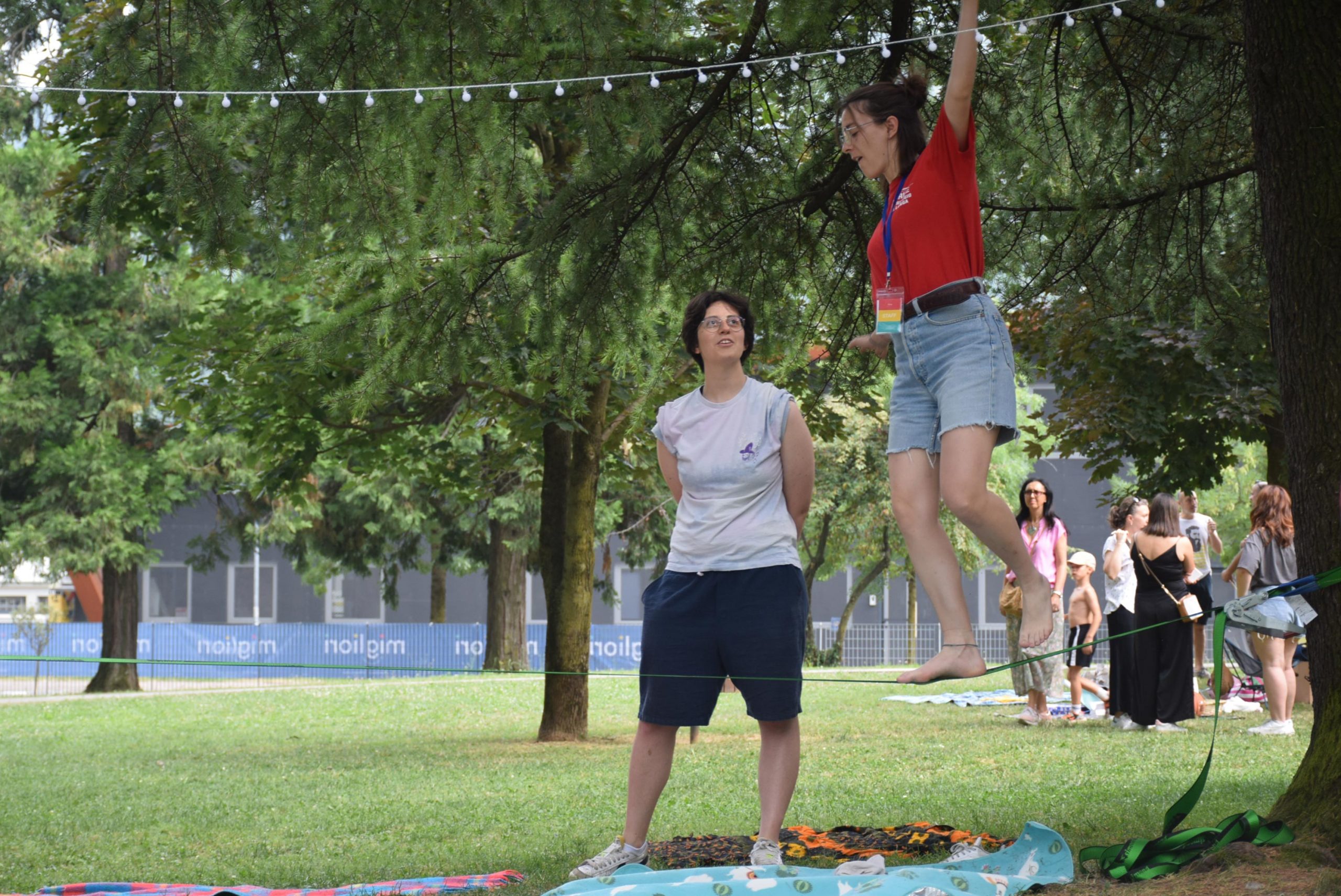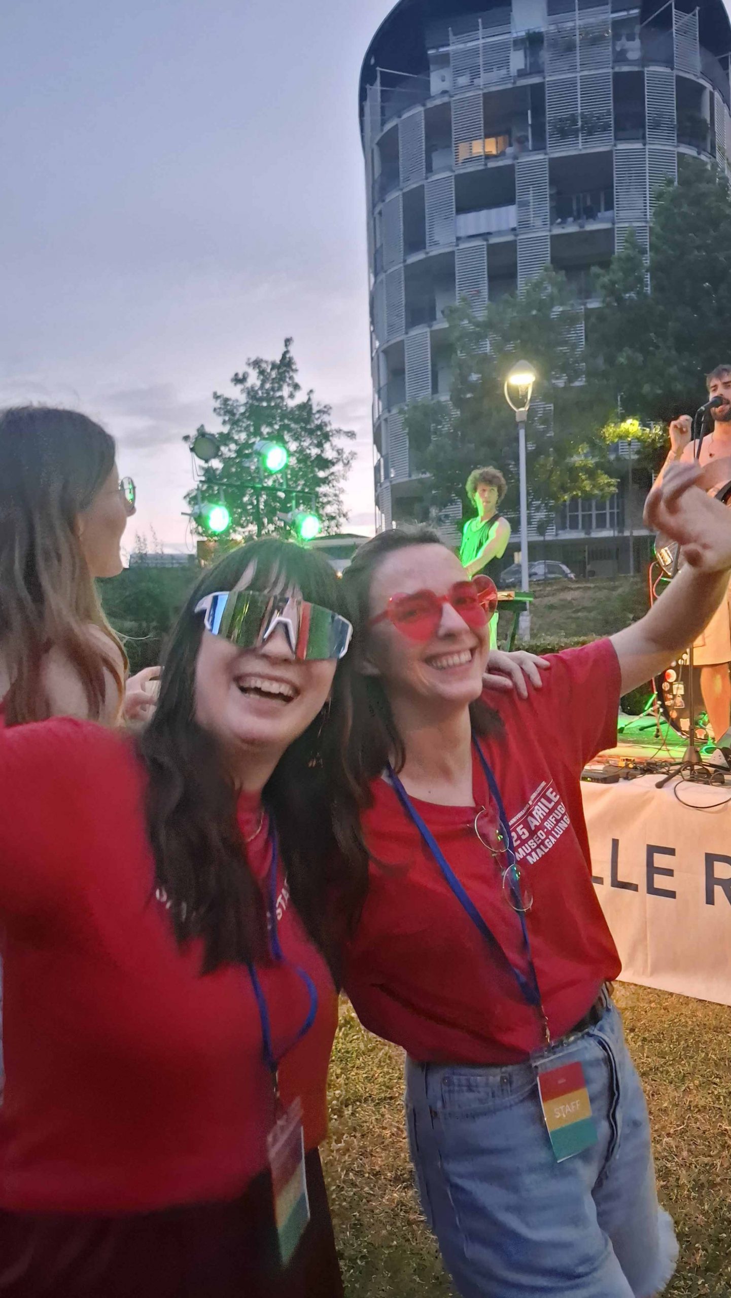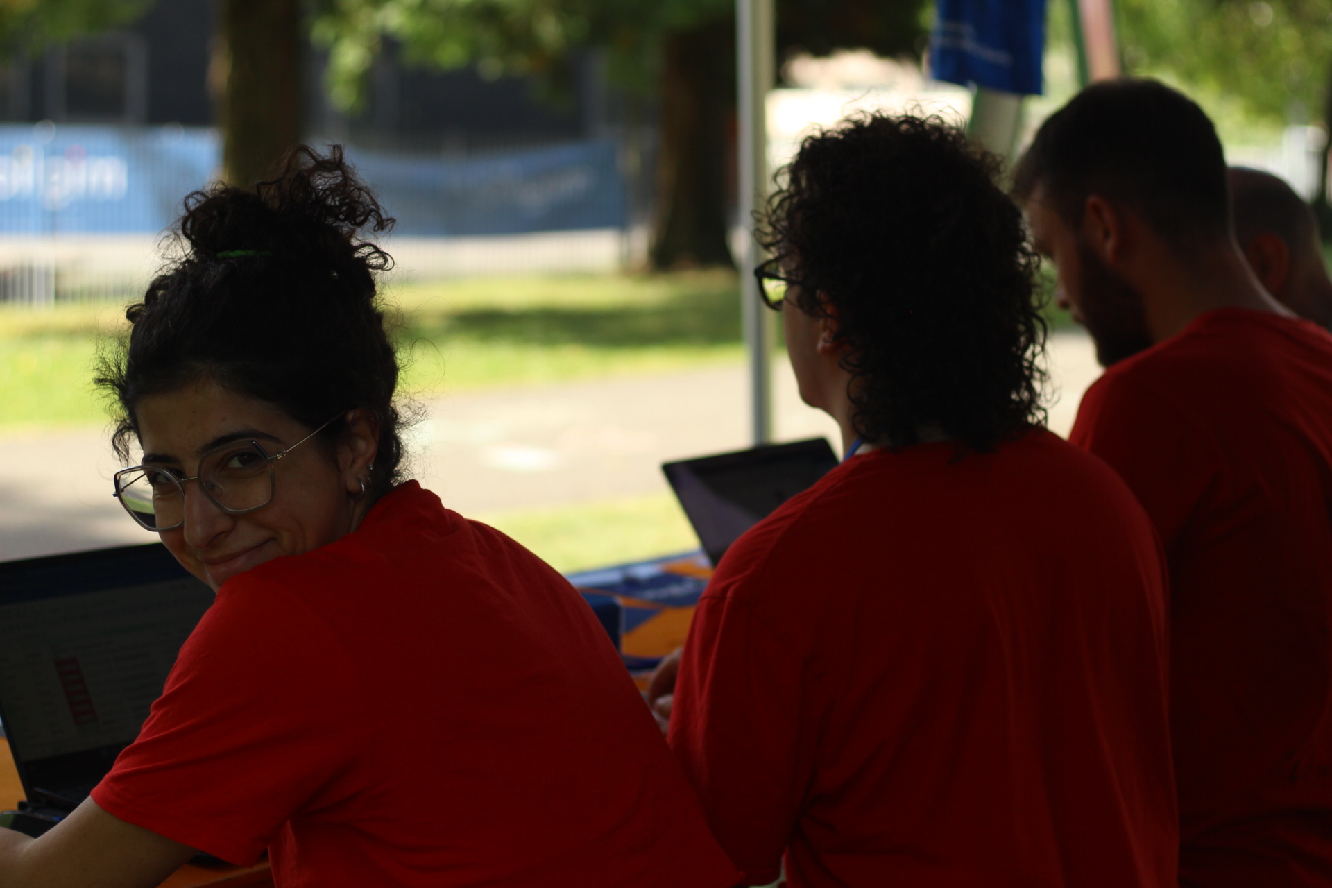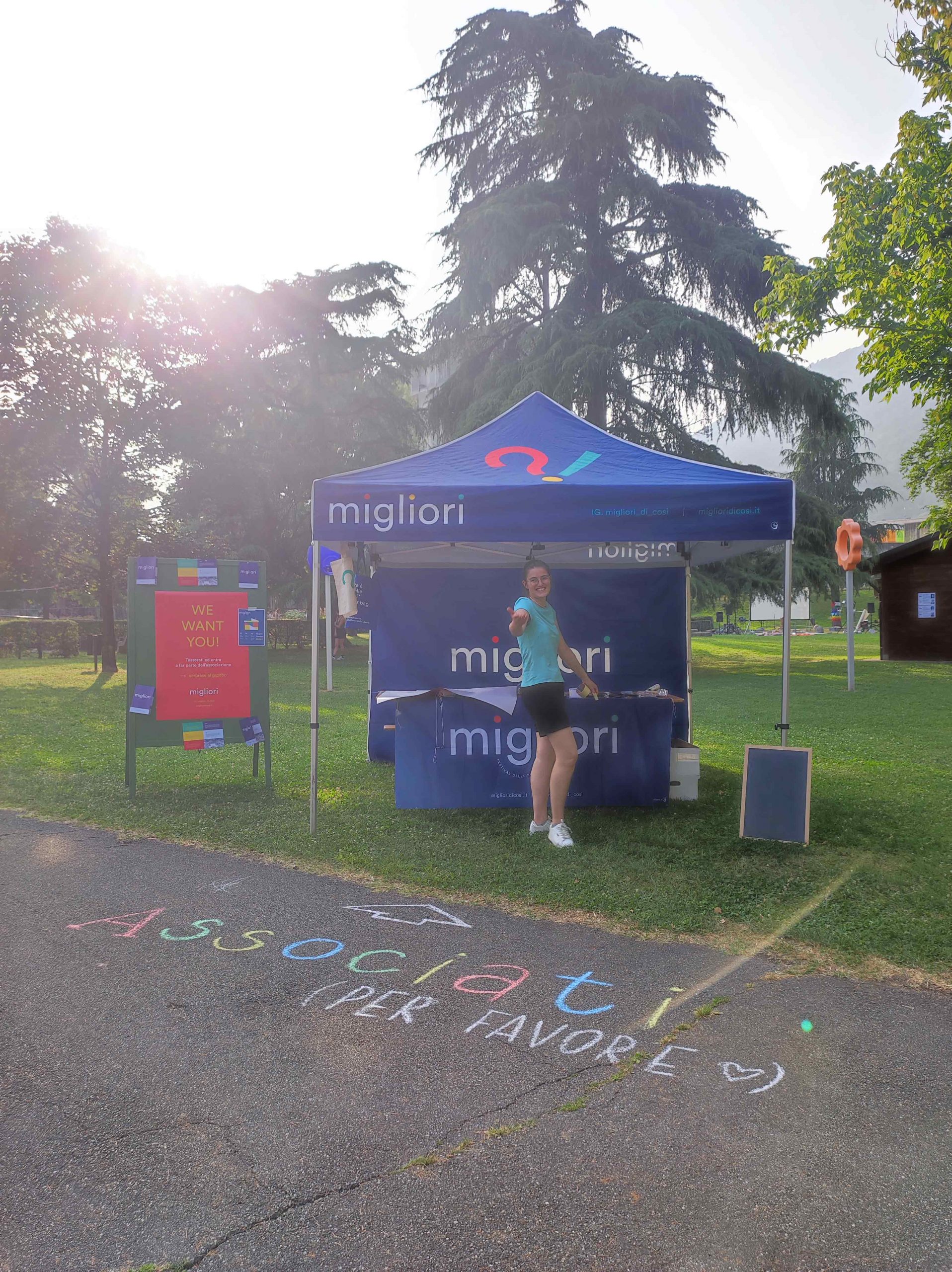 Dopo ore sfiancanti di montaggio, il parco è pronto ad accogliere giovani, famiglie e cittadinɜ che vogliono immergersi in questo spazio vivo e vivace: all'ingresso non può che esserci il gazebo blu; appesi tutto intorno si notano cartelli per arrivare ad ogni dove; tesi tra gli alberi sventolano festoni artigianali; tra il verde risaltano striscioni con inni di libertà. Così si apre il Festival! Vengono inaugurate la rassegna di ritratti dal titolo “Personale e collettivo” di Francesca Pelliccioli, e la mostra fotografica di Gaia Orlando, intitolata “Cosa vedi all’orizzonte”. Le loro opere sbucano tra le siepi del parco, dove la gente inizia a passeggiare e osservare. La Mappa del Cuore, dove lɜ visitatorɜ del parco possono indicare i luoghi in cui si sentono più felici e dove trascorrono il loro tempo con persone care, comincia a riempirsi di tanti piccoli adesivi tondi e colorati. Dietro le quinte (ma neanche troppo) tante apette in maglietta rossa si muovono frenetiche per risolvere in fretta ogni piccolo impiccio...