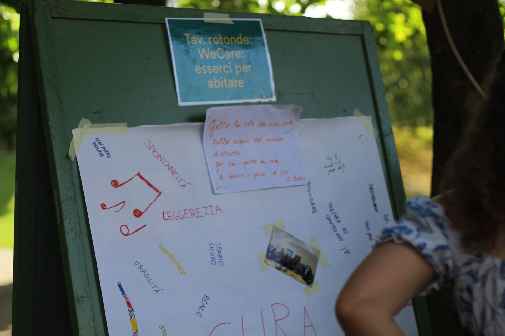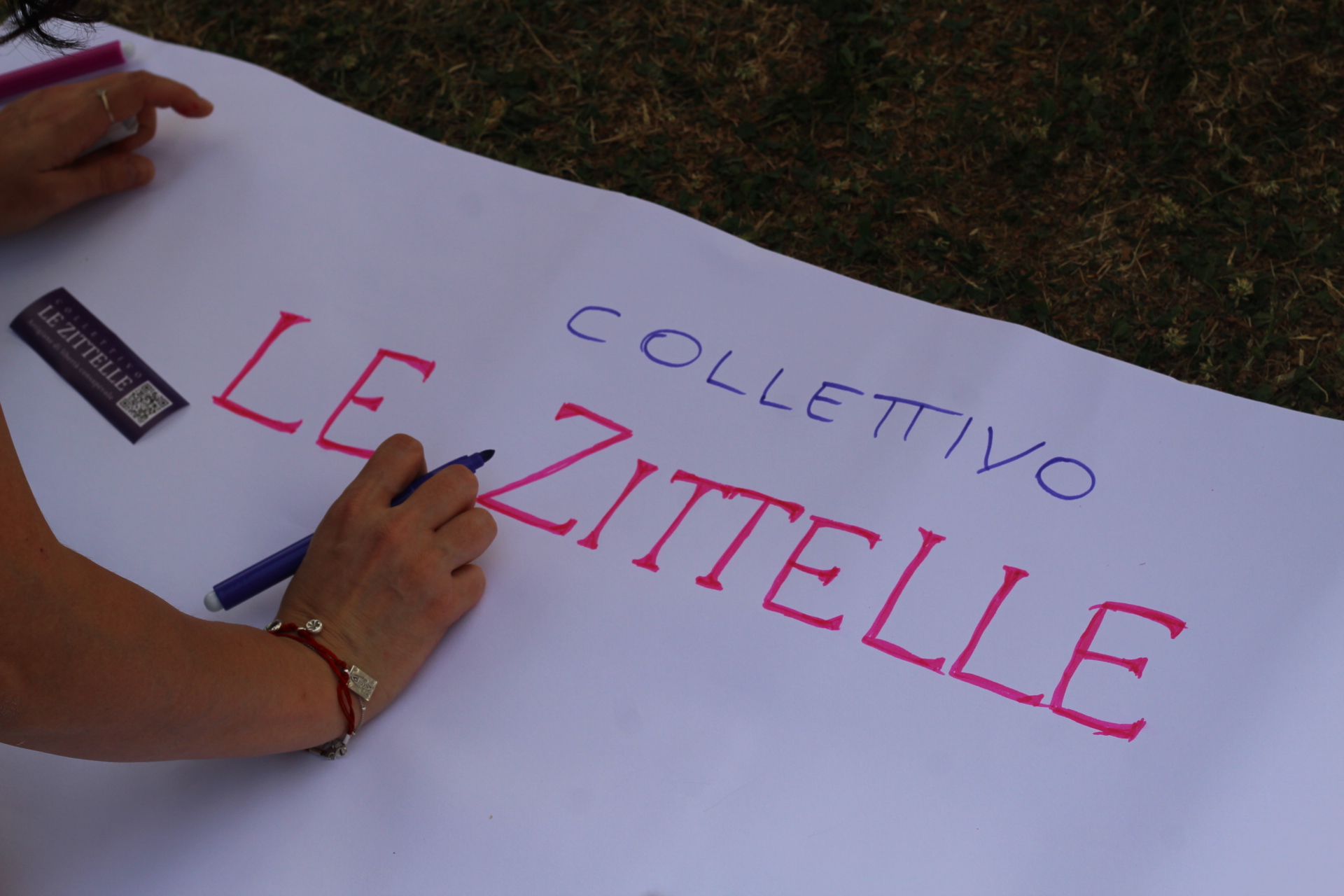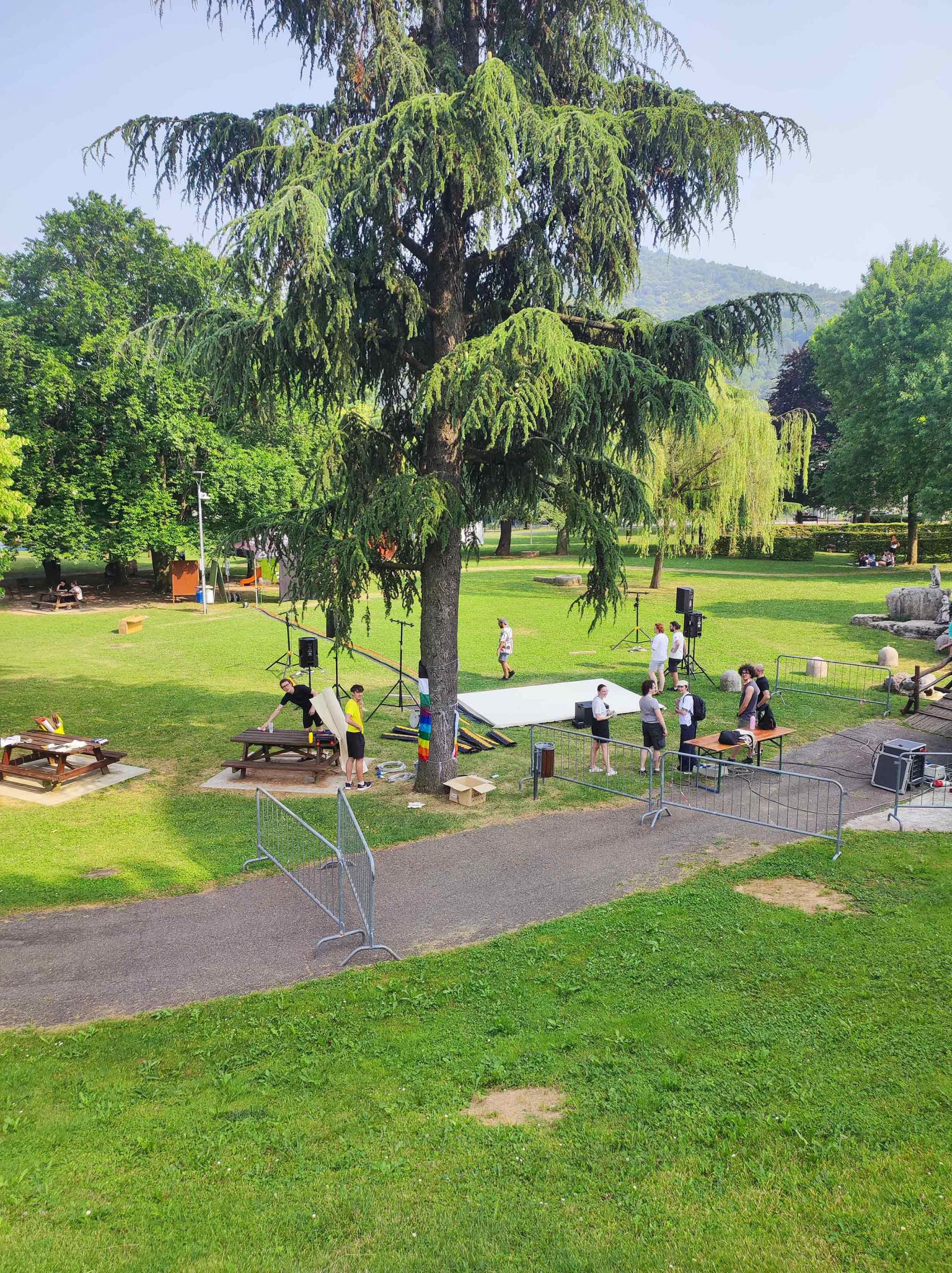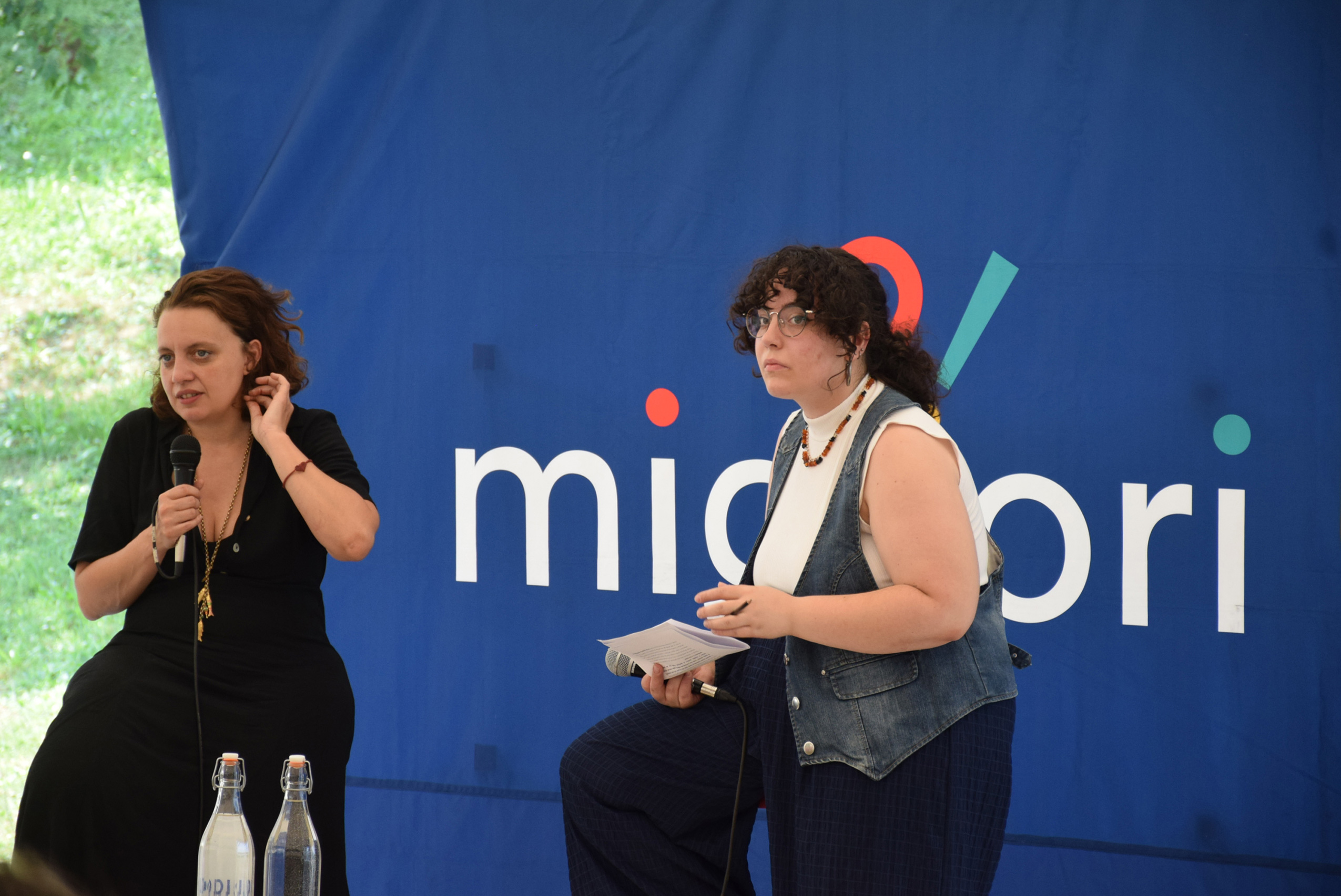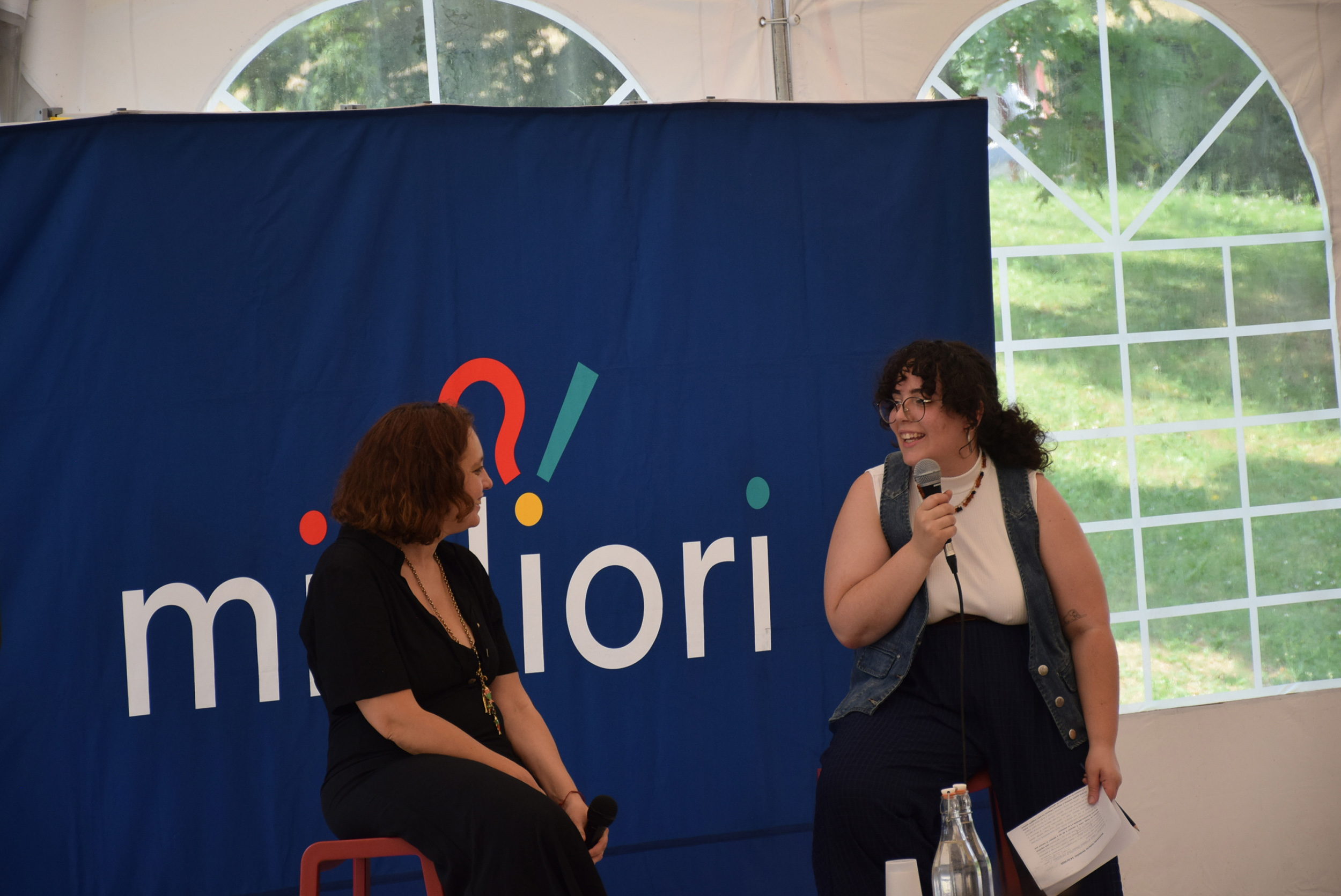 Dopo ore sfiancanti di montaggio, il parco è pronto ad accogliere giovani, famiglie e cittadinɜ che vogliono immergersi in questo spazio vivo e vivace: all'ingresso non può che esserci il gazebo blu; appesi tutto intorno si notano cartelli per arrivare ad ogni dove; tesi tra gli alberi sventolano festoni artigianali; tra il verde risaltano striscioni con inni di libertà. Così si apre il Festival! Vengono inaugurate la rassegna di ritratti dal titolo “Personale e collettivo” di Francesca Pelliccioli, e la mostra fotografica di Gaia Orlando, intitolata “Cosa vedi all’orizzonte”. Le loro opere sbucano tra le siepi del parco, dove la gente inizia a passeggiare e osservare. La Mappa del Cuore, dove lɜ visitatorɜ del parco possono indicare i luoghi in cui si sentono più felici e dove trascorrono il loro tempo con persone care, comincia a riempirsi di tanti piccoli adesivi tondi e colorati. Dietro le quinte (ma neanche troppo) tante apette in maglietta rossa si muovono frenetiche per risolvere in fretta ogni piccolo impiccio...