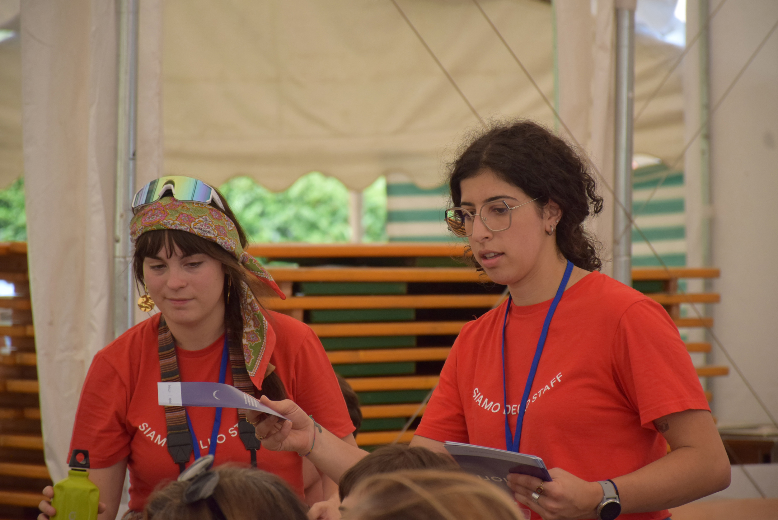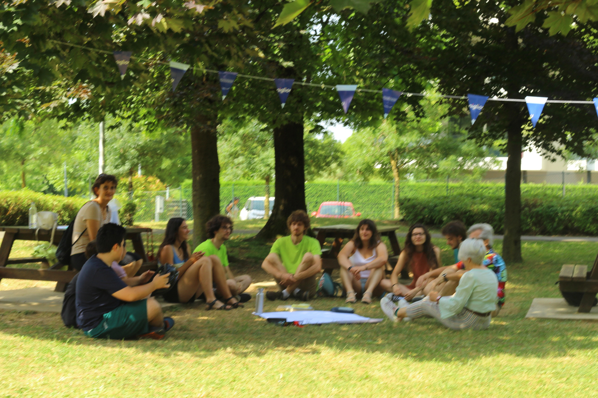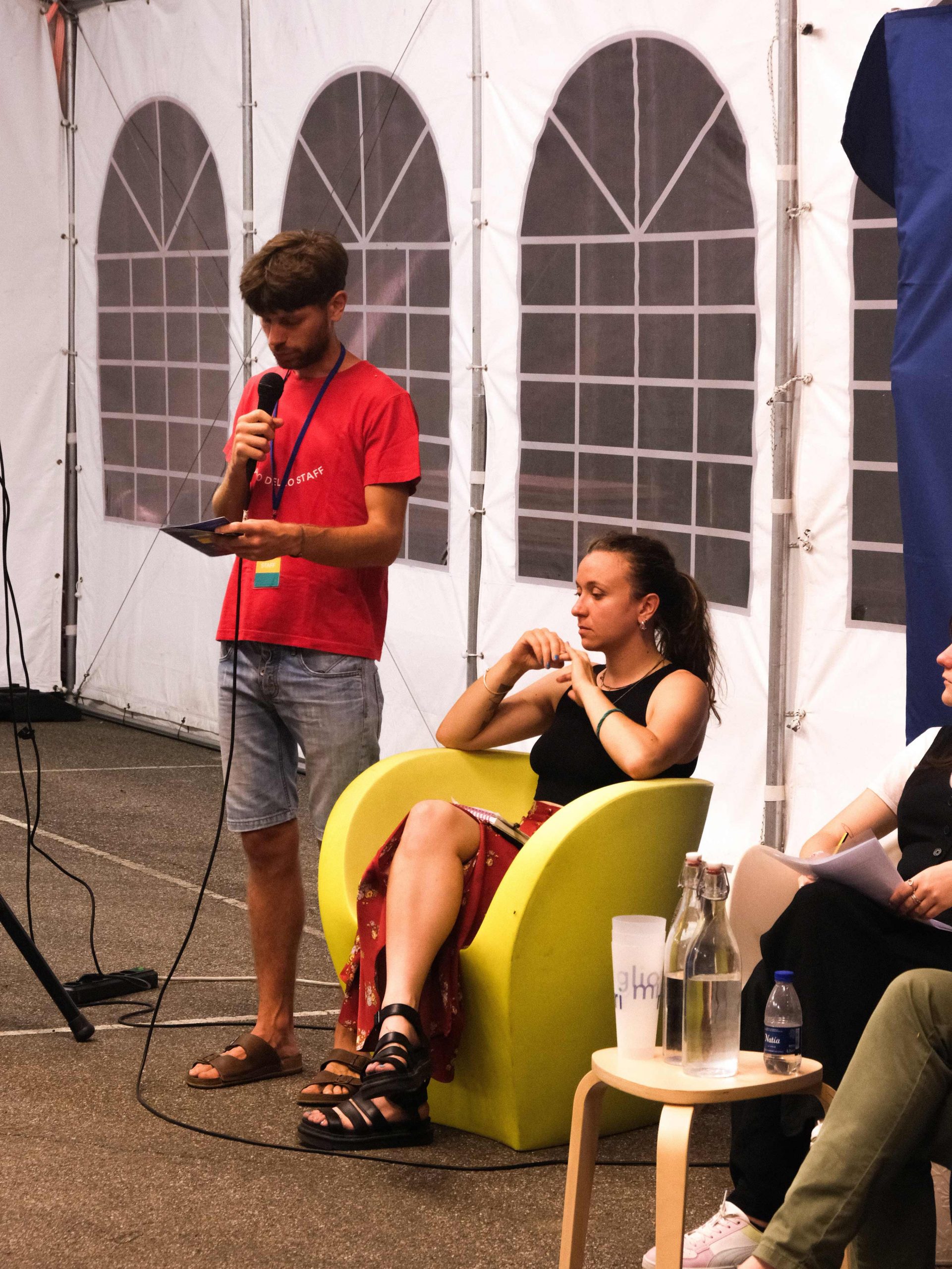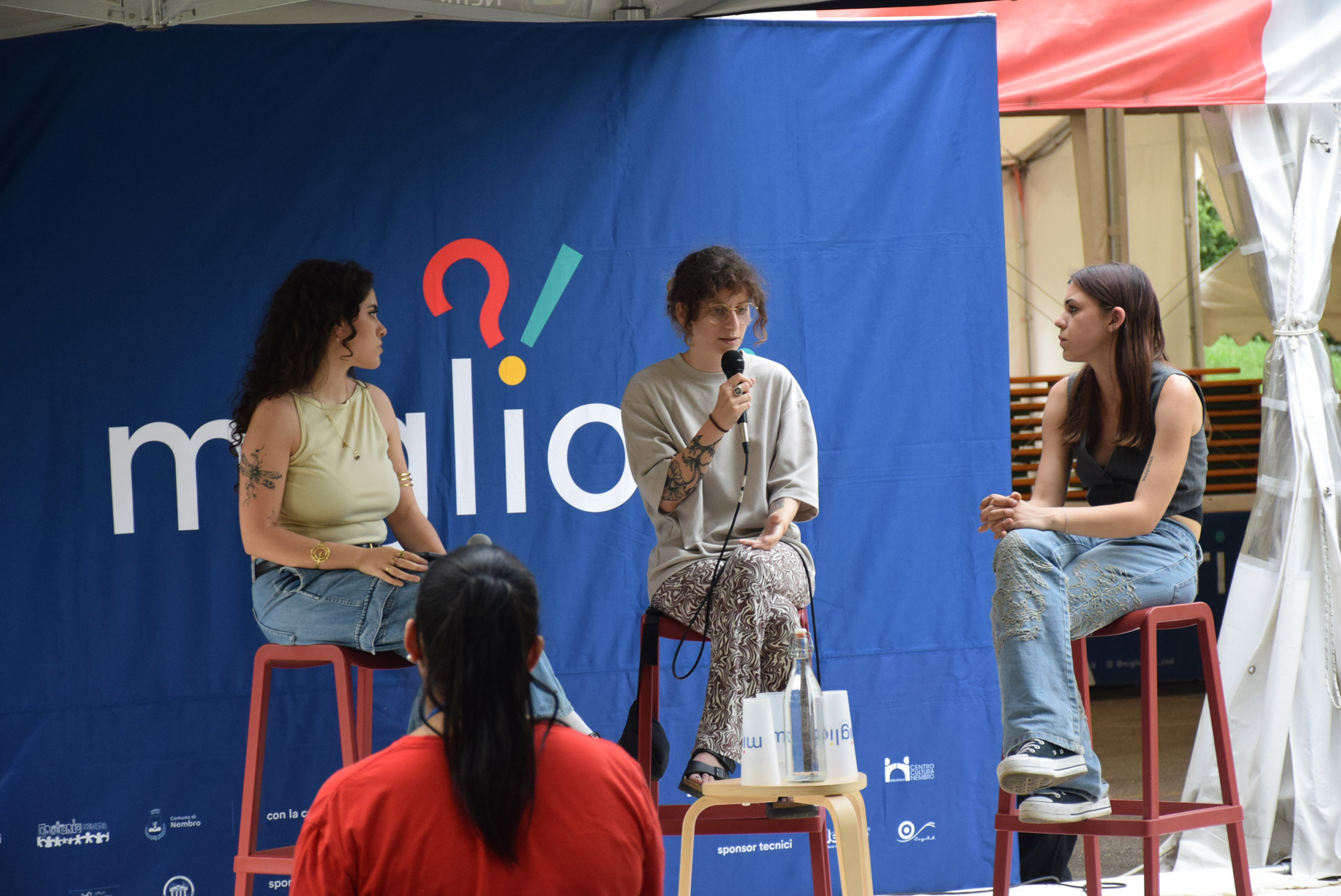 Dopo ore sfiancanti di montaggio, il parco è pronto ad accogliere giovani, famiglie e cittadinɜ che vogliono immergersi in questo spazio vivo e vivace: all'ingresso non può che esserci il gazebo blu; appesi tutto intorno si notano cartelli per arrivare ad ogni dove; tesi tra gli alberi sventolano festoni artigianali; tra il verde risaltano striscioni con inni di libertà. Così si apre il Festival! Vengono inaugurate la rassegna di ritratti dal titolo “Personale e collettivo” di Francesca Pelliccioli, e la mostra fotografica di Gaia Orlando, intitolata “Cosa vedi all’orizzonte”. Le loro opere sbucano tra le siepi del parco, dove la gente inizia a passeggiare e osservare. La Mappa del Cuore, dove lɜ visitatorɜ del parco possono indicare i luoghi in cui si sentono più felici e dove trascorrono il loro tempo con persone care, comincia a riempirsi di tanti piccoli adesivi tondi e colorati. Dietro le quinte (ma neanche troppo) tante apette in maglietta rossa si muovono frenetiche per risolvere in fretta ogni piccolo impiccio...