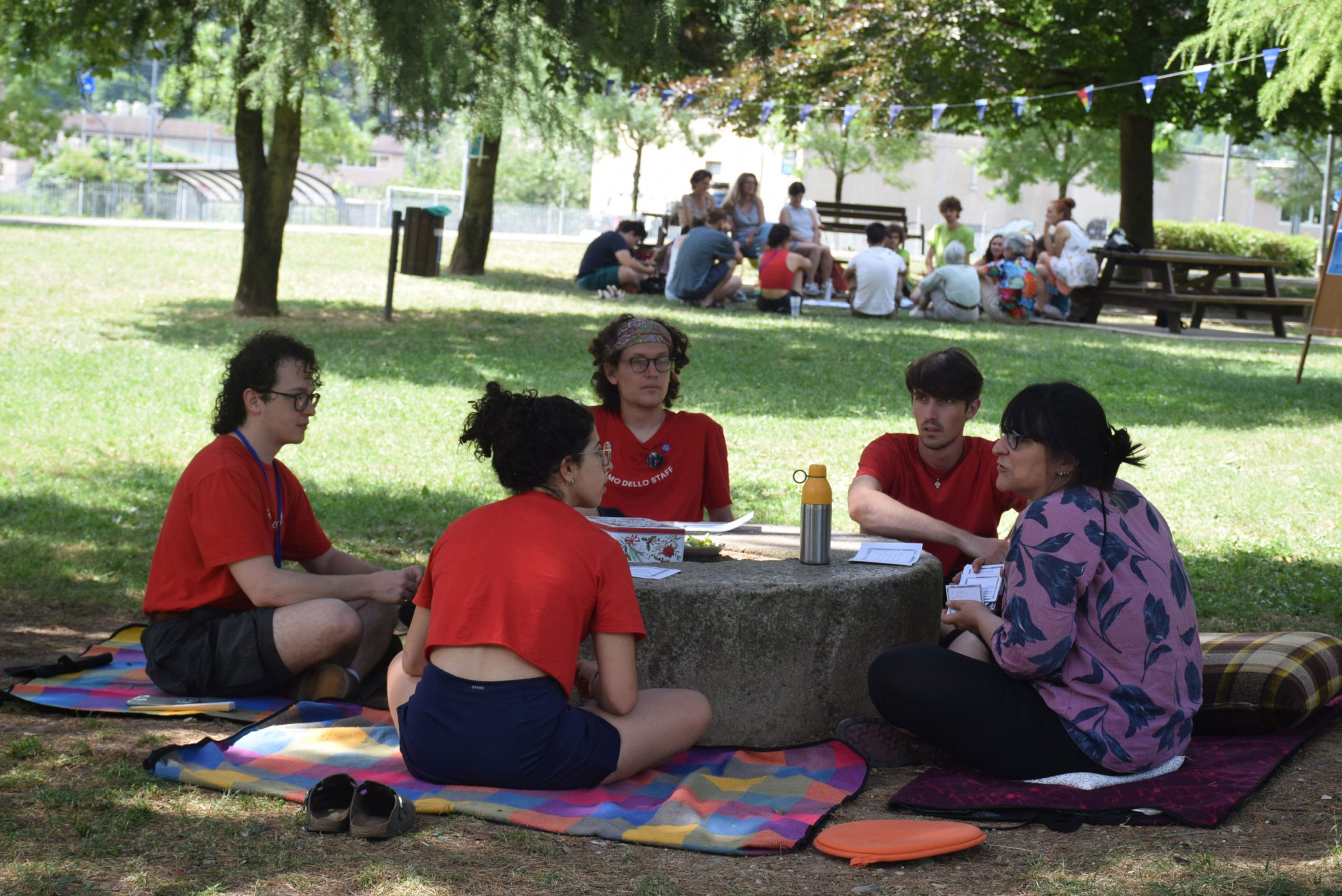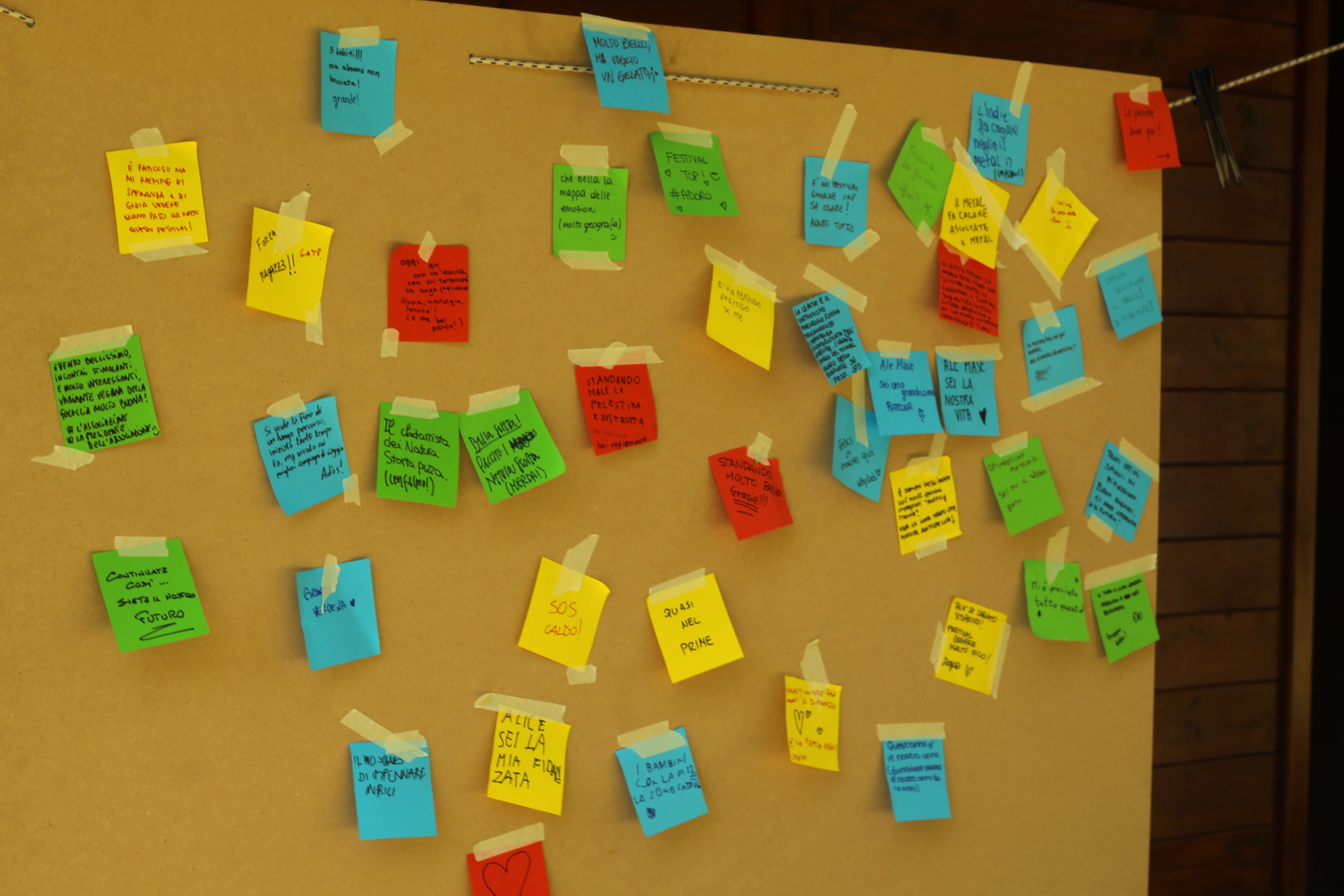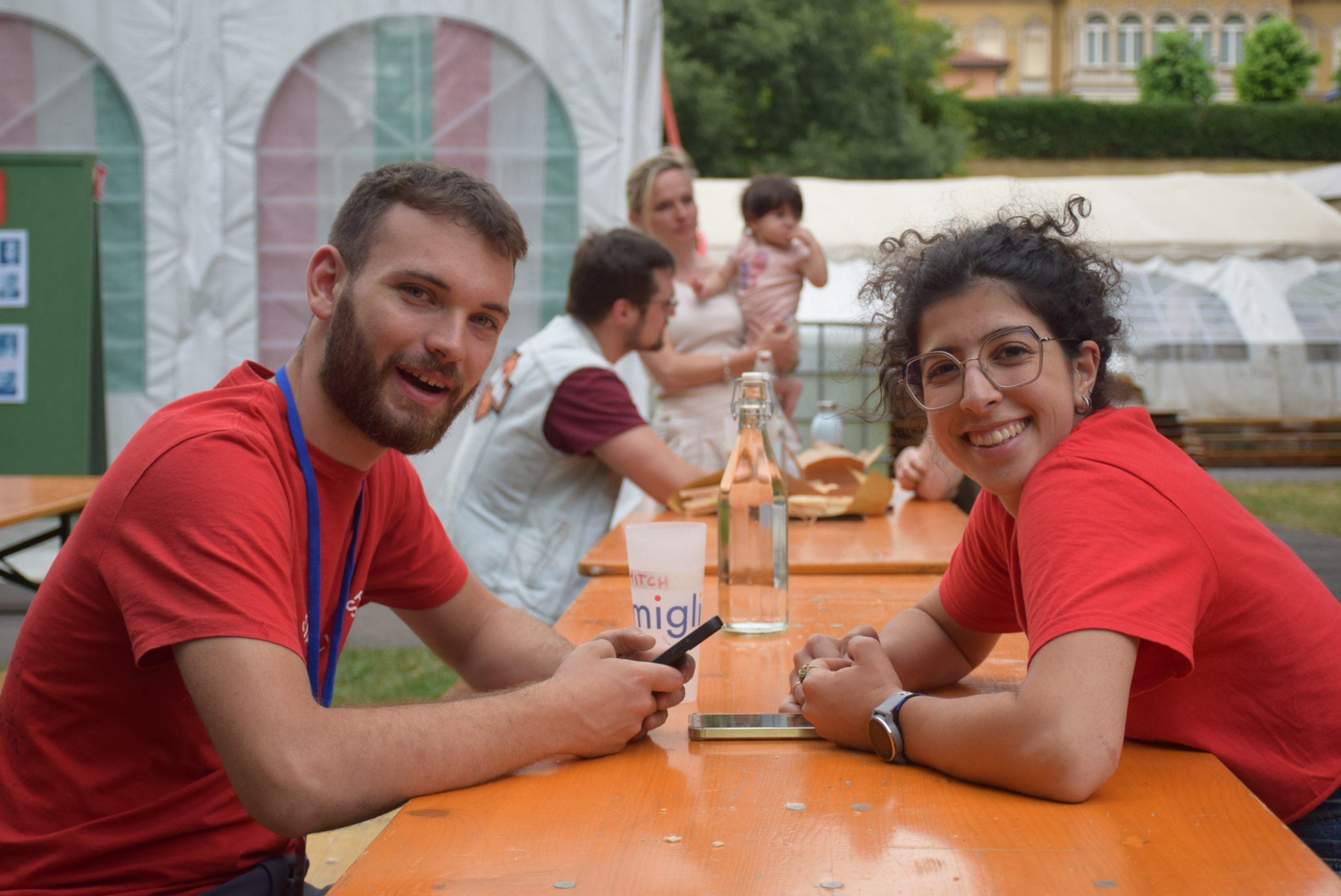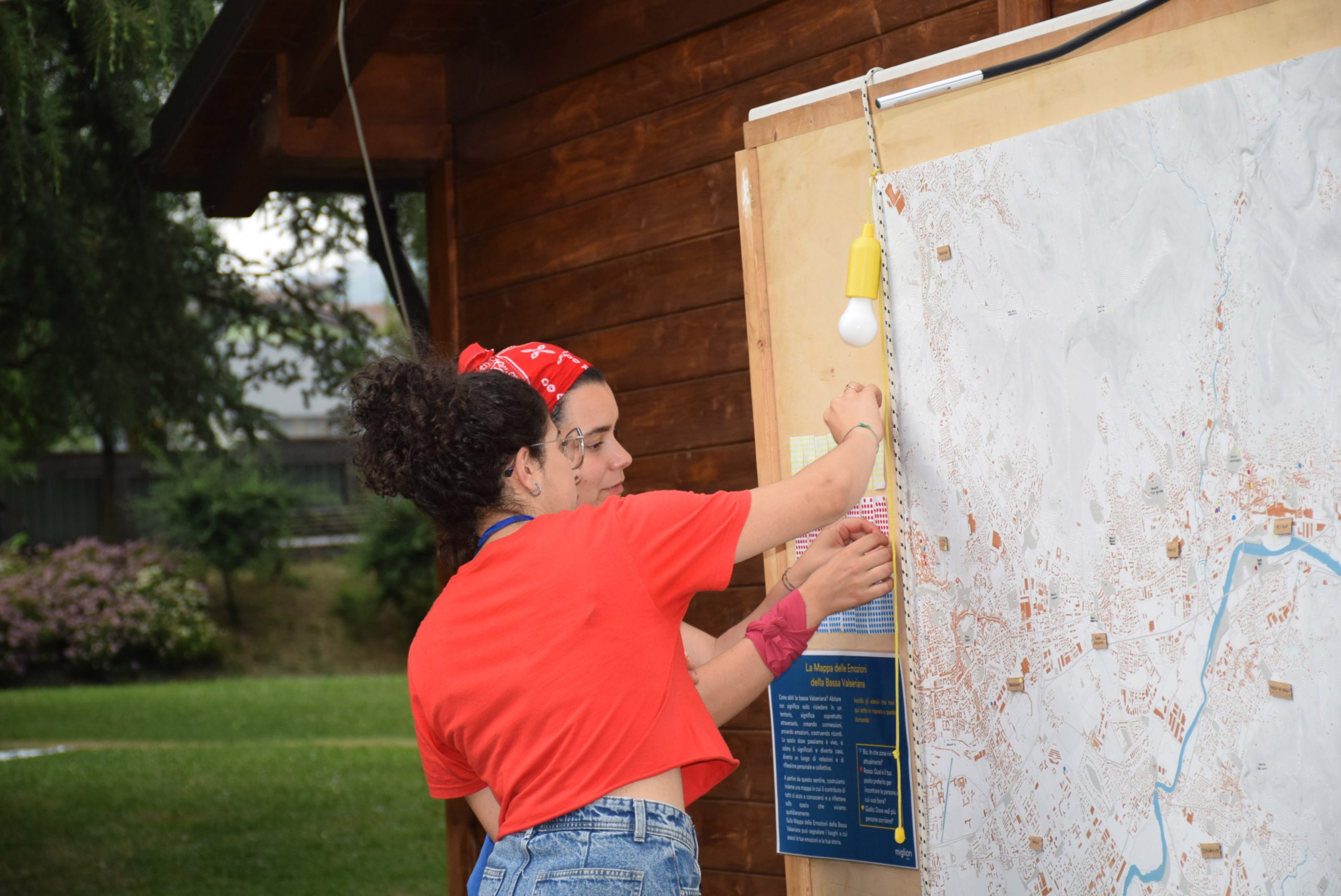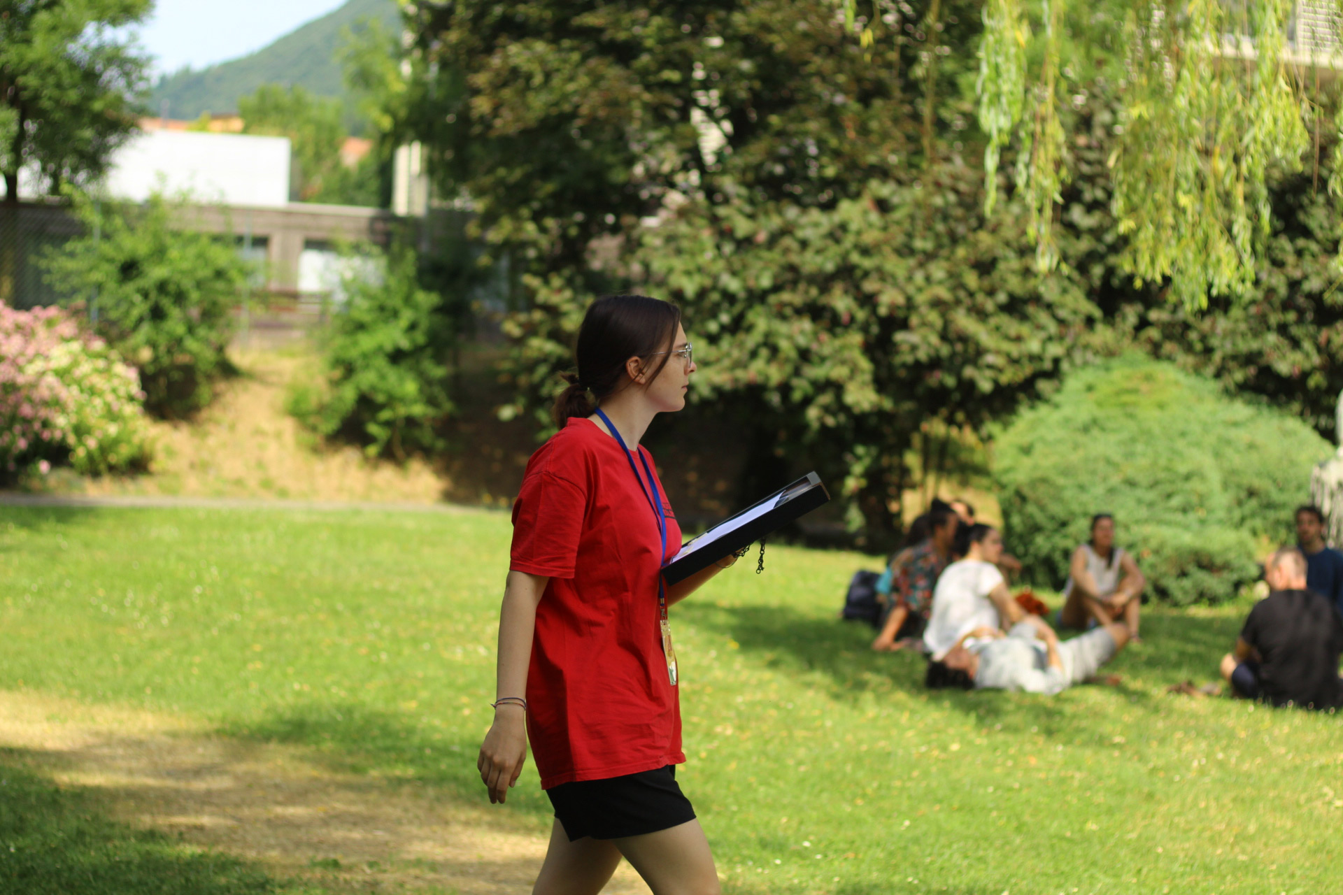 Dopo ore sfiancanti di montaggio, il parco è pronto ad accogliere giovani, famiglie e cittadinɜ che vogliono immergersi in questo spazio vivo e vivace: all'ingresso non può che esserci il gazebo blu; appesi tutto intorno si notano cartelli per arrivare ad ogni dove; tesi tra gli alberi sventolano festoni artigianali; tra il verde risaltano striscioni con inni di libertà. Così si apre il Festival! Vengono inaugurate la rassegna di ritratti dal titolo “Personale e collettivo” di Francesca Pelliccioli, e la mostra fotografica di Gaia Orlando, intitolata “Cosa vedi all’orizzonte”. Le loro opere sbucano tra le siepi del parco, dove la gente inizia a passeggiare e osservare. La Mappa del Cuore, dove lɜ visitatorɜ del parco possono indicare i luoghi in cui si sentono più felici e dove trascorrono il loro tempo con persone care, comincia a riempirsi di tanti piccoli adesivi tondi e colorati. Dietro le quinte (ma neanche troppo) tante apette in maglietta rossa si muovono frenetiche per risolvere in fretta ogni piccolo impiccio...