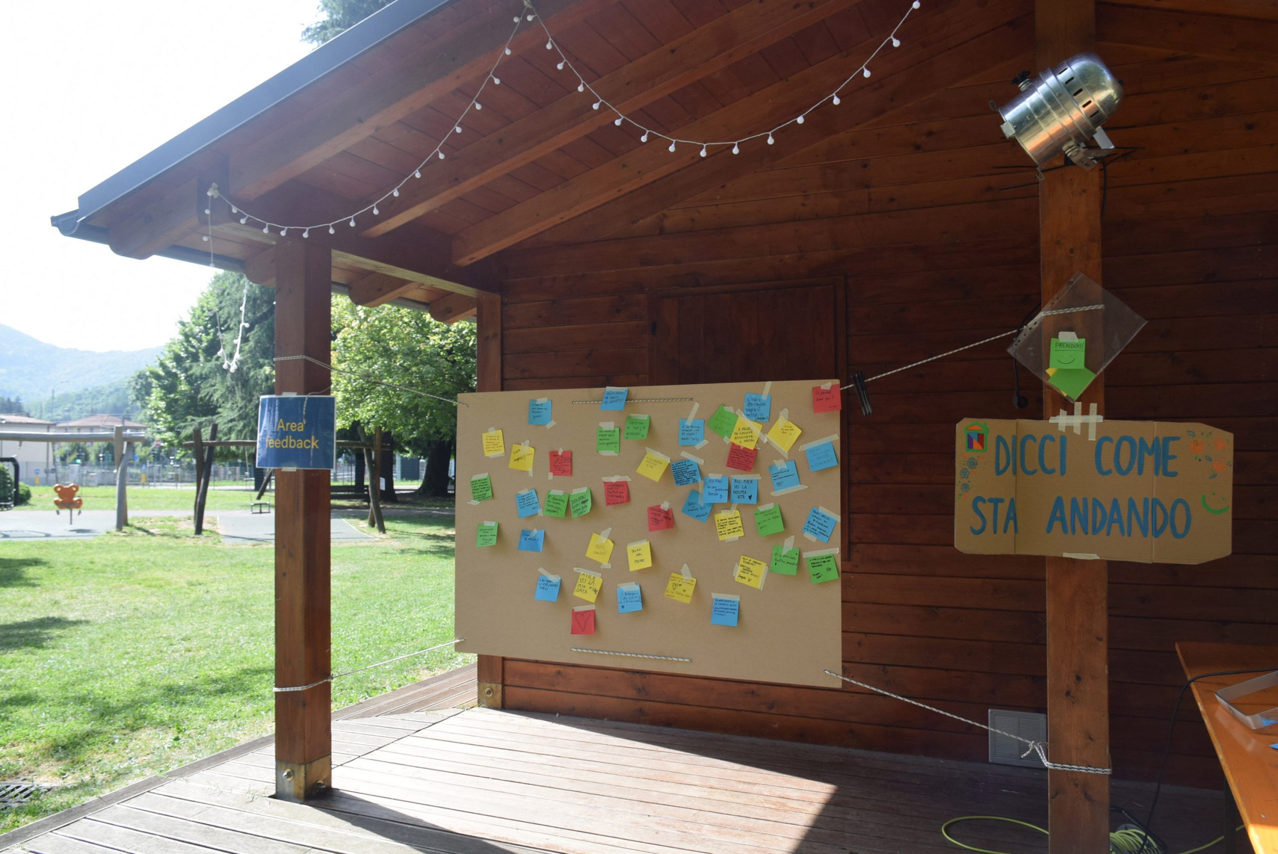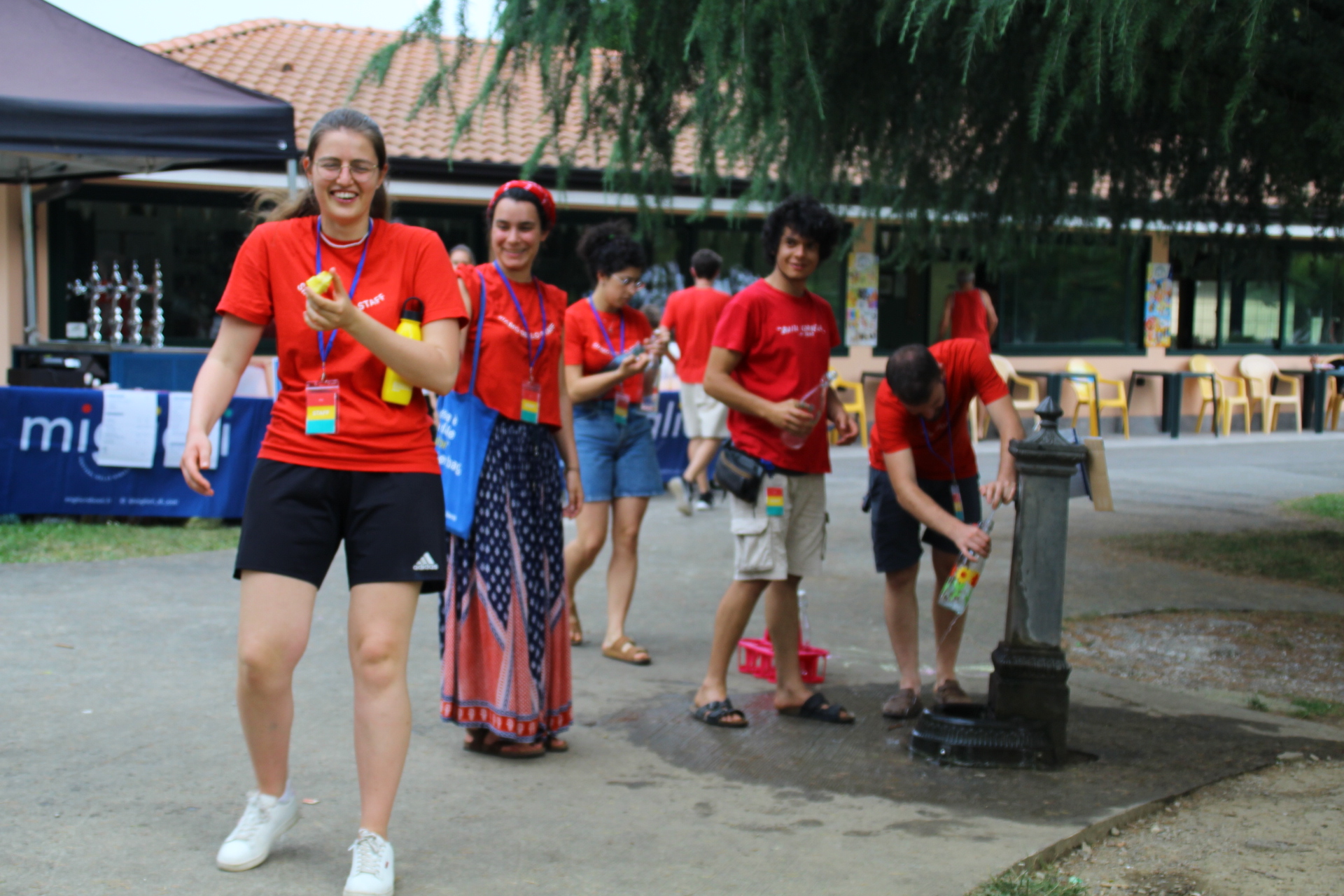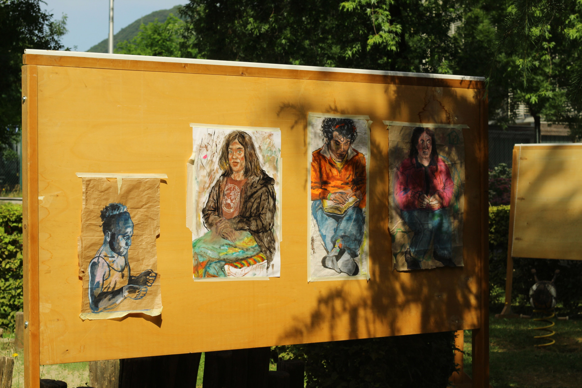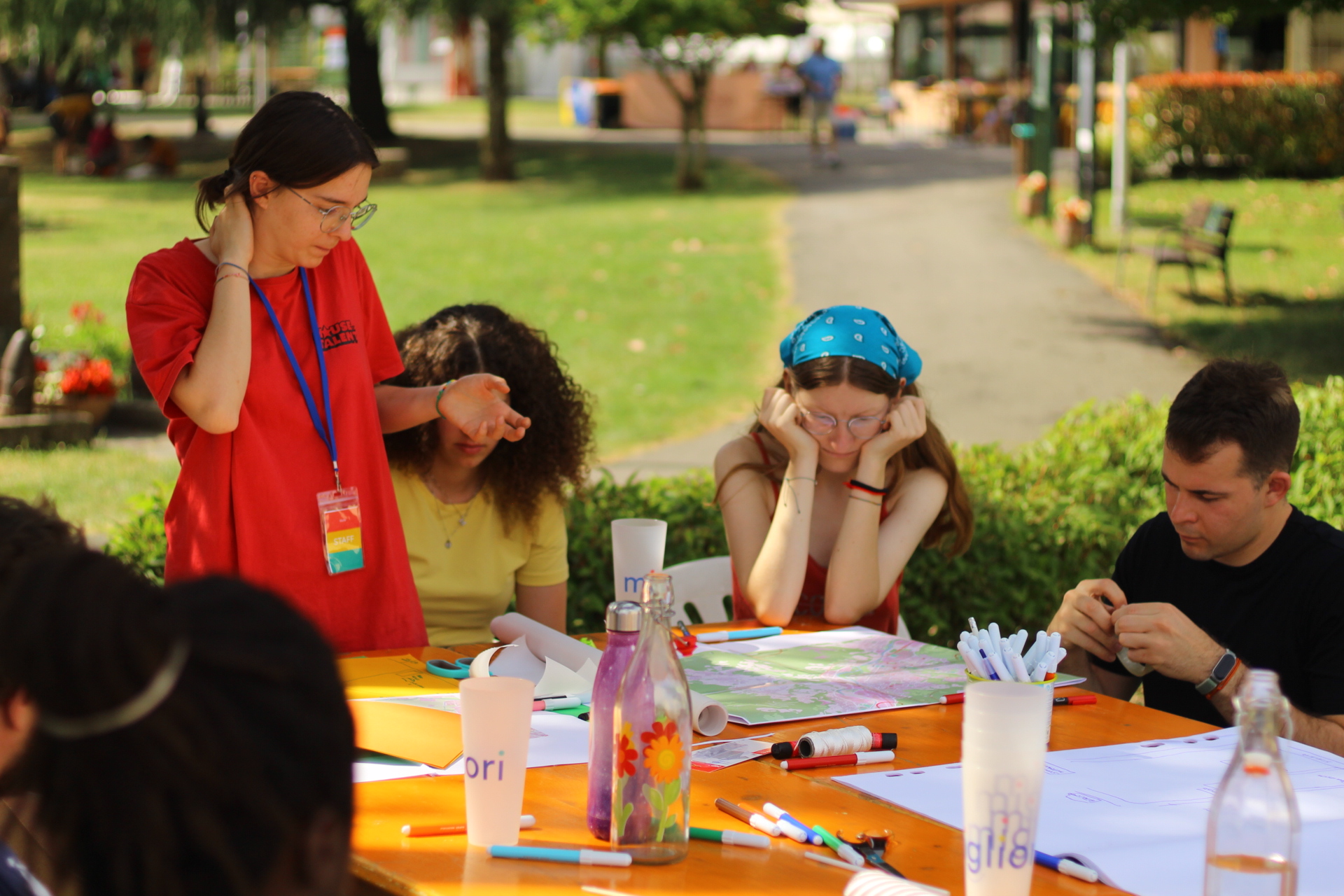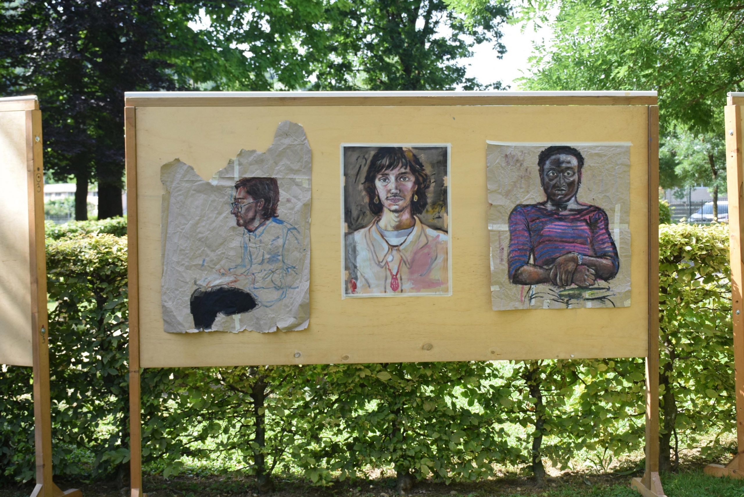 Dopo ore sfiancanti di montaggio, il parco è pronto ad accogliere giovani, famiglie e cittadinɜ che vogliono immergersi in questo spazio vivo e vivace: all'ingresso non può che esserci il gazebo blu; appesi tutto intorno si notano cartelli per arrivare ad ogni dove; tesi tra gli alberi sventolano festoni artigianali; tra il verde risaltano striscioni con inni di libertà. Così si apre il Festival! Vengono inaugurate la rassegna di ritratti dal titolo “Personale e collettivo” di Francesca Pelliccioli, e la mostra fotografica di Gaia Orlando, intitolata “Cosa vedi all’orizzonte”. Le loro opere sbucano tra le siepi del parco, dove la gente inizia a passeggiare e osservare. La Mappa del Cuore, dove lɜ visitatorɜ del parco possono indicare i luoghi in cui si sentono più felici e dove trascorrono il loro tempo con persone care, comincia a riempirsi di tanti piccoli adesivi tondi e colorati. Dietro le quinte (ma neanche troppo) tante apette in maglietta rossa si muovono frenetiche per risolvere in fretta ogni piccolo impiccio...