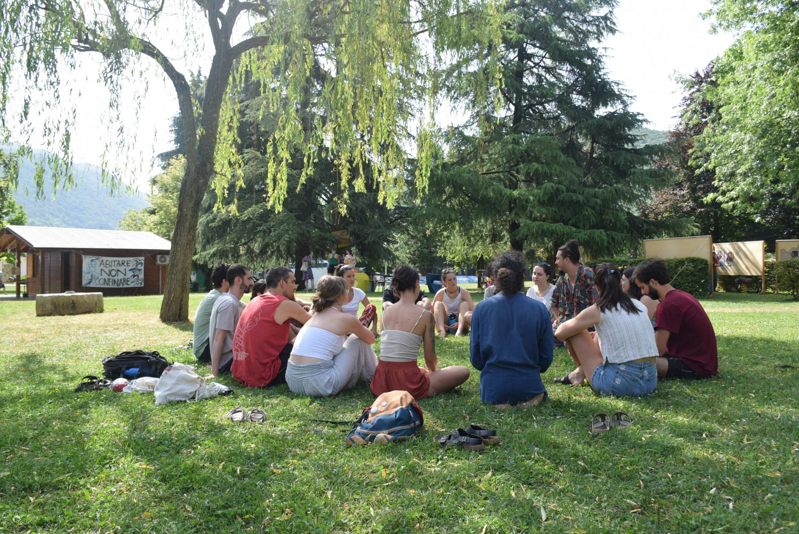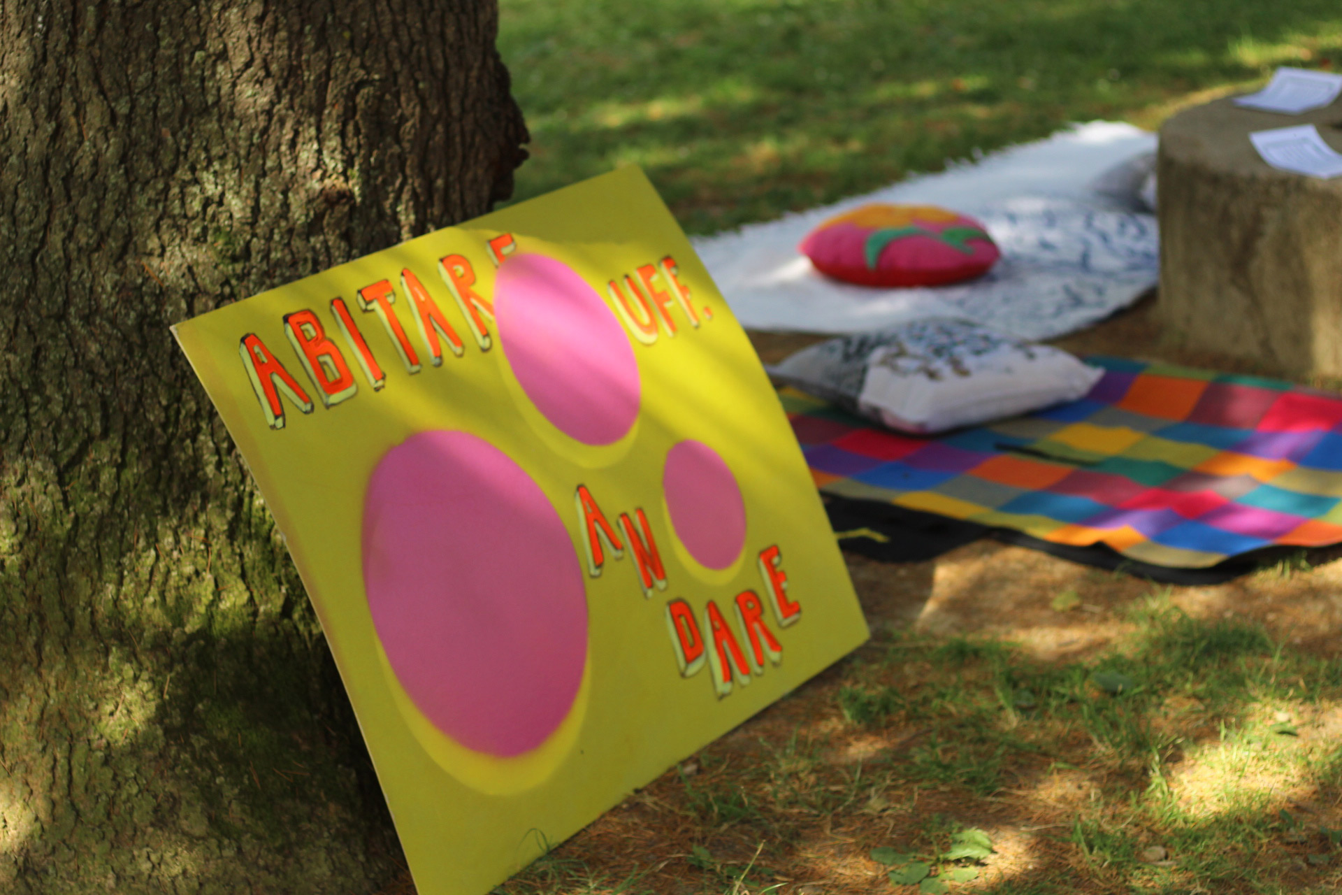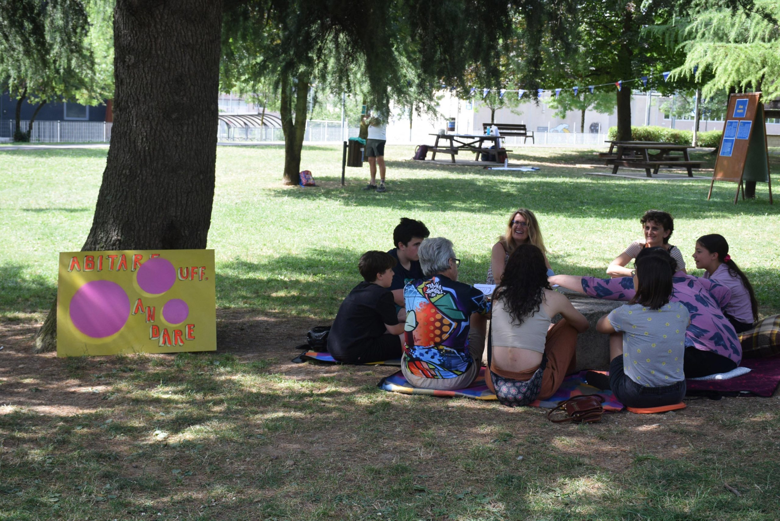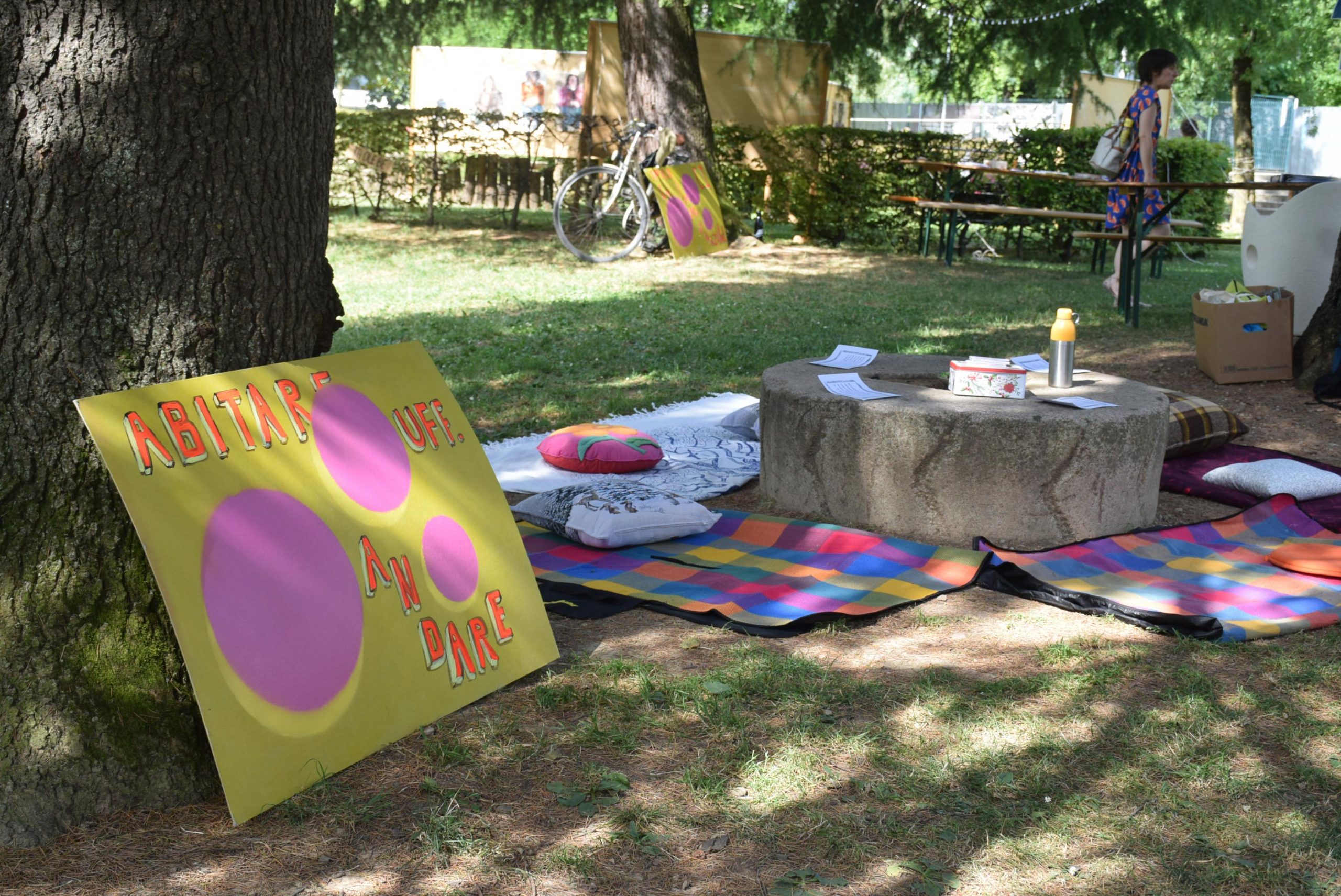 Il parco si sveglia domenica mattina brulicante di gruppi che propongono diverse attività a tema "abitare": Teatro Selvatico si trasferisce per il suo workshop teatrale immersivo al fiume Carso, mentre Orlando e Oltre l'Orto rimangono sui prati coinvolgendo lɜ più nelle loro proposte sull'abitare la propria identità e sul vivere nell'ecosistema che abbiamo intorno ; nel frattempo per lɜ bambinɜ è in corso una caccia al tesoro a tema letterario. Allo spazio associazioni Orlando, WeCare, Oltre l'Orto, Le Zitelle.
