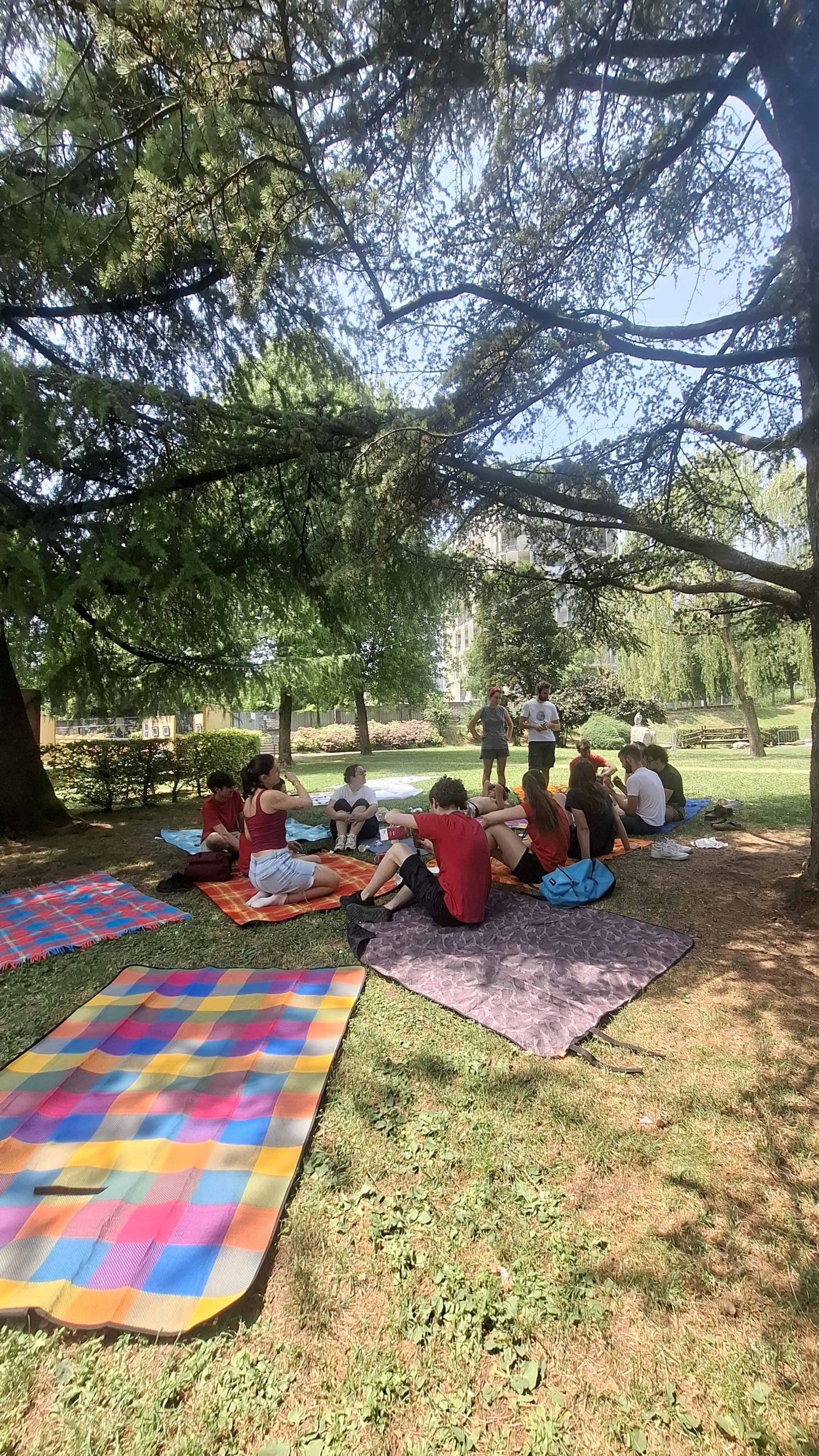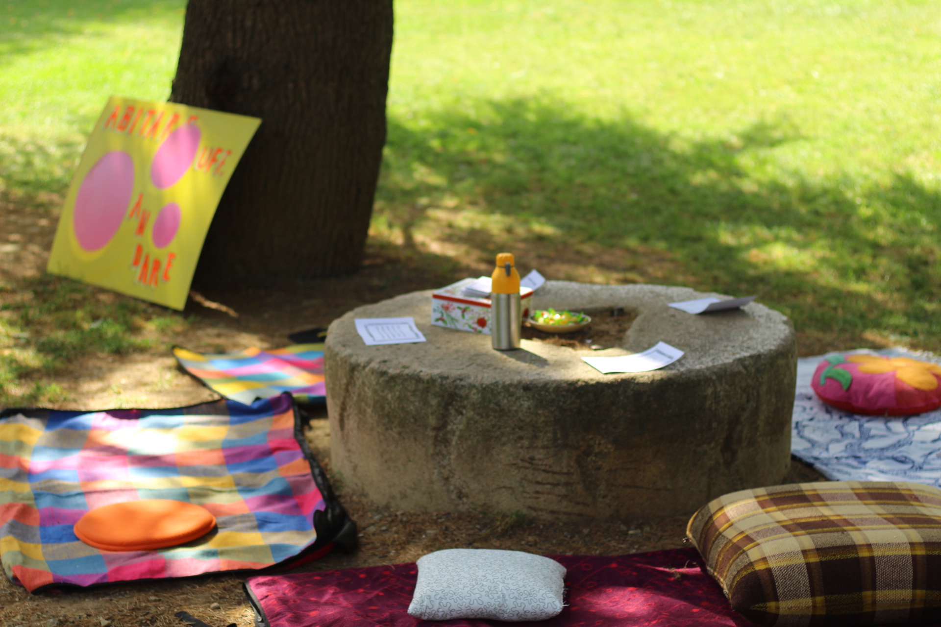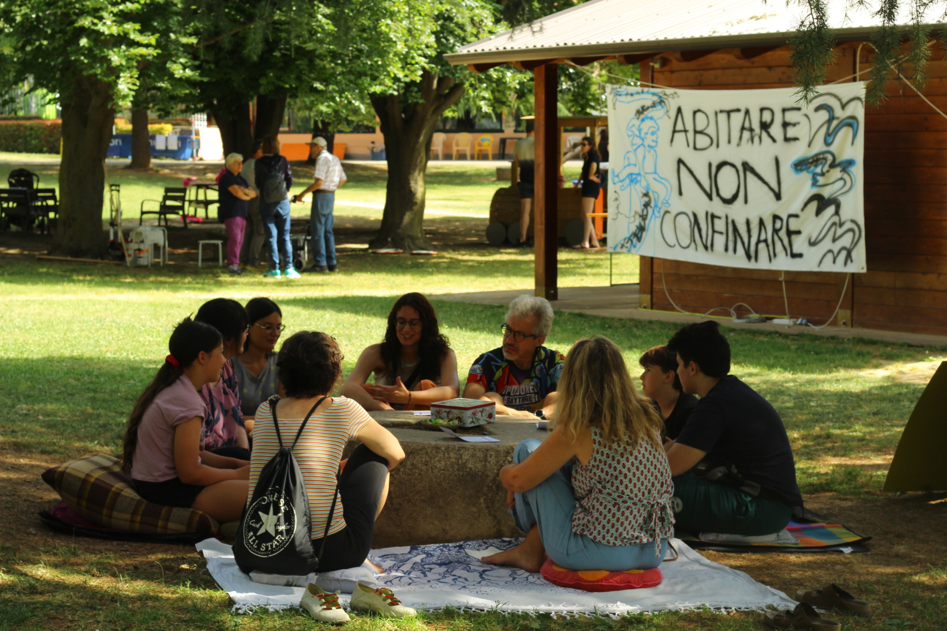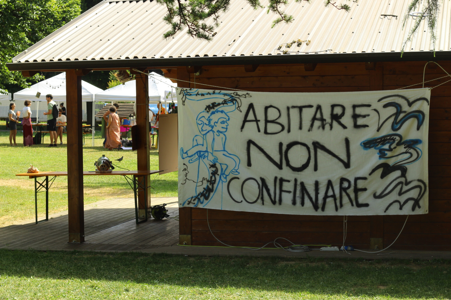Il parco si sveglia domenica mattina brulicante di gruppi che propongono diverse attività a tema "abitare": Teatro Selvatico si trasferisce per il suo workshop teatrale immersivo al fiume Carso, mentre Orlando e Oltre l'Orto rimangono sui prati coinvolgendo lɜ più nelle loro proposte sull'abitare la propria identità e sul vivere nell'ecosistema che abbiamo intorno ; nel frattempo per lɜ bambinɜ è in corso una caccia al tesoro a tema letterario. Allo spazio associazioni Orlando, WeCare, Oltre l'Orto, Le Zitelle.