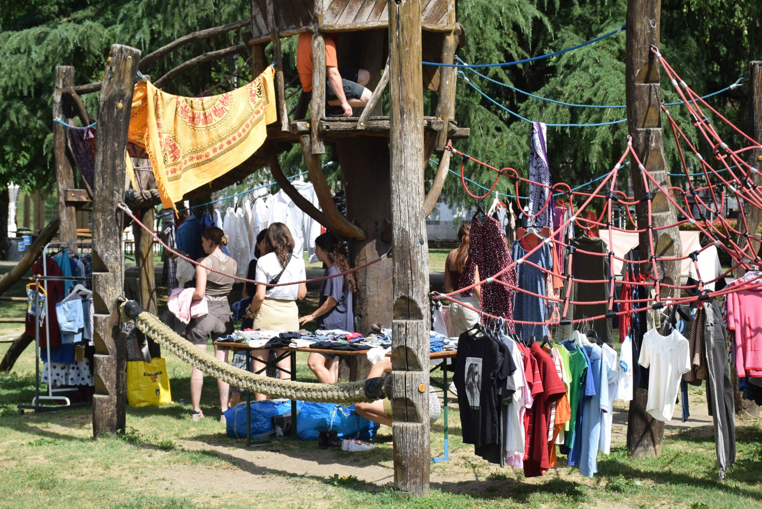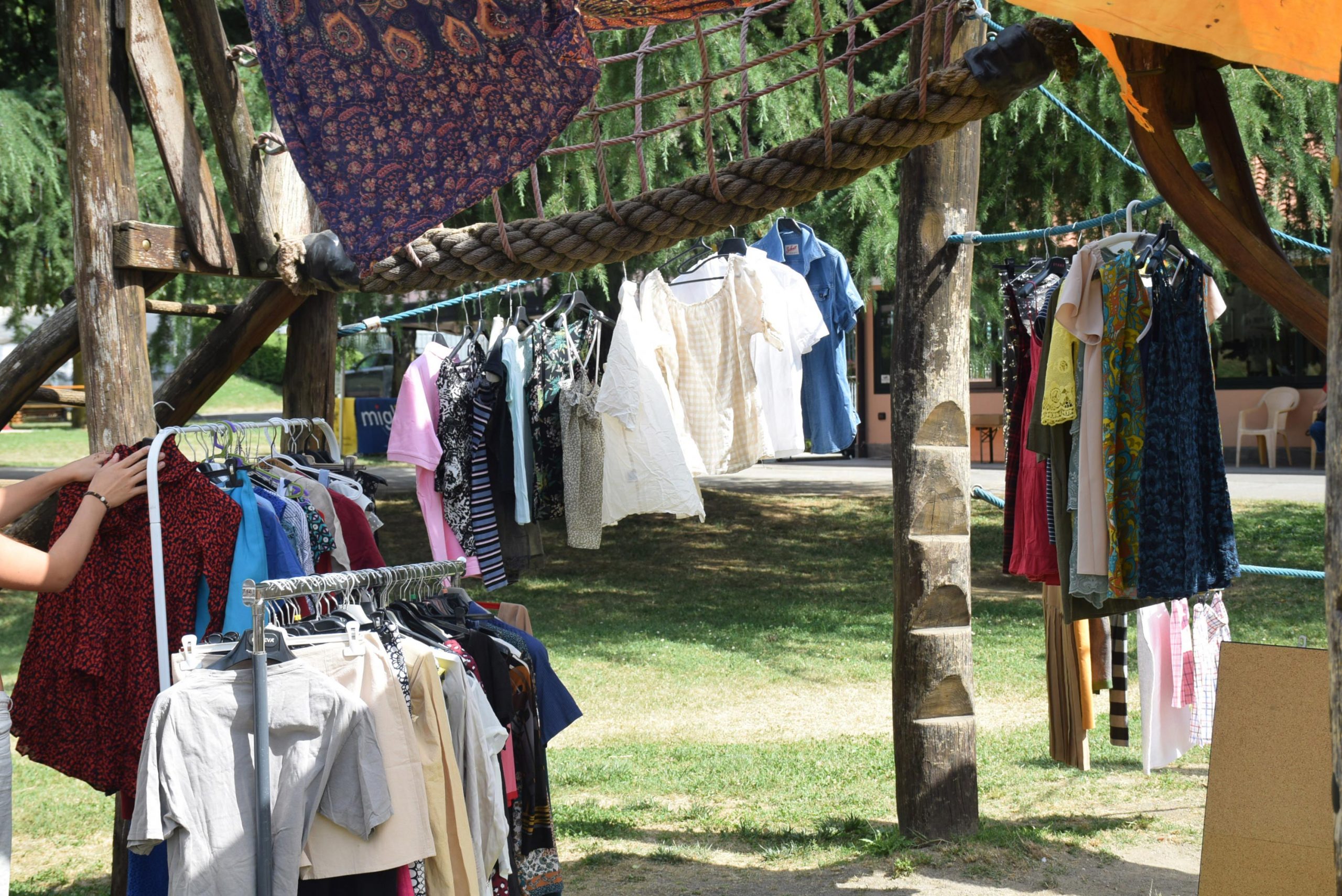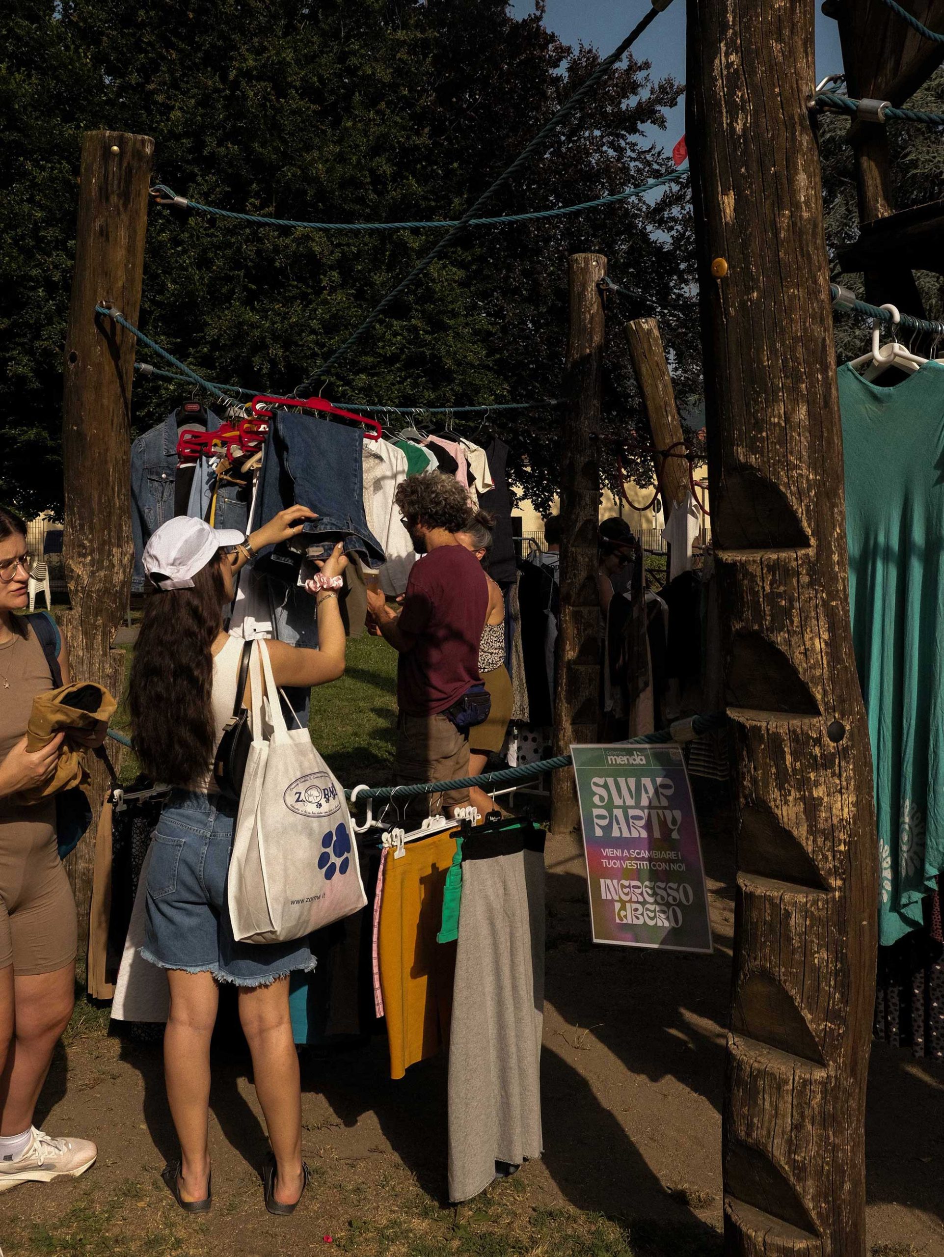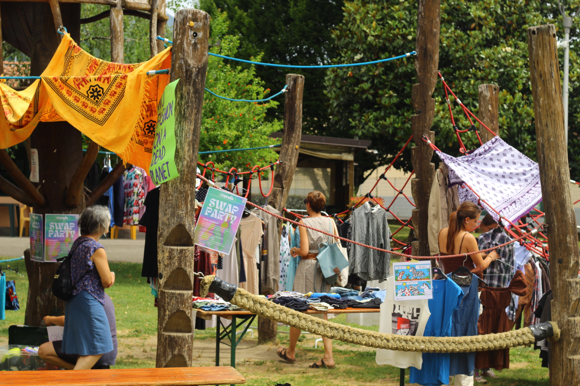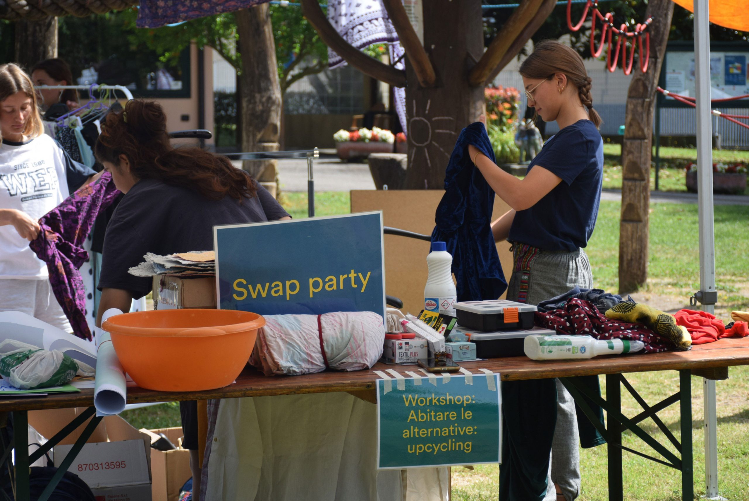 Dopo un pranzo collettivo sedutɜ all’ombra degli alberi, il festival continua anche nel pomeriggio con lo swap party e il laboratorio creativo del collettivo Mendà e del Clan scout Alzano-Nembro: la casetta sopraelevata e le sue funi ora sono un emporio a cielo aperto portano appesi magliette, jeans, abiti colorati ed accessori pronti per essere presi e rivalorizzati con perline, strass, nastri, bottoni, e chi più ne ha più ne metta! Poco lontano c'è chi prova a stare in equilibrio su qualche slack-line, si riposa sui teli nell'Area Chill o vuole raccontare come si sente sulla bacheca colorata. Nell’area delle associazioni, si presentano allɜ visitatorɜ Medici senza frontiere, Azimut Cafè, Fridays for future, Plastic Free BG e Libera Valle Seriana.
