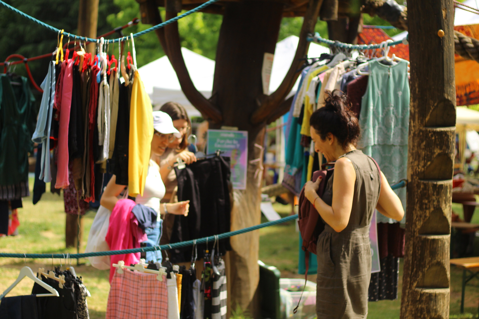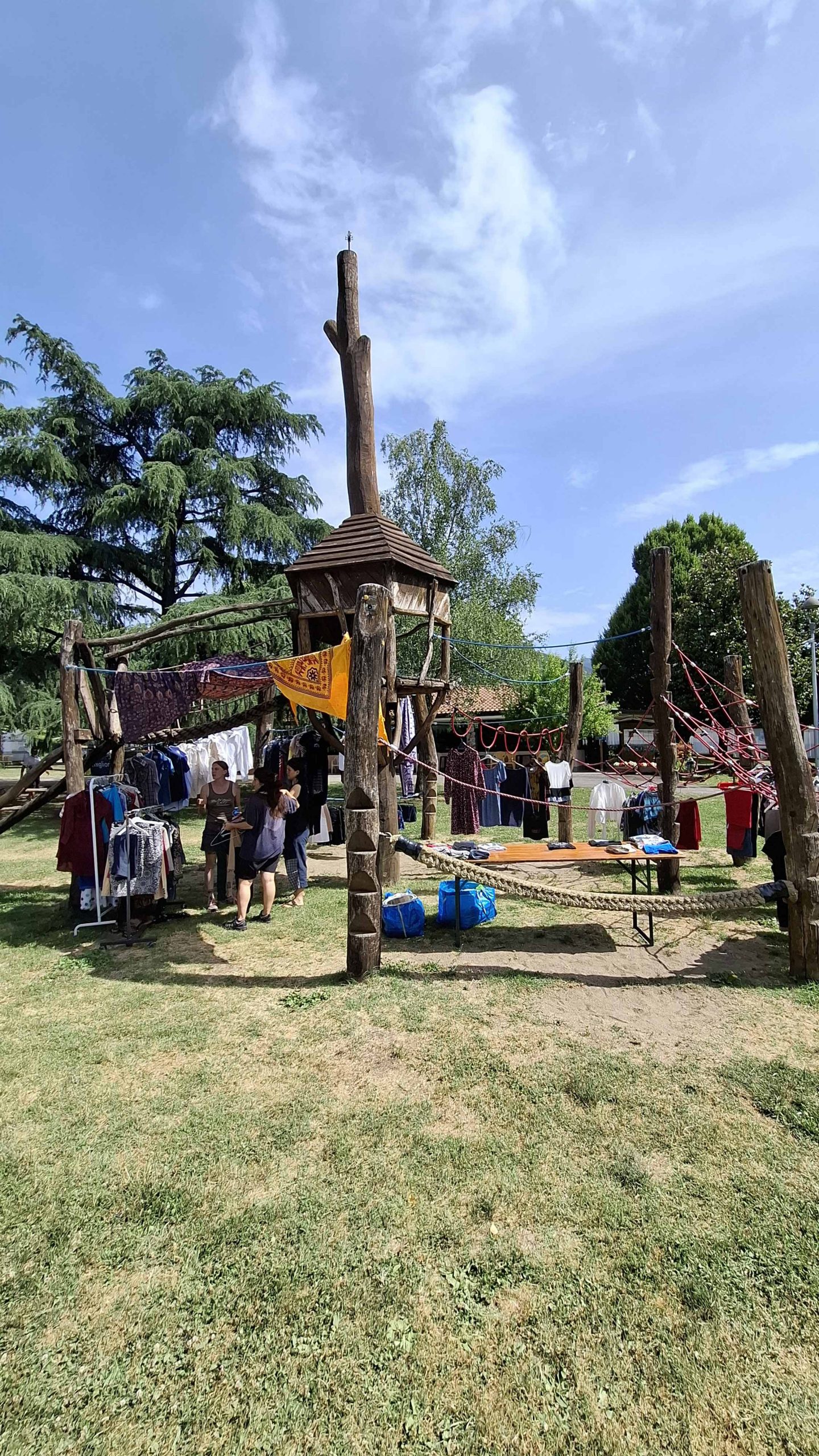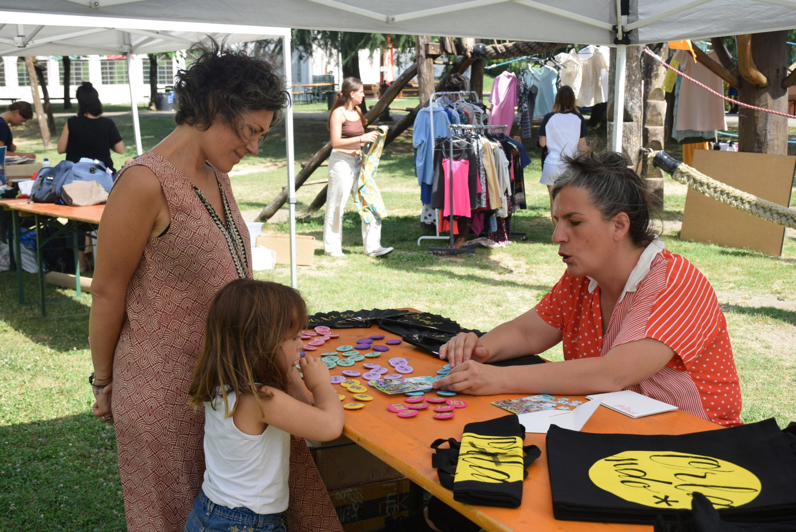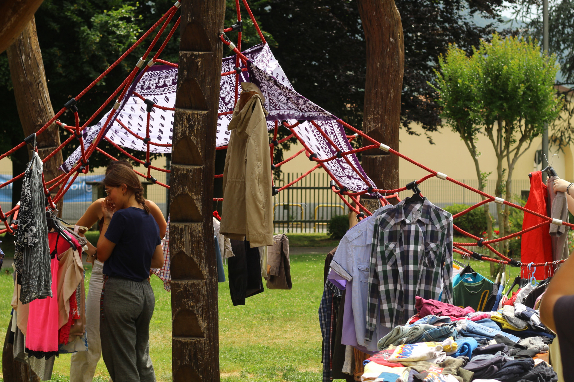 Dopo un pranzo collettivo sedutɜ all’ombra degli alberi, il festival continua anche nel pomeriggio con lo swap party e il laboratorio creativo del collettivo Mendà e del Clan scout Alzano-Nembro: la casetta sopraelevata e le sue funi ora sono un emporio a cielo aperto portano appesi magliette, jeans, abiti colorati ed accessori pronti per essere presi e rivalorizzati con perline, strass, nastri, bottoni, e chi più ne ha più ne metta! Poco lontano c'è chi prova a stare in equilibrio su qualche slack-line, si riposa sui teli nell'Area Chill o vuole raccontare come si sente sulla bacheca colorata. Nell’area delle associazioni, si presentano allɜ visitatorɜ Medici senza frontiere, Azimut Cafè, Fridays for future, Plastic Free BG e Libera Valle Seriana.