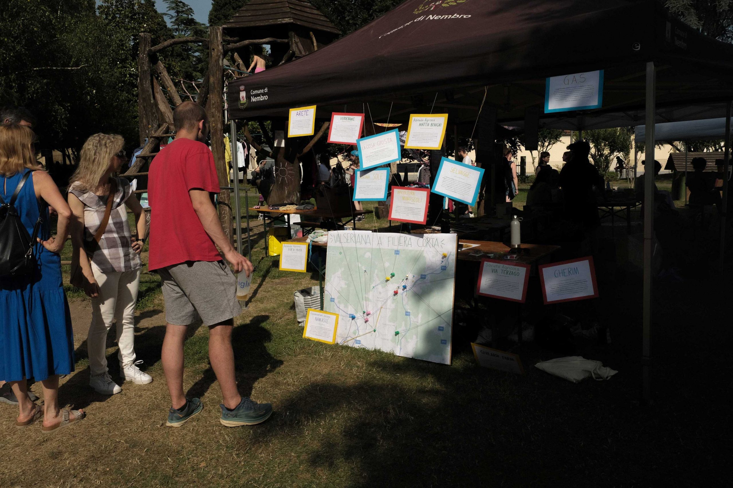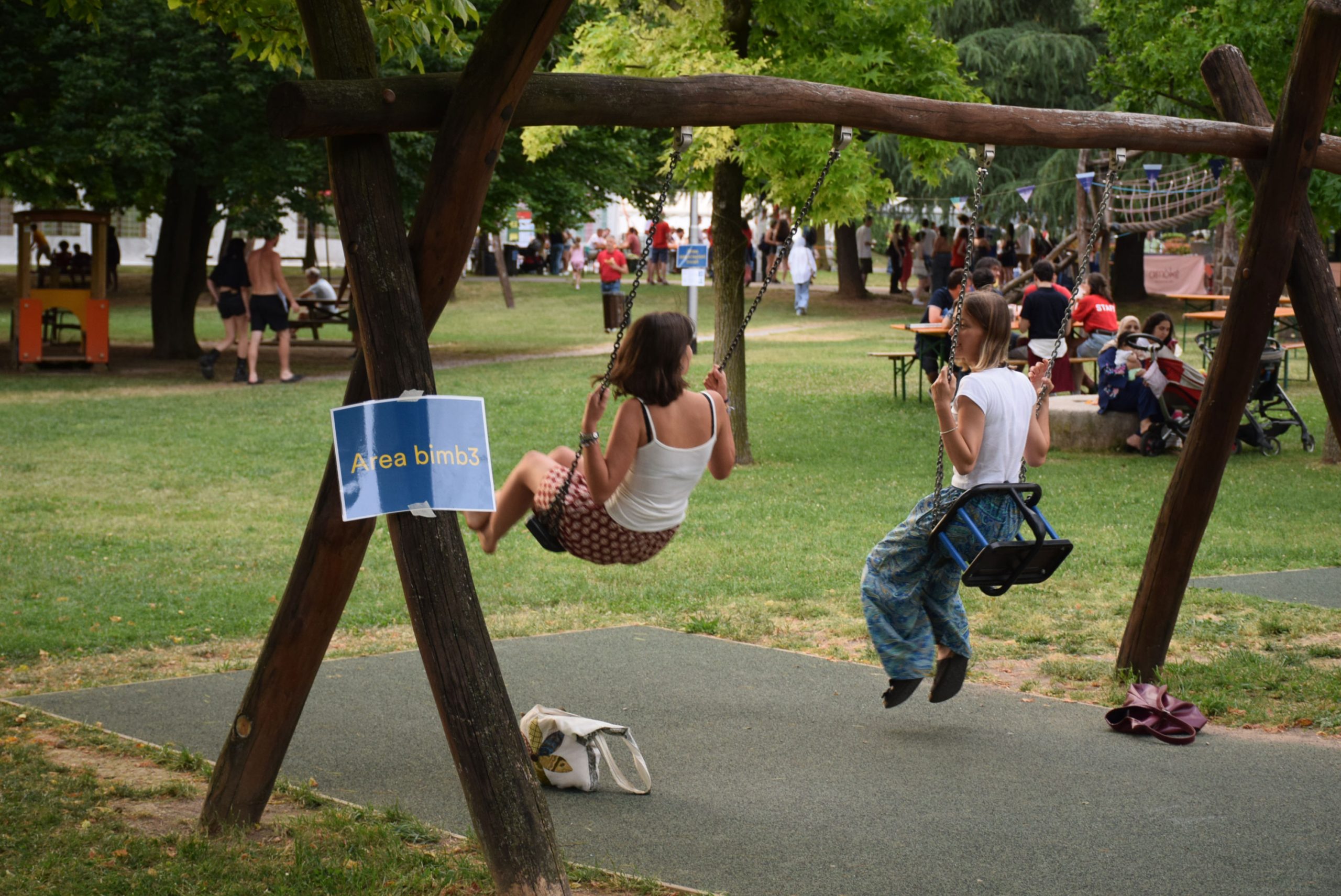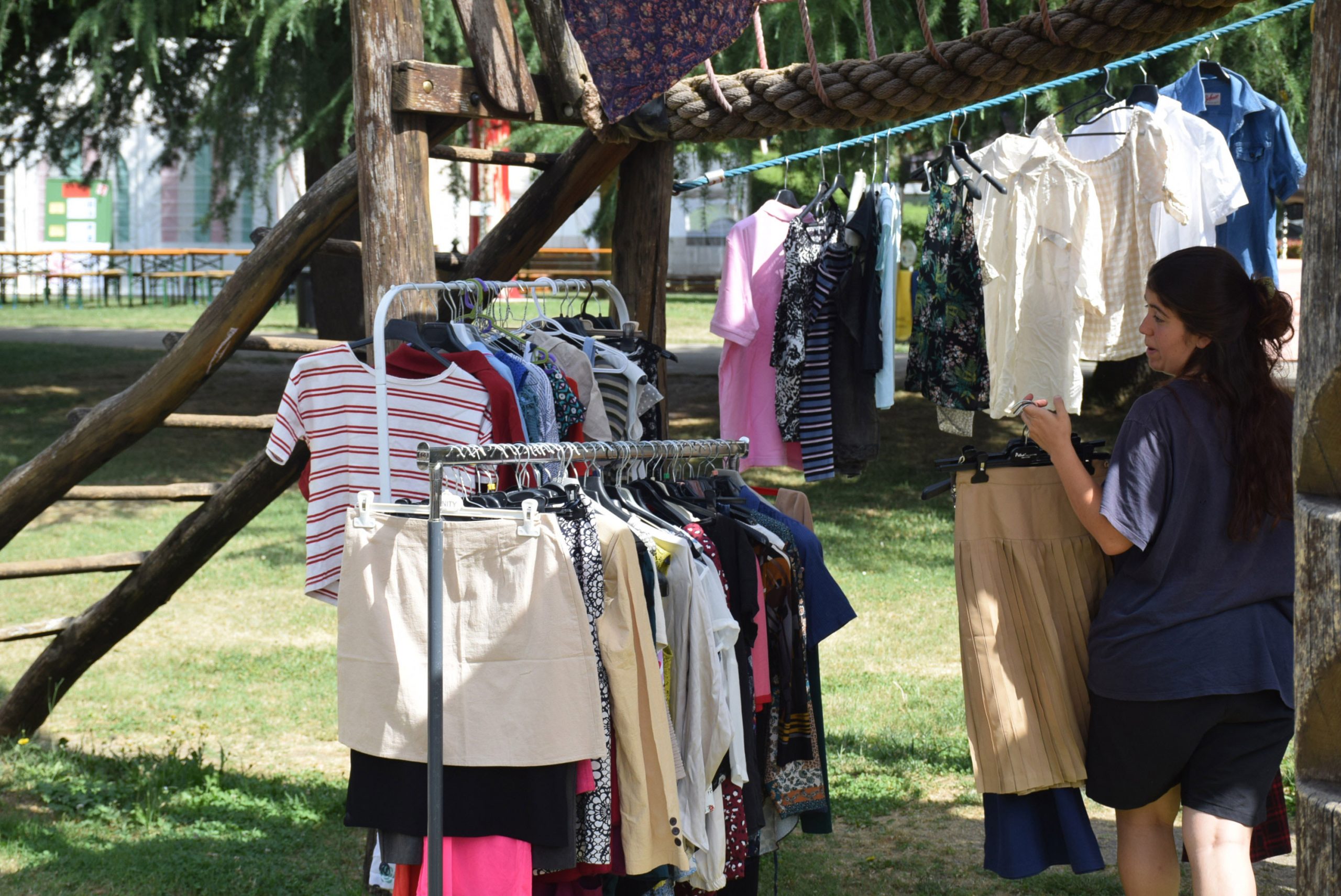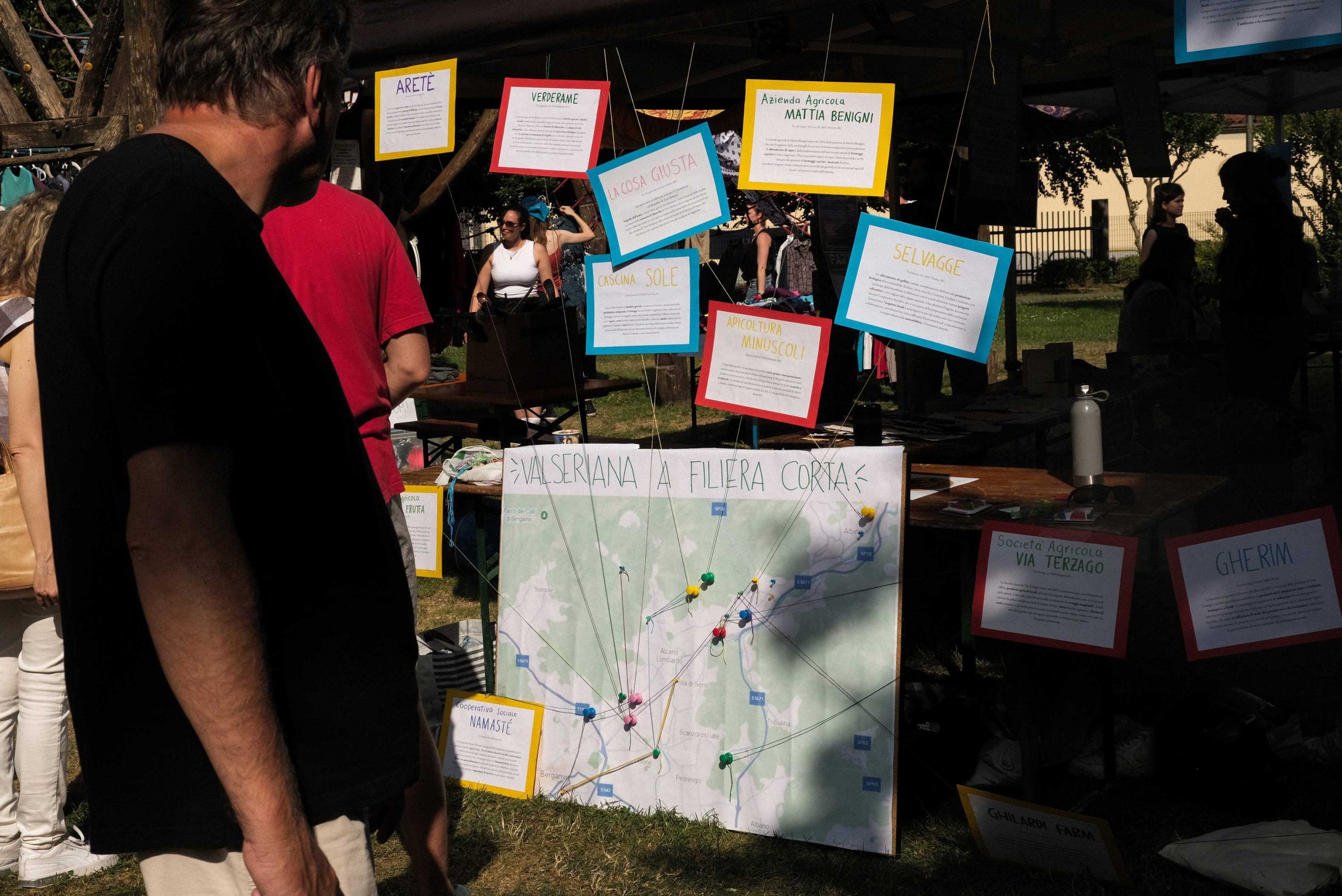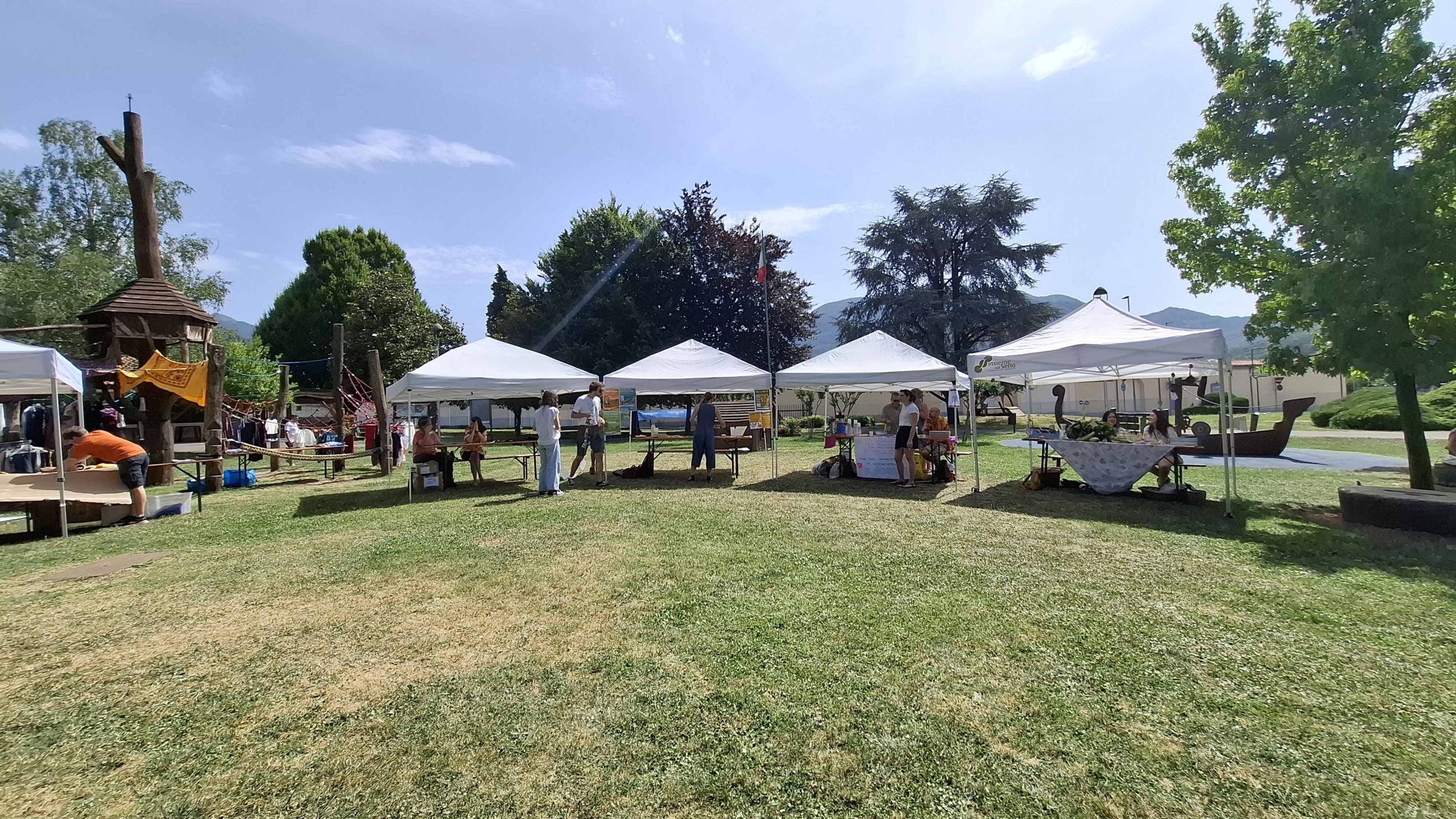 Dopo un pranzo collettivo sedutɜ all’ombra degli alberi, il festival continua anche nel pomeriggio con lo swap party e il laboratorio creativo del collettivo Mendà e del Clan scout Alzano-Nembro: la casetta sopraelevata e le sue funi ora sono un emporio a cielo aperto portano appesi magliette, jeans, abiti colorati ed accessori pronti per essere presi e rivalorizzati con perline, strass, nastri, bottoni, e chi più ne ha più ne metta! Poco lontano c'è chi prova a stare in equilibrio su qualche slack-line, si riposa sui teli nell'Area Chill o vuole raccontare come si sente sulla bacheca colorata. Nell’area delle associazioni, si presentano allɜ visitatorɜ Medici senza frontiere, Azimut Cafè, Fridays for future, Plastic Free BG e Libera Valle Seriana.