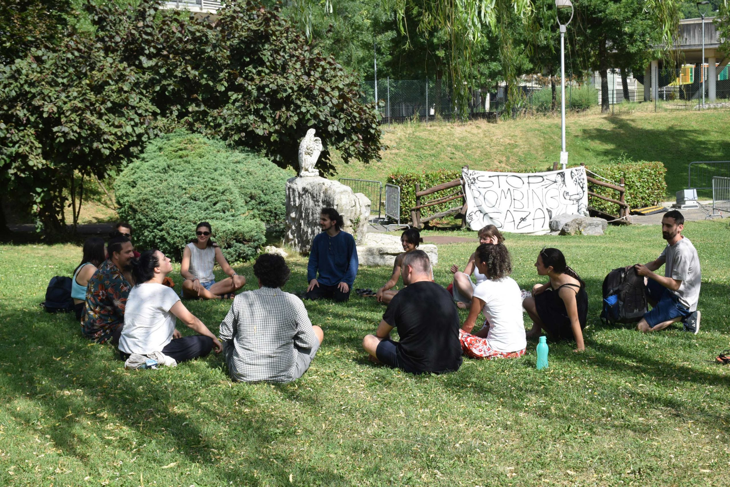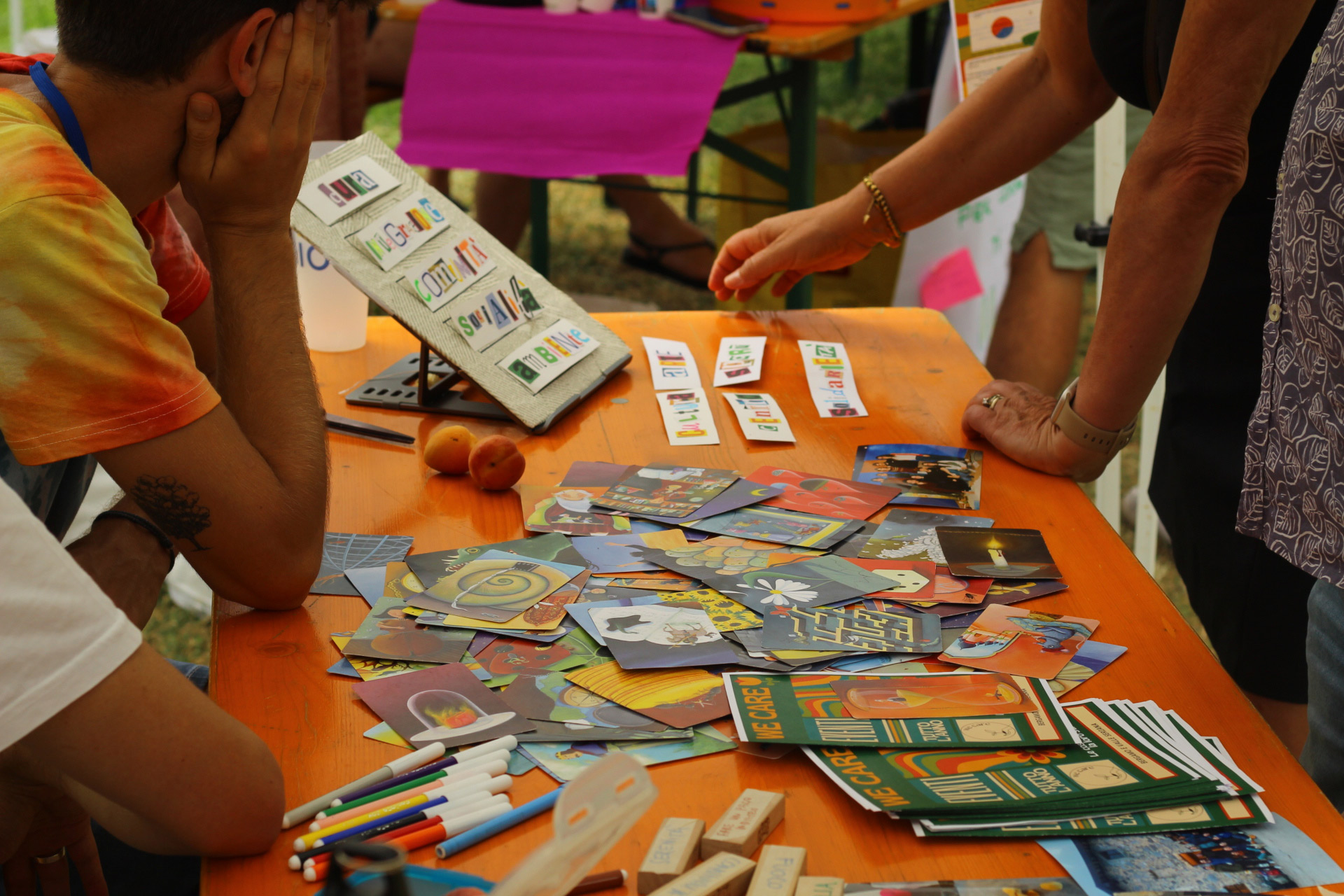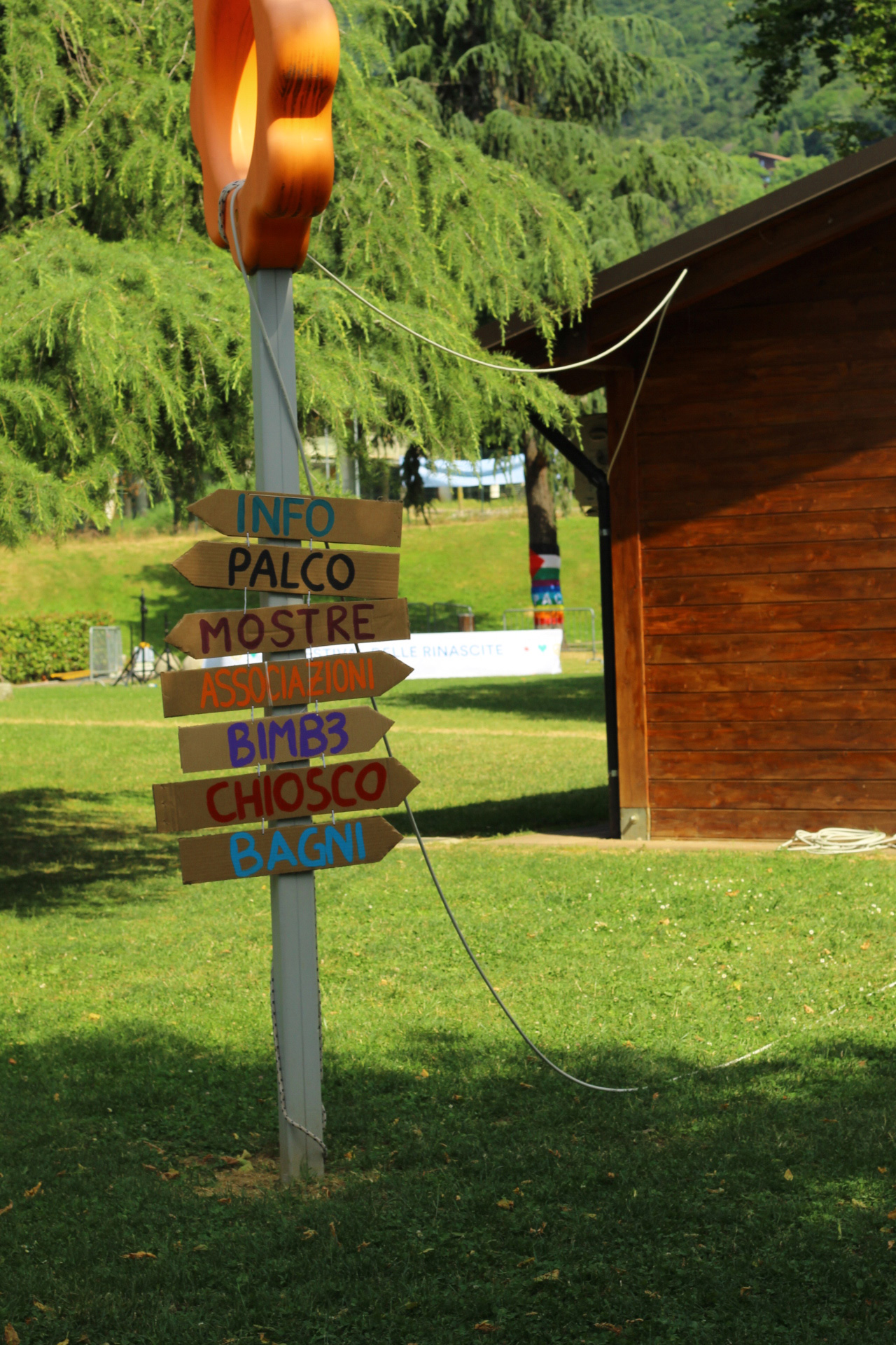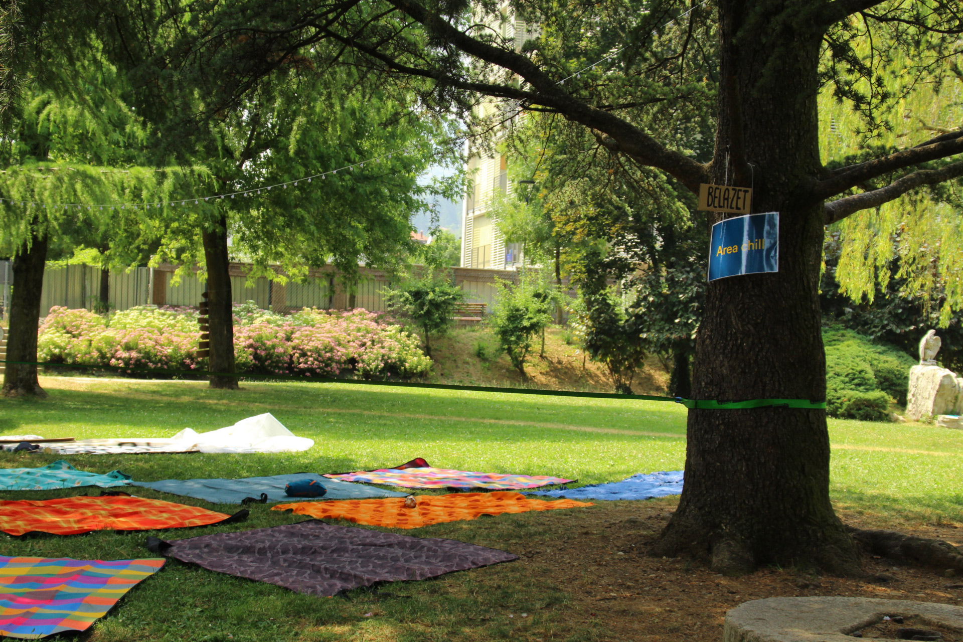Dopo un pranzo collettivo sedutɜ all’ombra degli alberi, il festival continua anche nel pomeriggio con lo swap party e il laboratorio creativo del collettivo Mendà e del Clan scout Alzano-Nembro: la casetta sopraelevata e le sue funi ora sono un emporio a cielo aperto portano appesi magliette, jeans, abiti colorati ed accessori pronti per essere presi e rivalorizzati con perline, strass, nastri, bottoni, e chi più ne ha più ne metta! Poco lontano c'è chi prova a stare in equilibrio su qualche slack-line, si riposa sui teli nell'Area Chill o vuole raccontare come si sente sulla bacheca colorata. Nell’area delle associazioni, si presentano allɜ visitatorɜ Medici senza frontiere, Azimut Cafè, Fridays for future, Plastic Free BG e Libera Valle Seriana.