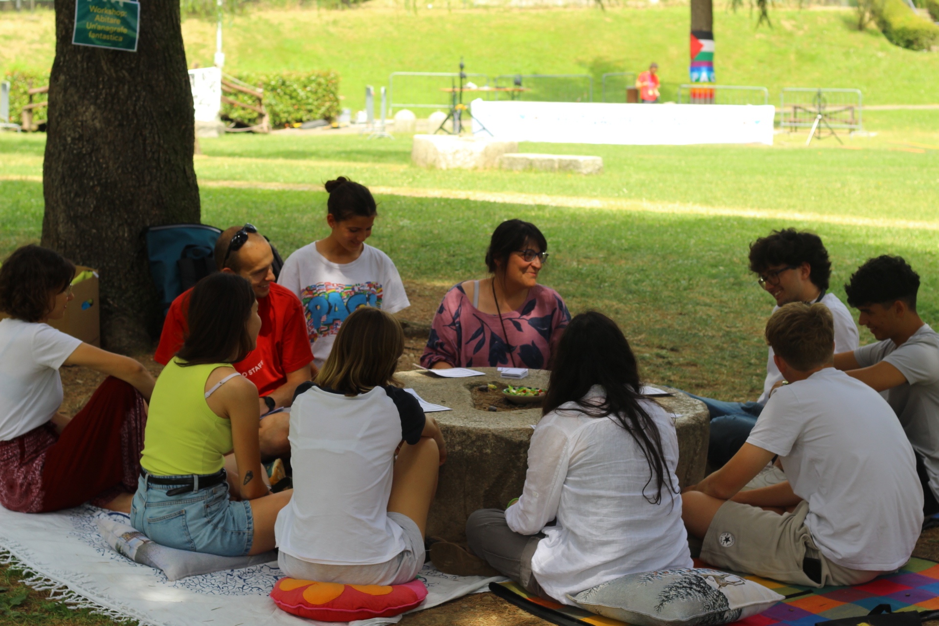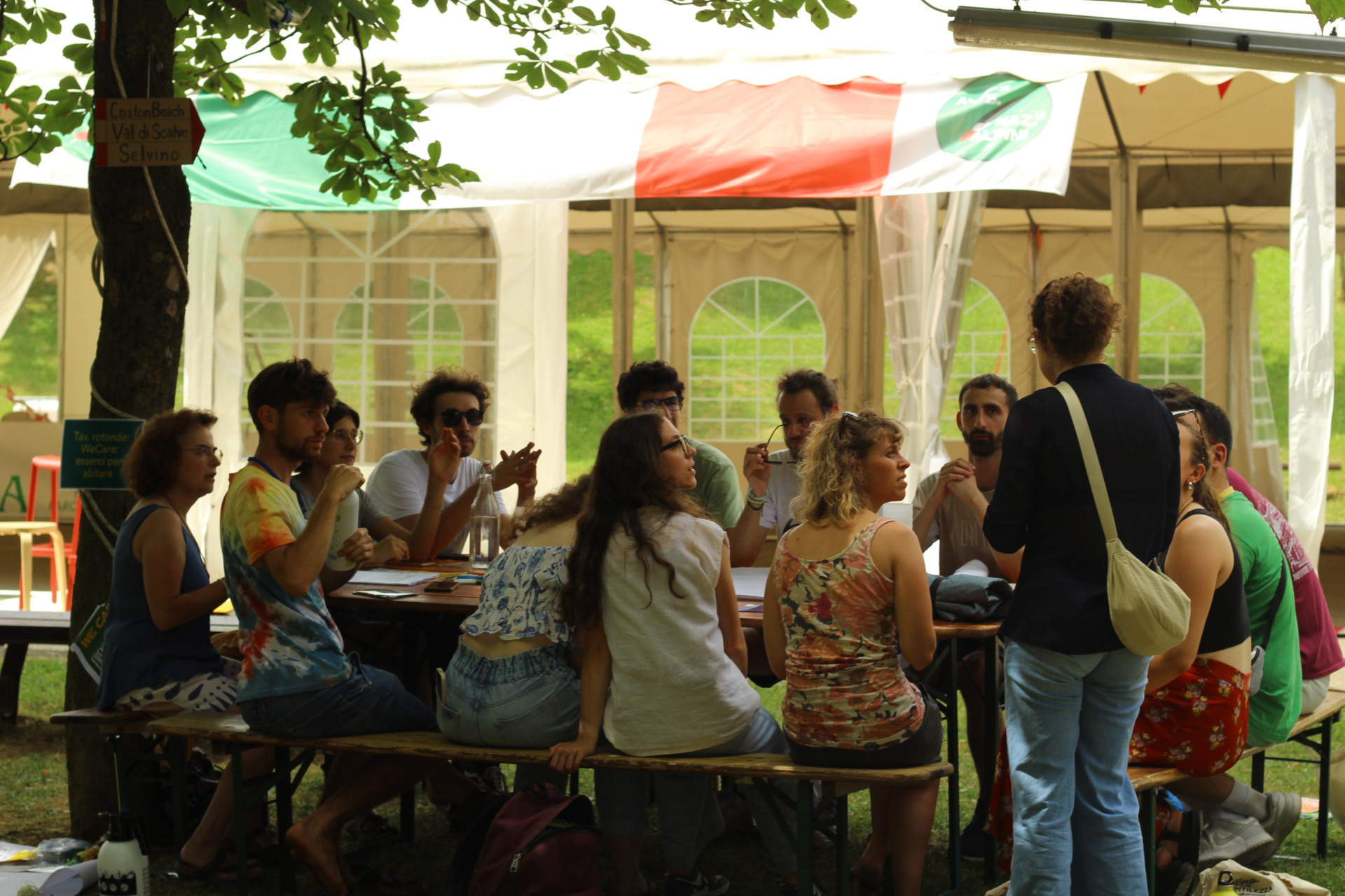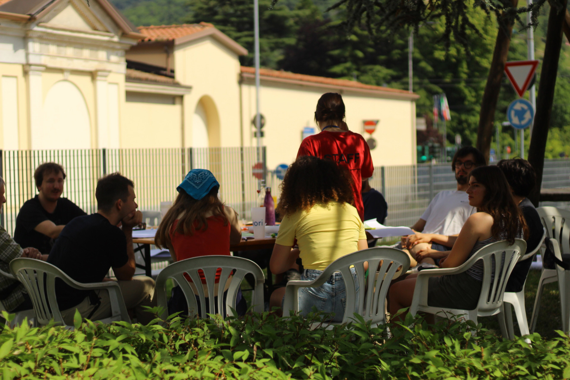 Sotto il sole cocente del primo pomeriggio hanno inizio le tavole rotonde che offrono altre occasioni per partecipare in prima persona al festival. Così, in piccoli gruppi lɜ partecipanti iniziano a condividere ciò che significa per loro abitare. Con le ACLI di Bergamo inizia una discussione sulle politiche dell’abitare a Bergamo e su come le comunità possono avere un ruolo attivo nella progettazione urbana. Con Chiara Pini si discute dell’abitare collaborativo in Italia. Il consorzio SBAM, invece, propone allɜ partecipanti di costruire insieme un condominio sociale. Infine, il gruppo WeCare e lɜ camminatorɜ di Step by Step si uniscono per un momento di restituzione delle loro rispettive esperienze, su come hanno sperimentato un nuovo modo di abitare il nostro territorio e la nostra socialità, che sia nella dimensione dell'aggregazione giovanile o nei passi sulla Via delle Sorelle.