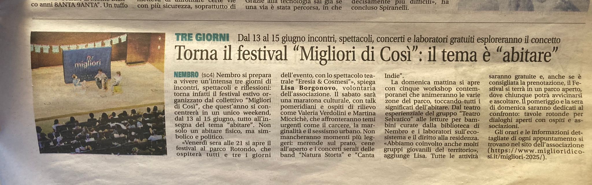Il percorso per immaginare la nuova fase di Migliori di Così comincia a settembre 2024, quando avviene la restituzione dell'ultima di 5 edizioni di Festival in piazza, si ricalibrano le energie e si raccoglie l'entusiasmo per avviarsi verso qualcosa di inesplorato. C'è chi vuole musica, chi cibo, chi vuole del verde attorno, chi una nuova sfida... Fin da subito il tema è condiviso: Abitare. Si parlerà di spazi, di casa, di città, di montagne, del bello e del brutto di vivere il nostro tempo. E proprio la riflessione sui luoghi accende nella redazione la voglia di abitare per 3 giorni un parco, il Parco Rotondo di Nembro.