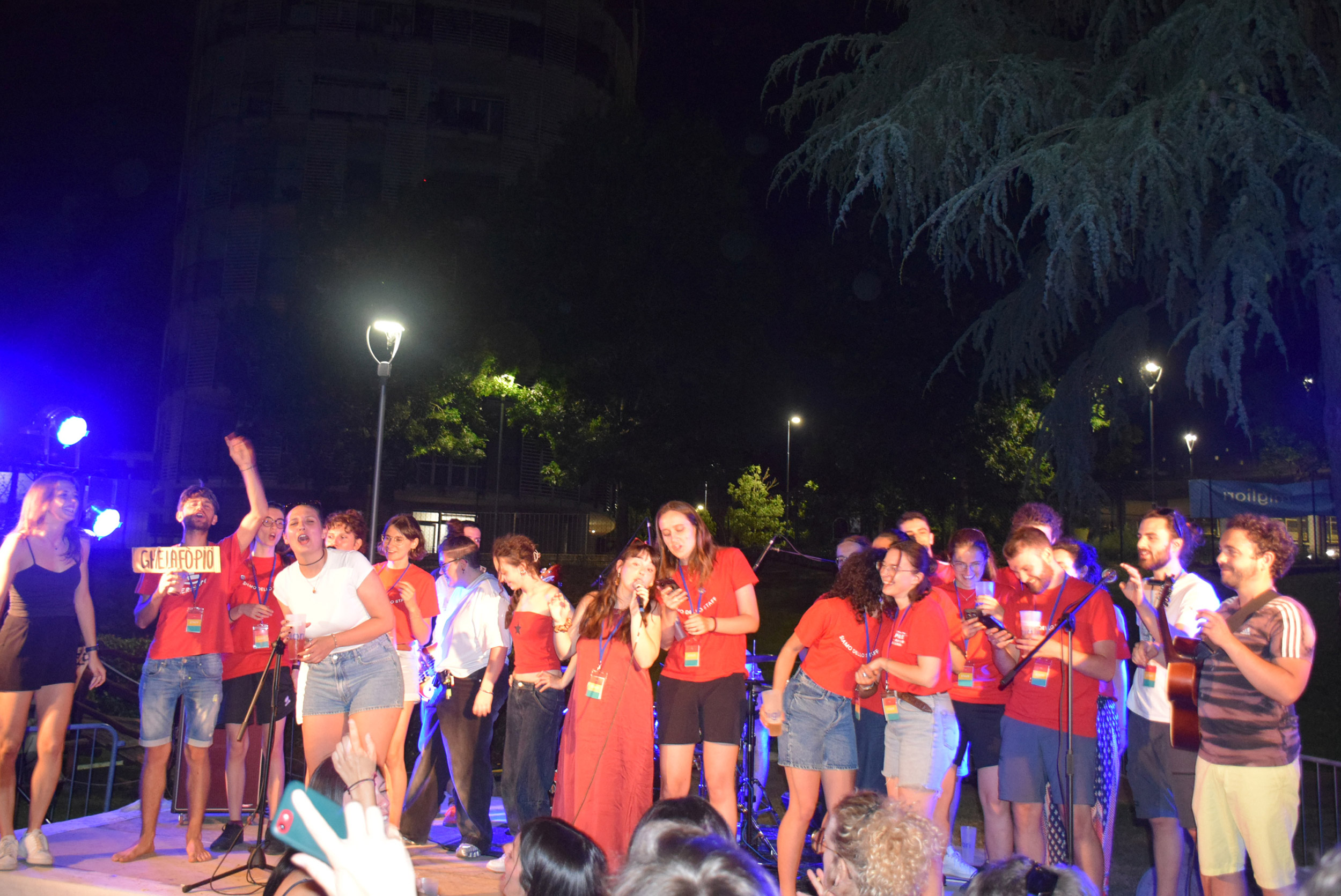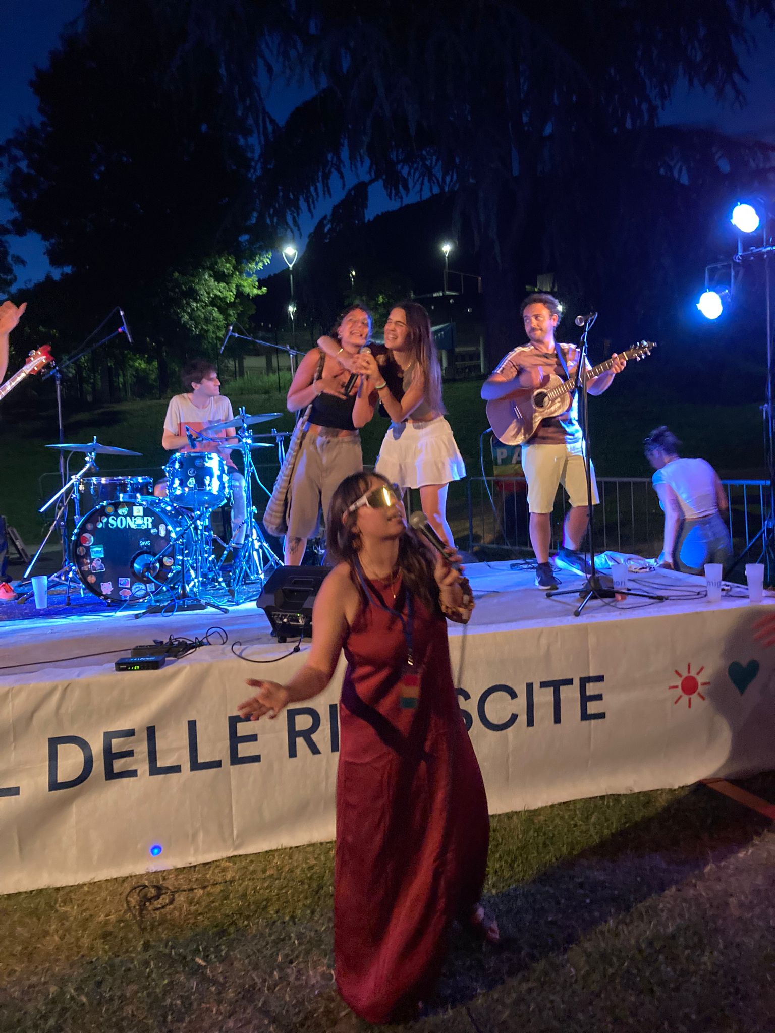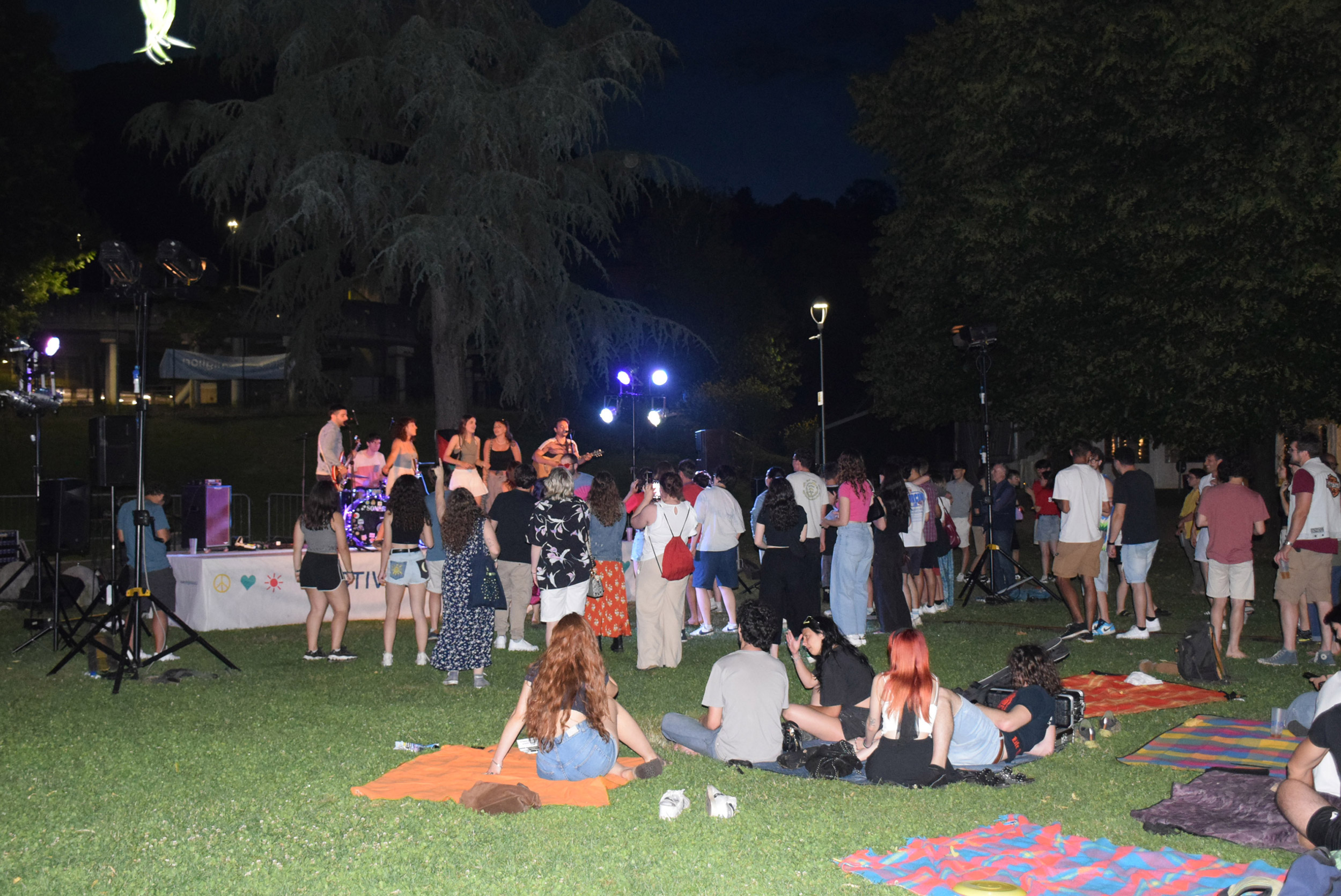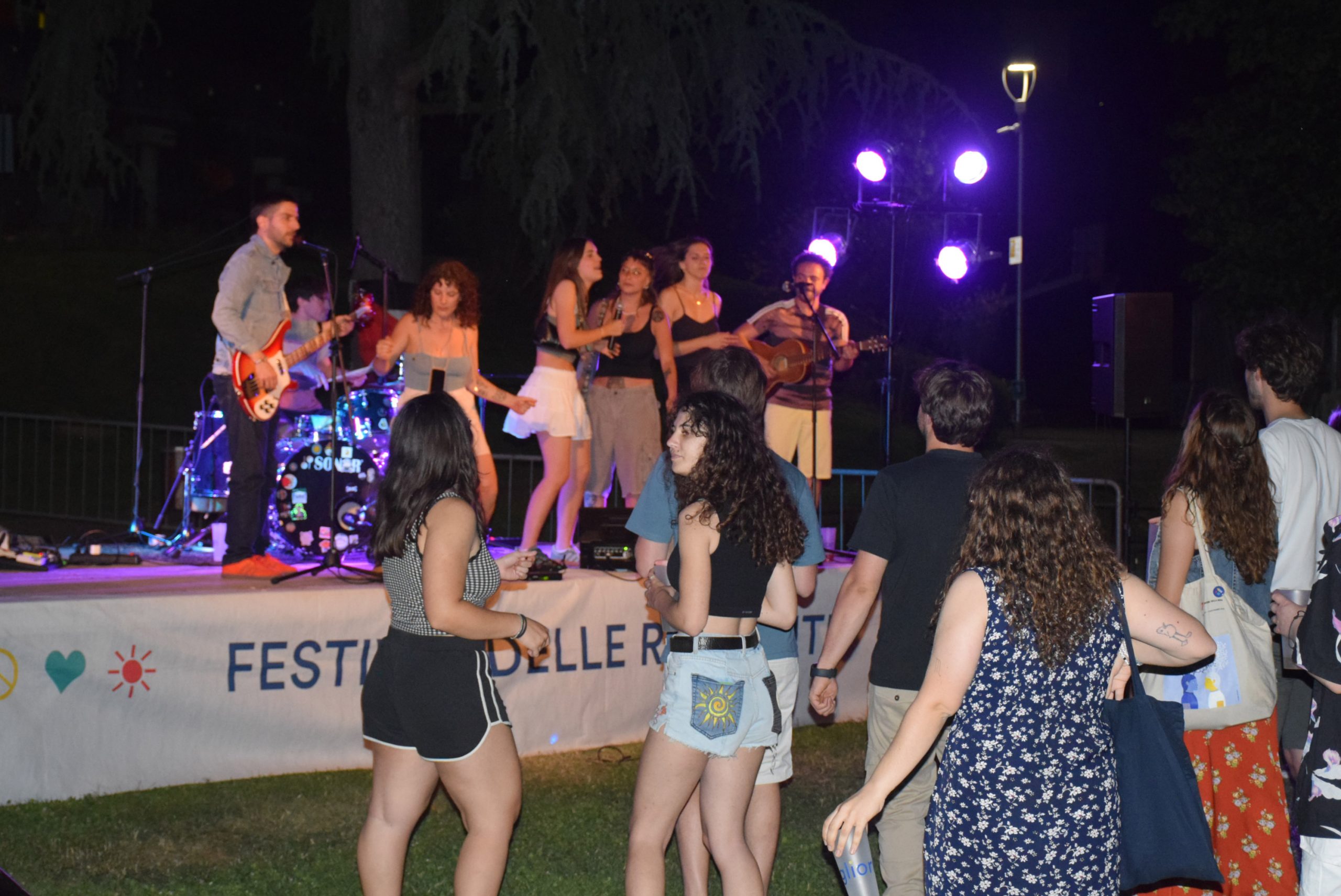 Cala la sera, ci si rinfresca con bevande in bicchieri griffati e sfrigolano i fornelli. Dal palco si sente accordare una chitarra, richiamo per tuttɜ coloro che hanno voglia di musica. Nella line-up, per primi suonano i Natura Storta, eclettica band nembrese che propone rivisitazioni in chiave pop, rock, elettronica.Già sappiamo che sono sempre capaci di scaldare il loro pubblico e quindi, senza pensarci troppo, ci ritroviamo a saltare e ballare sull'erba. A seguire, il format Canta Indie Canta Male unisce tuttɜ per cantare a squarciagola la colonna sonora della nostra generazione, disordinata ma energica. Per concludere la serata, anche la redazione sale imprudentemente sul palco: Non siamo così soli, a immaginare un nuovo giorno in Italia.