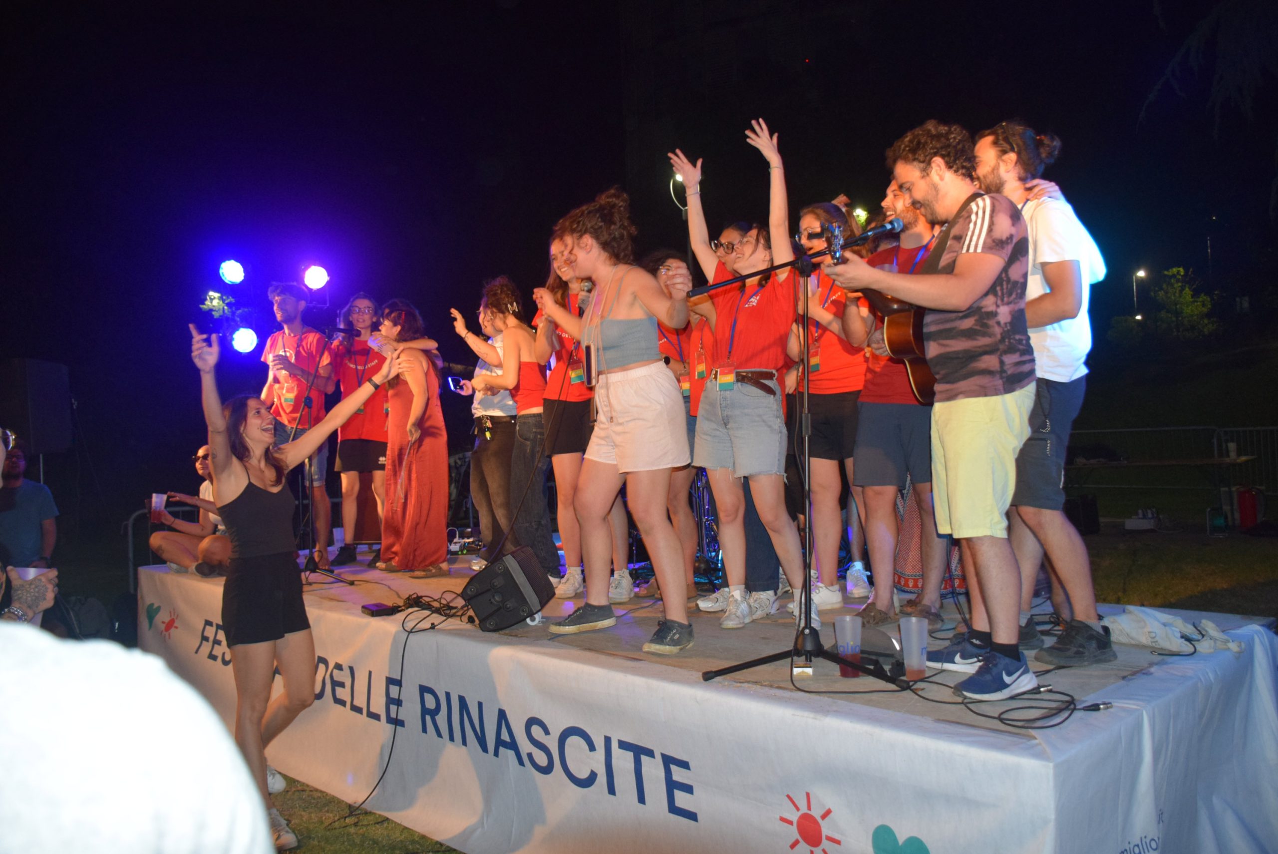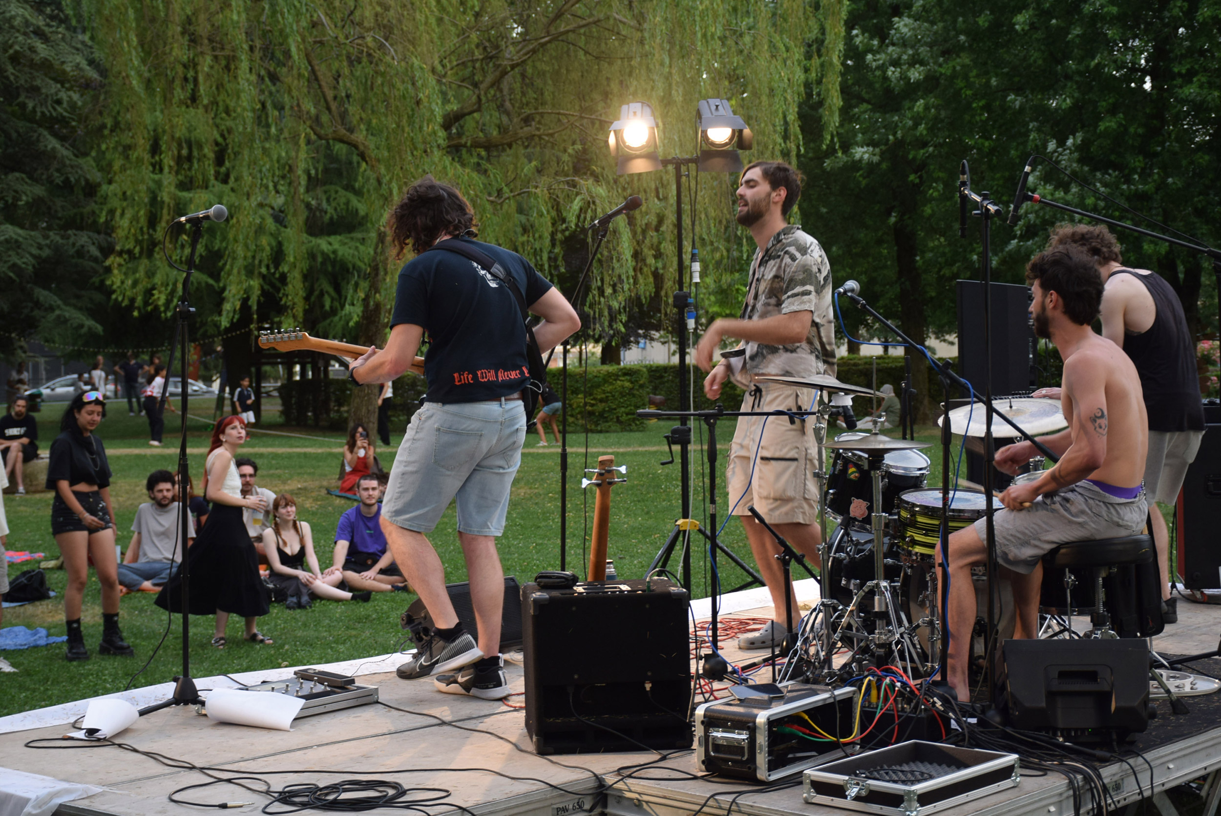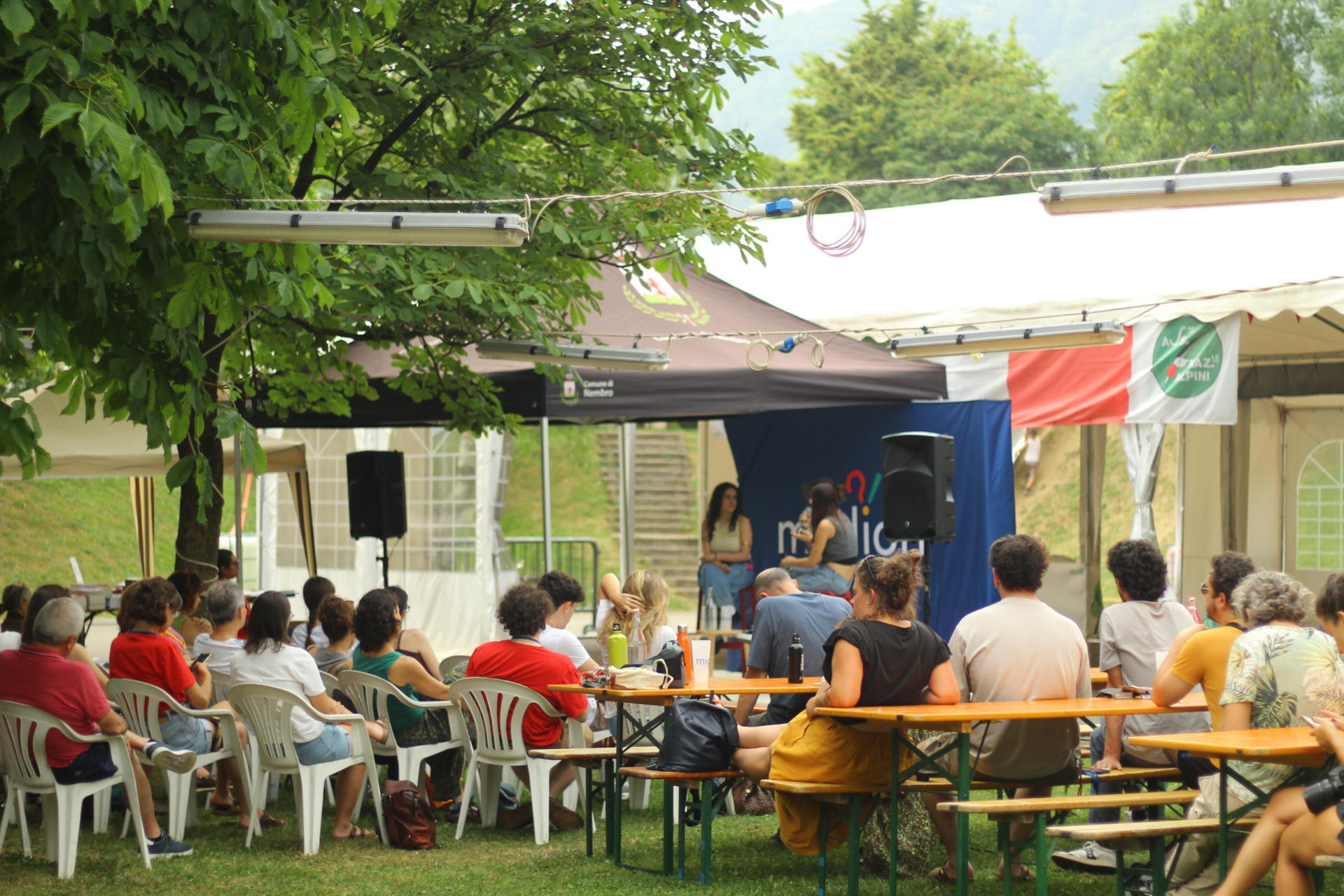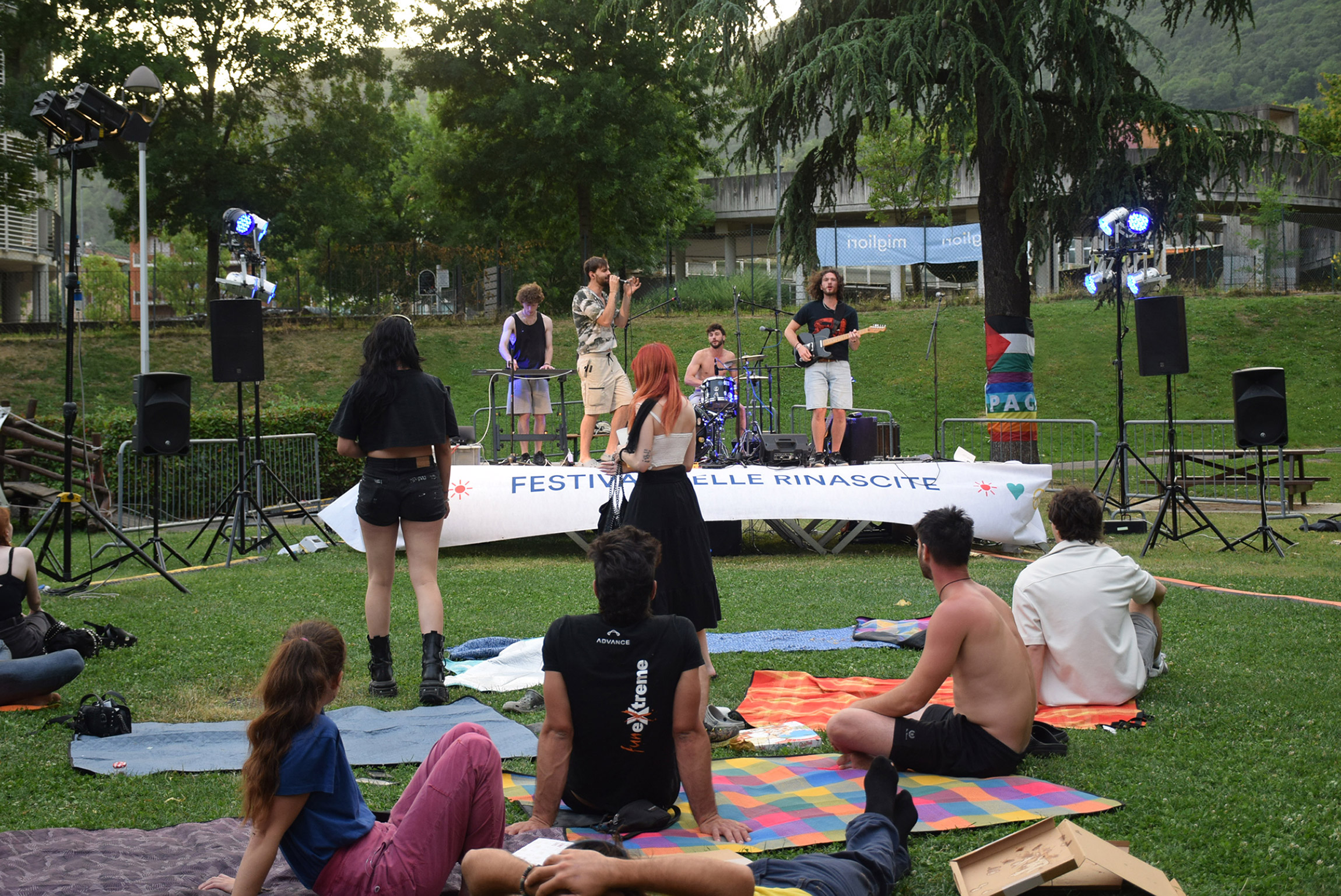 Cala la sera, ci si rinfresca con bevande in bicchieri griffati e sfrigolano i fornelli. Dal palco si sente accordare una chitarra, richiamo per tuttɜ coloro che hanno voglia di musica. Nella line-up, per primi suonano i Natura Storta, eclettica band nembrese che propone rivisitazioni in chiave pop, rock, elettronica.Già sappiamo che sono sempre capaci di scaldare il loro pubblico e quindi, senza pensarci troppo, ci ritroviamo a saltare e ballare sull'erba. A seguire, il format Canta Indie Canta Male unisce tuttɜ per cantare a squarciagola la colonna sonora della nostra generazione, disordinata ma energica. Per concludere la serata, anche la redazione sale imprudentemente sul palco: Non siamo così soli, a immaginare un nuovo giorno in Italia.