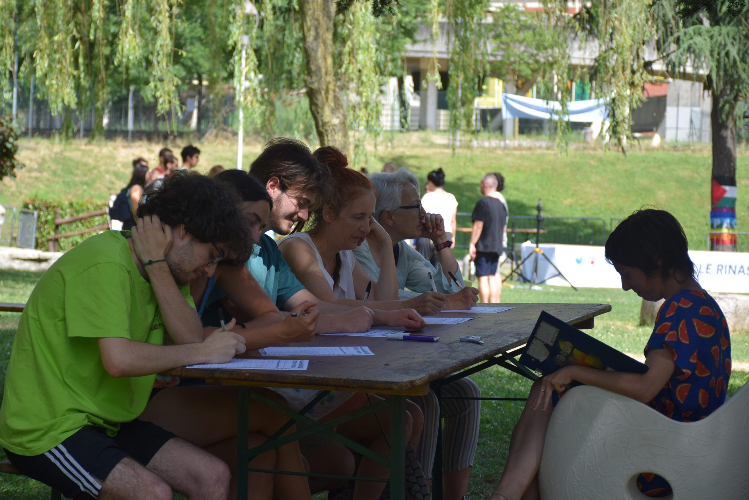 Le conferenze del sabato pomeriggio vedono due protagoniste: Valeria Verdolini, nell'arsura del tendone, ma con tanta attenzione e con la stessa passione che pone nelle sue battaglie con Antigone, ci ha mostrato le fatiche e le assurdità dell'abitare il carcere; Martina Micciché, invece, all'ombra degli alberi, ci ha parlato di marginalità e sessismo urbano. Poco lontano, gli stand delle associazioni Amici della Biblioteca, Femministe nella Foresta, Game Master e Whylab si presentano allɜ passanti del Parco.